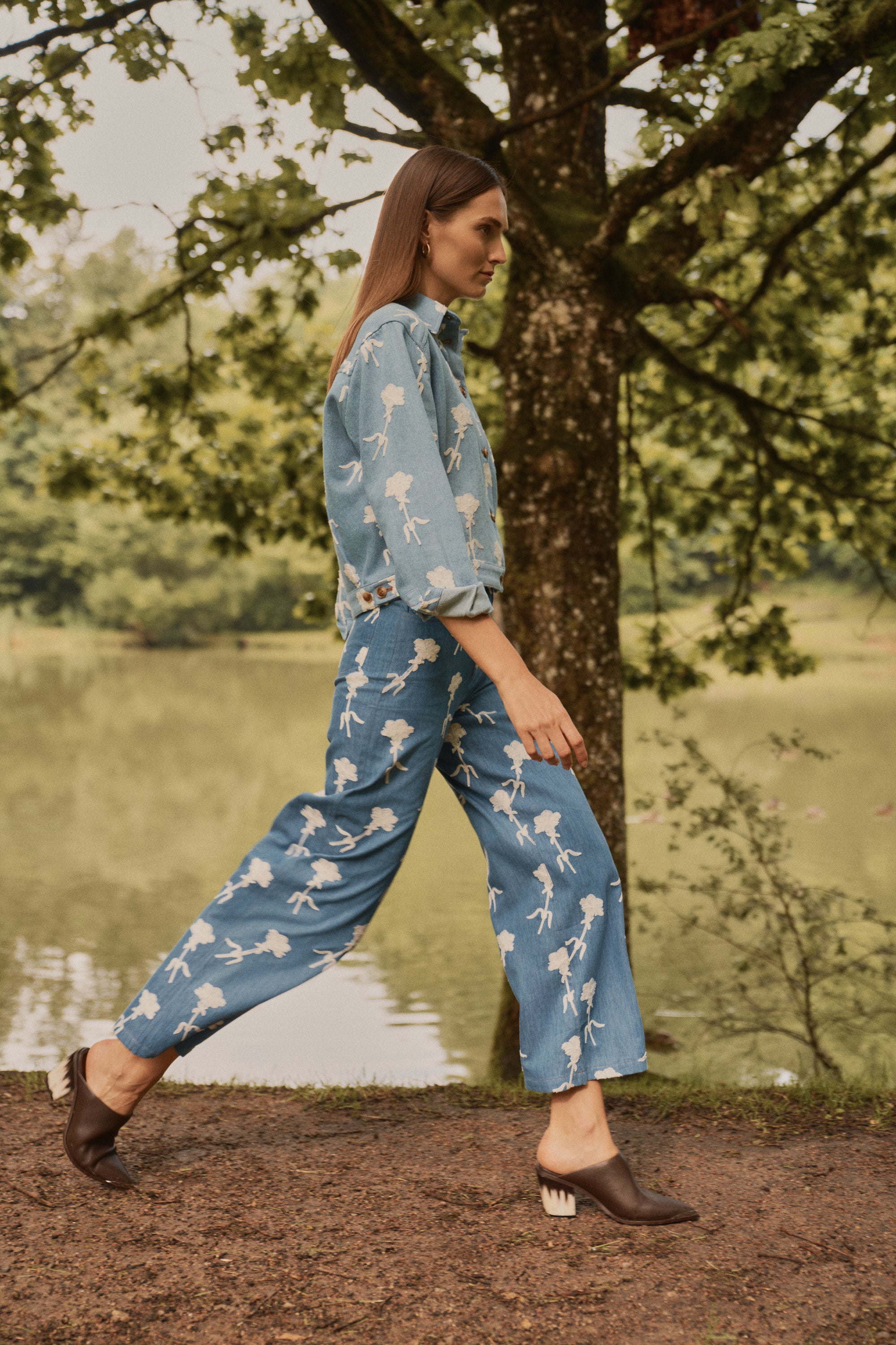 Pantalón de tencel en tono índigo con claveles blancos bordados. De corte amplio y tiro alto, y con bolsillos laterales que lo convierten en una prenda cómoda y funcional para el día a día.