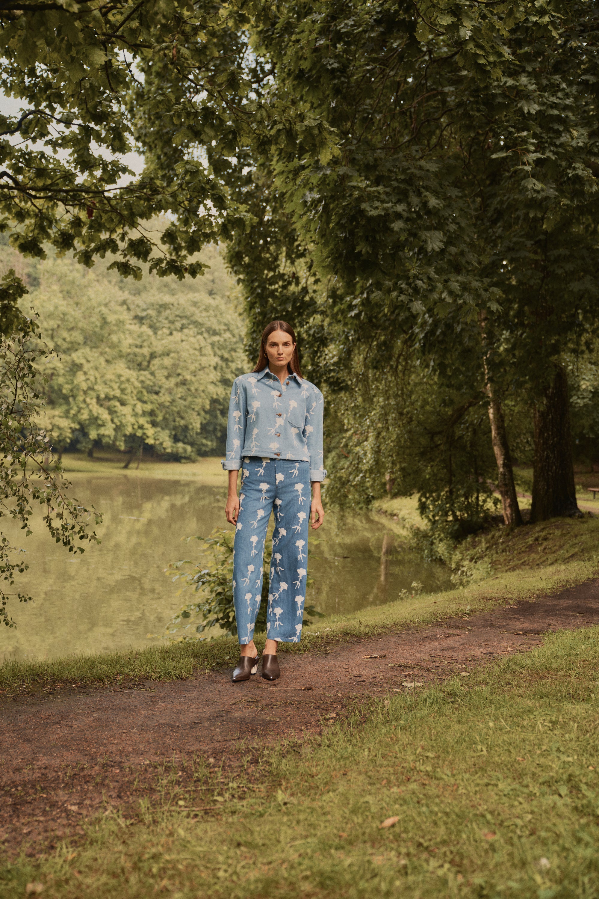 Ligero y fluido, estiliza la silueta gracias a la amplitud de la pierna y a la caída natural del tejido. Es una pieza versátil que funciona por sí sola con camisetas y camisas básicas, pero alcanza su máxima expresión en conjunto con la chaqueta vaquera bordada con claveles, creando un total look coordinado lleno de estilo y profesionalidad.