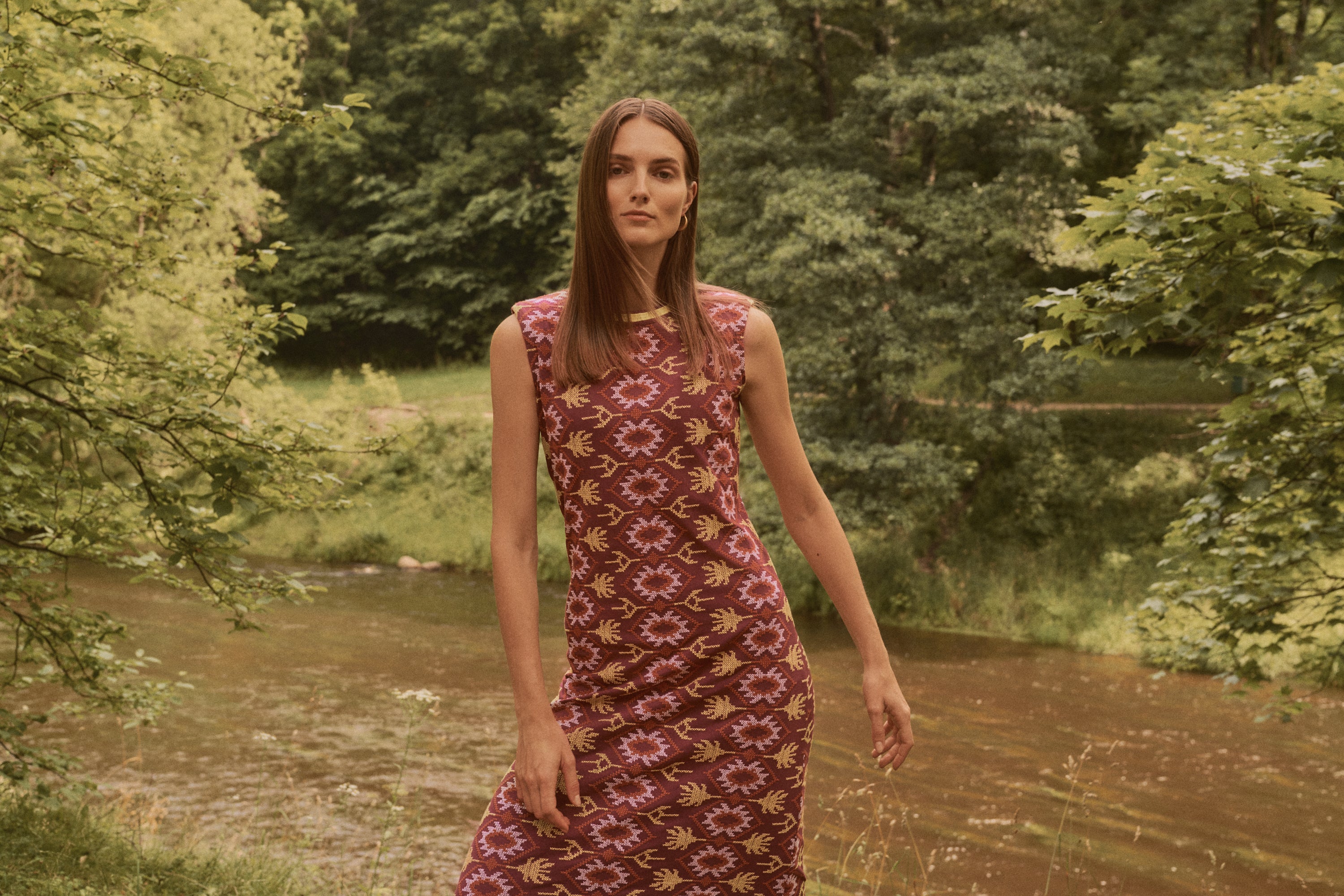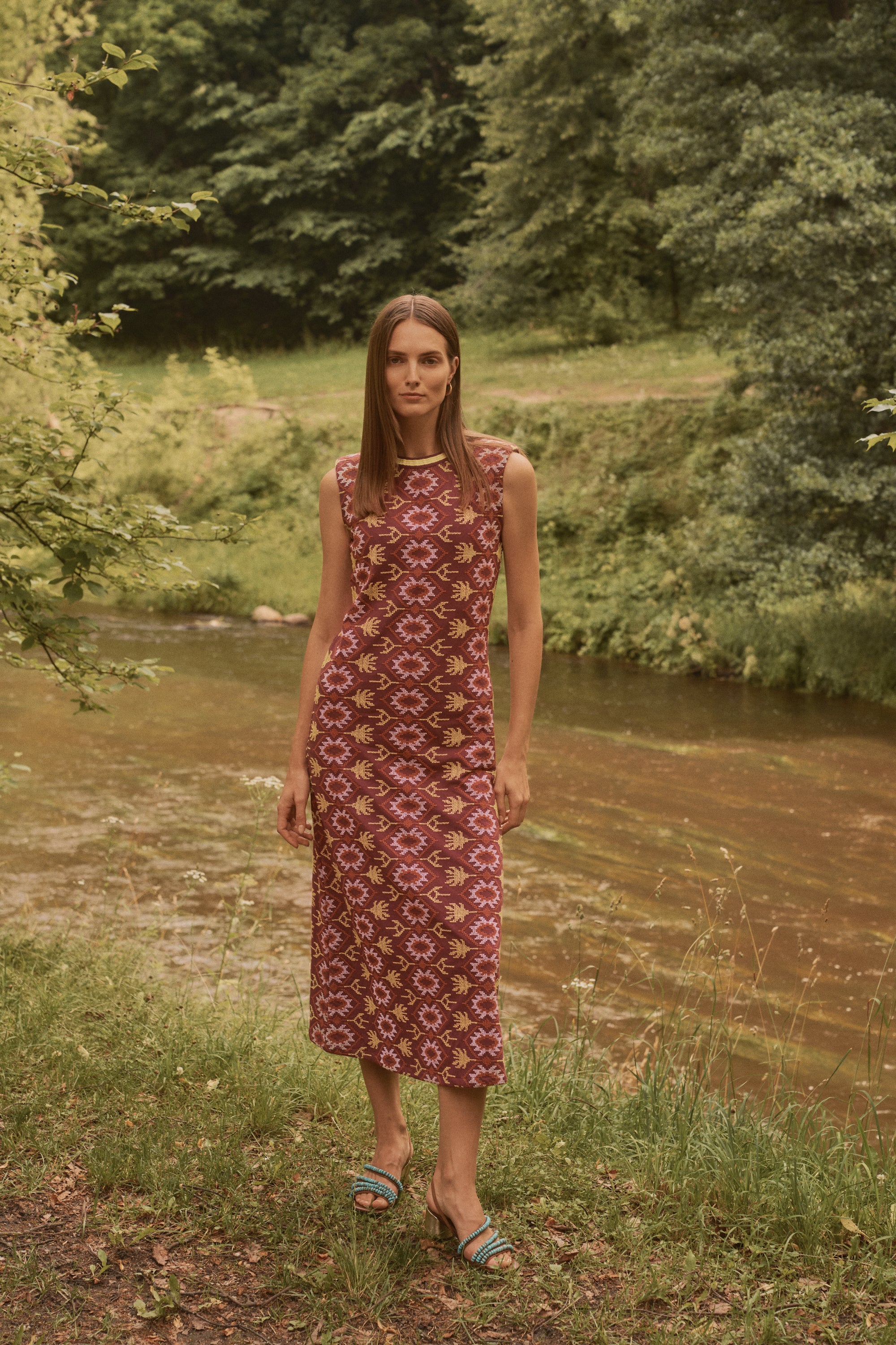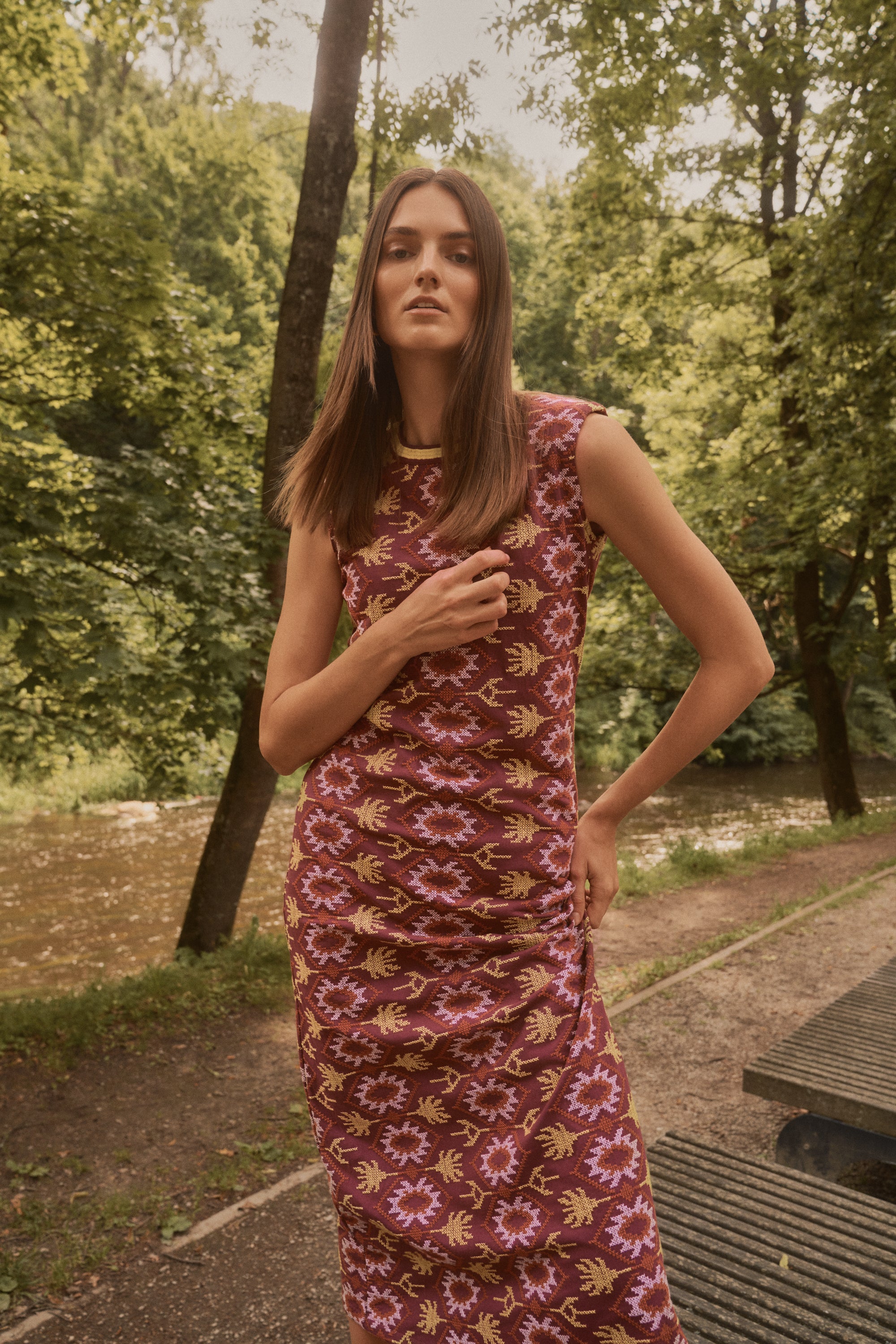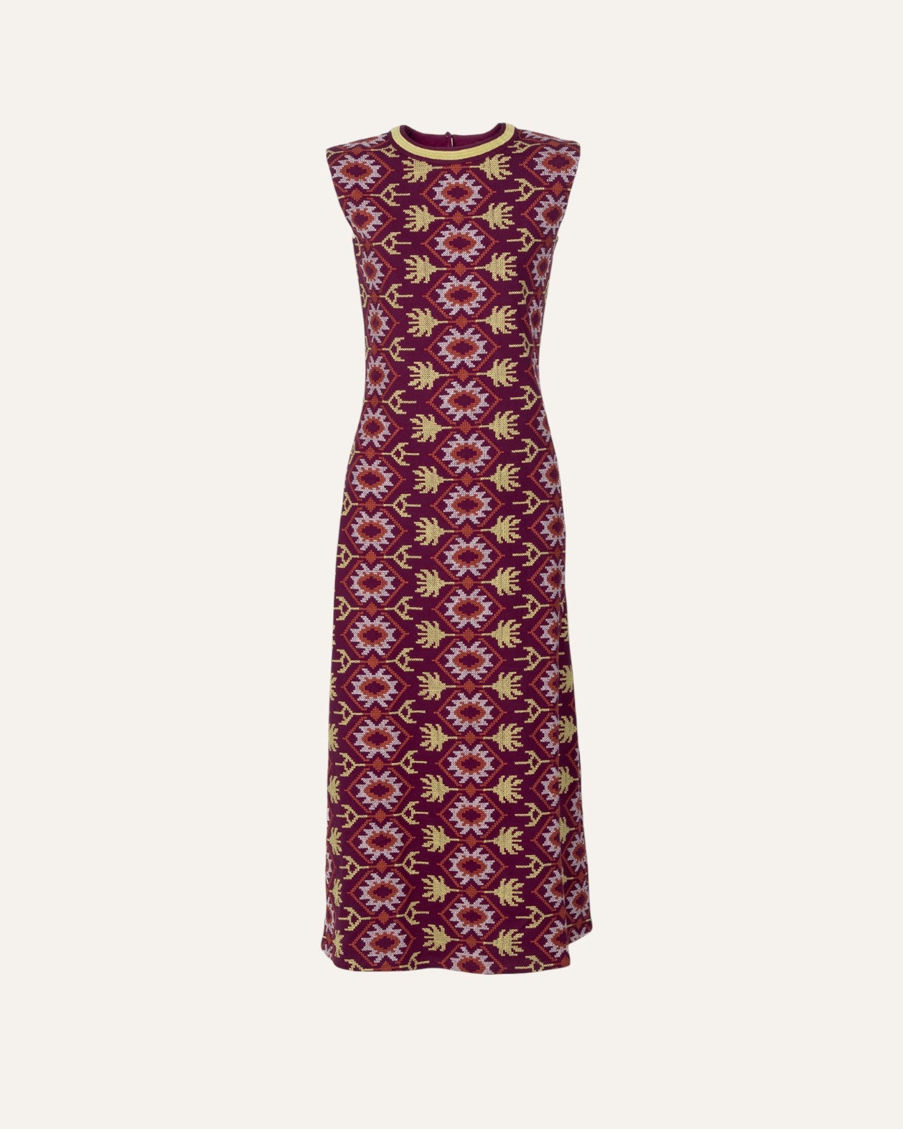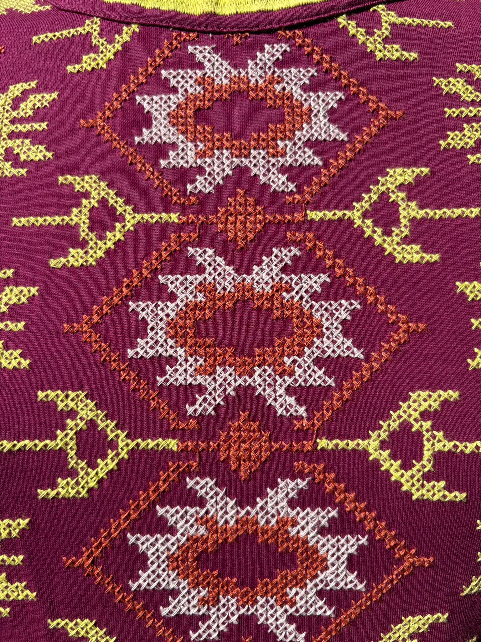 Vestido midi de color rosa oscuro con bordado en punto de cruz. De corte recto, sin mangas y cuello redondo rematado con bordado amarillo a contraste . Su bordado de punto de cruz en tonos burdeos, amarillo y blanco aporta textura y toque romántico convirtiéndolo en una pieza especial y reconocible dentro de la colección.