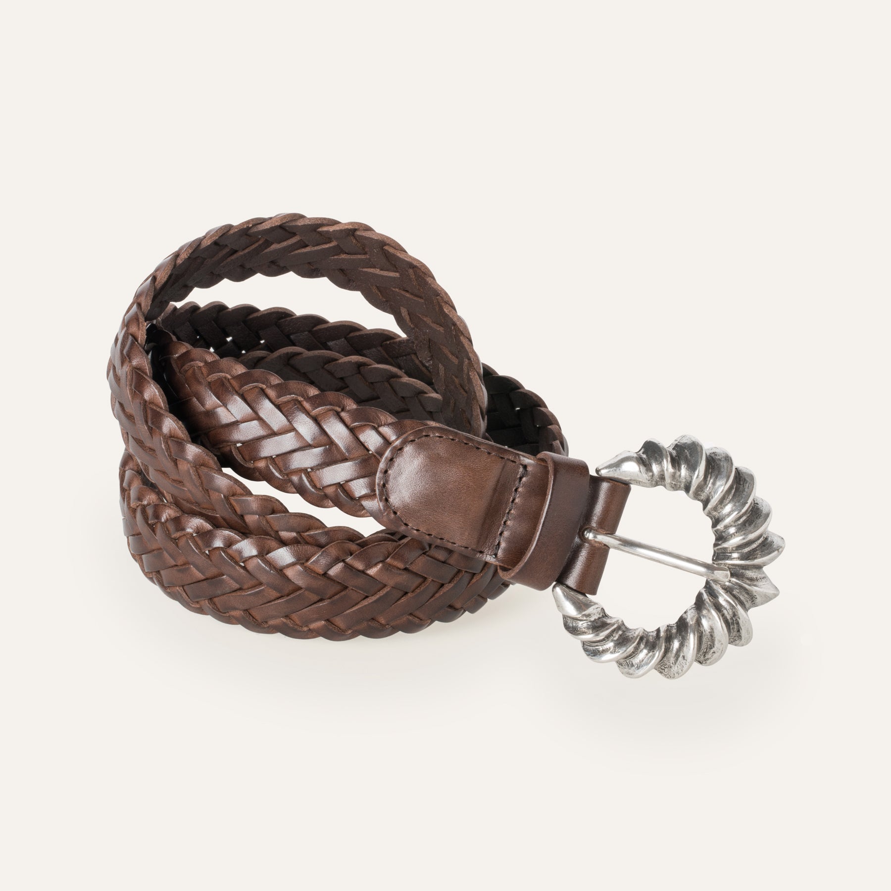 Cinturón trenzado de piel en tono marrón caoba, realizado en España por expertos artesanos de la piel. Su acabado pulido y la hebilla labrada lo convierten en una pequeña joya. Atemporal y con personalidad. Perfecto para dar un toque refinado a cualquier look.
