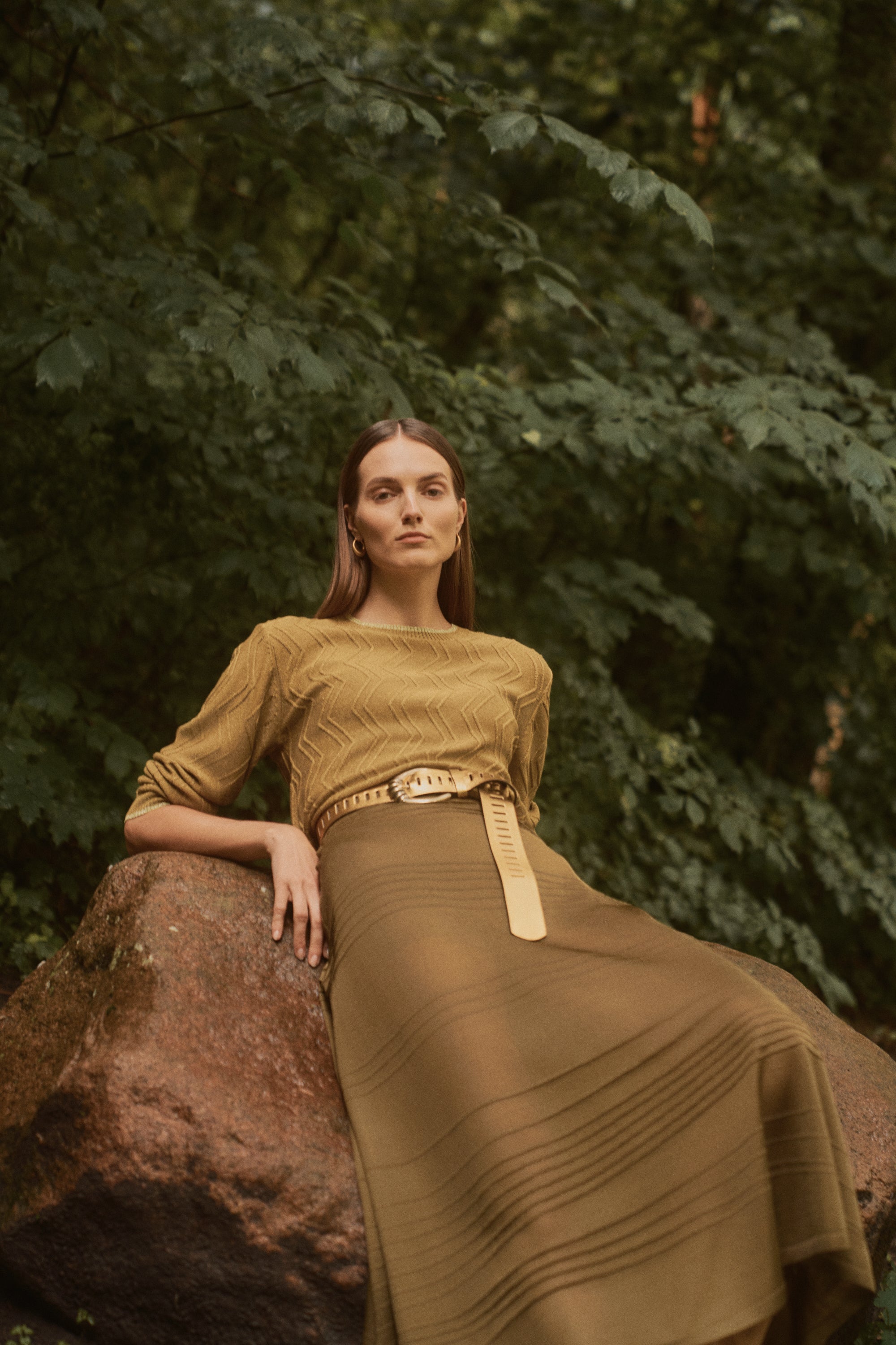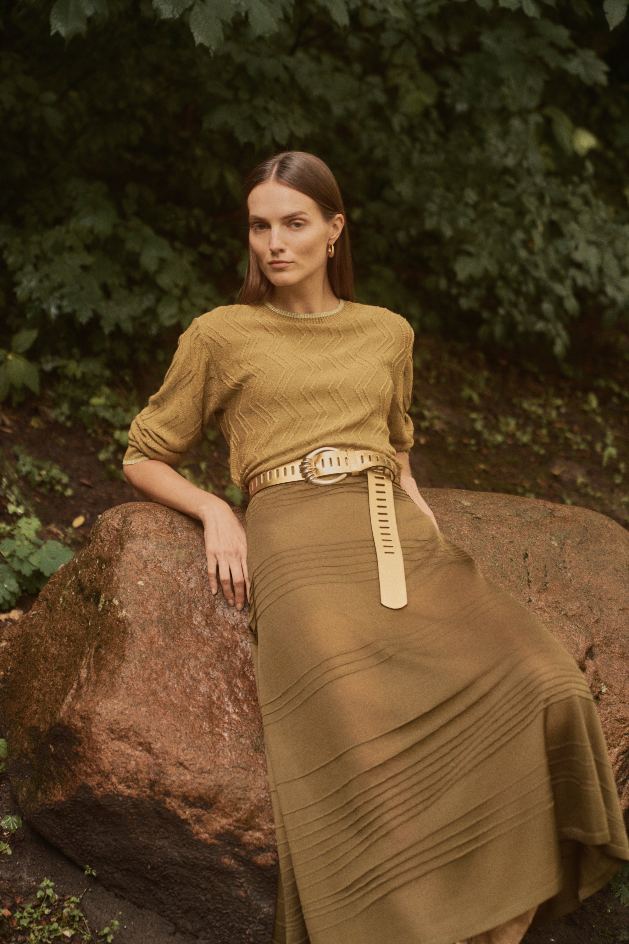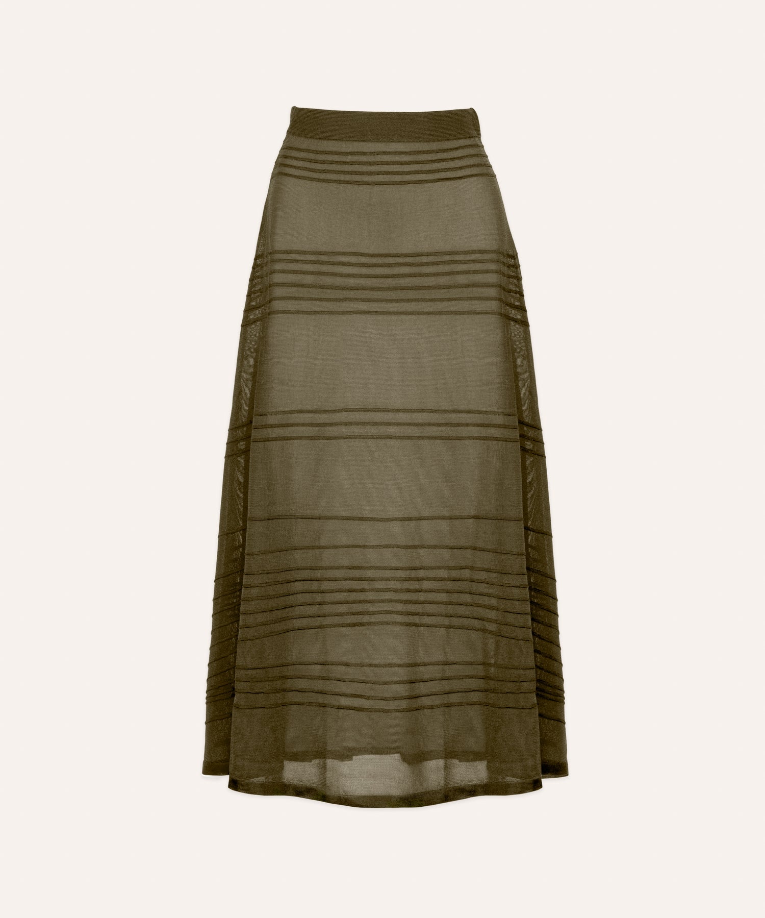 Falda midi confeccionada en punto semitransparente color verde oliva , con rayas asimétricas en relieve. Si no te gustan las transparencias el forro en tono nude evita que el tejido se adhiera al cuerpo y asegura una caída impecable que se adapta bien a distintas siluetas, suavizando el contraste de transparencias con un acabado refinado.