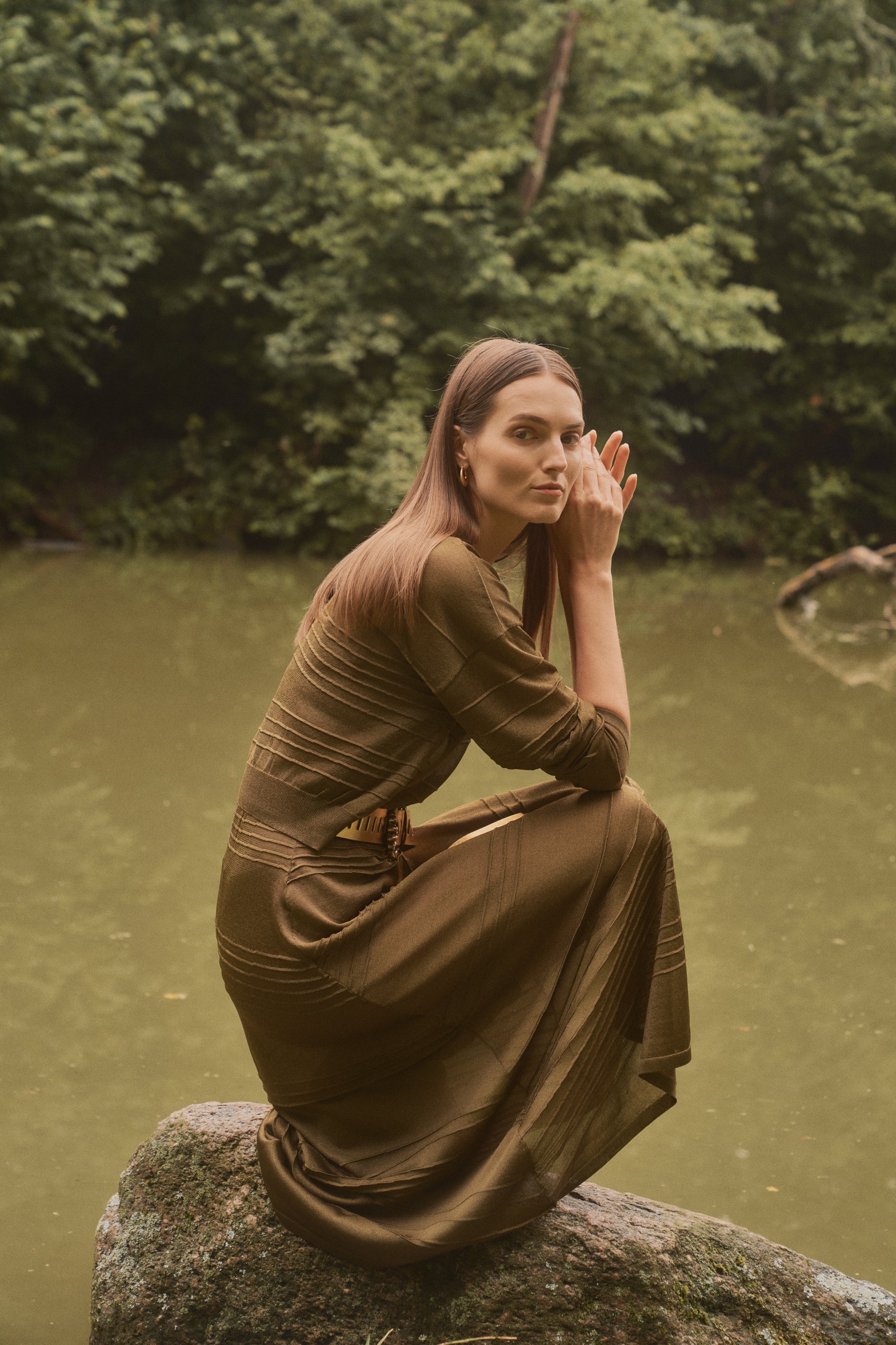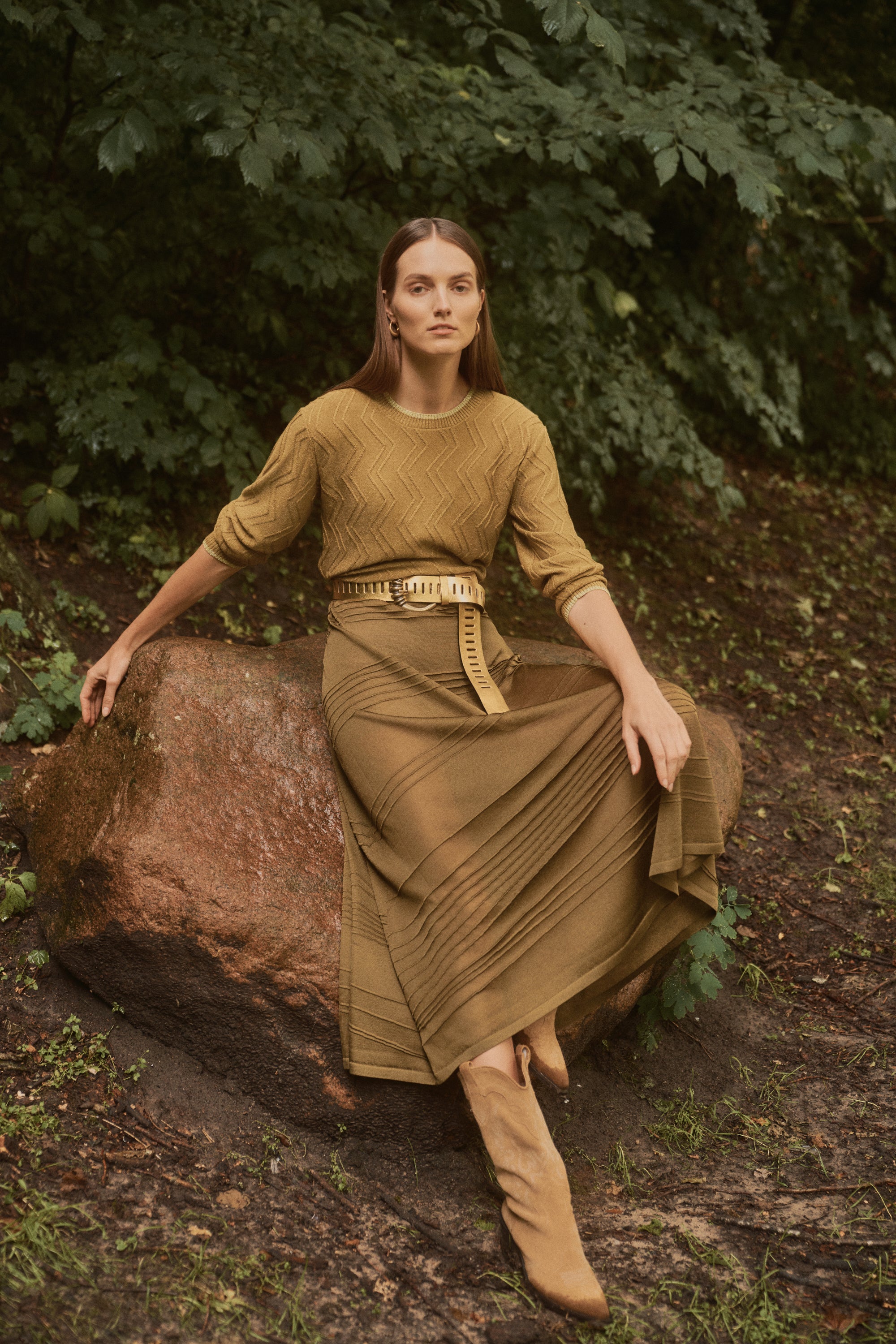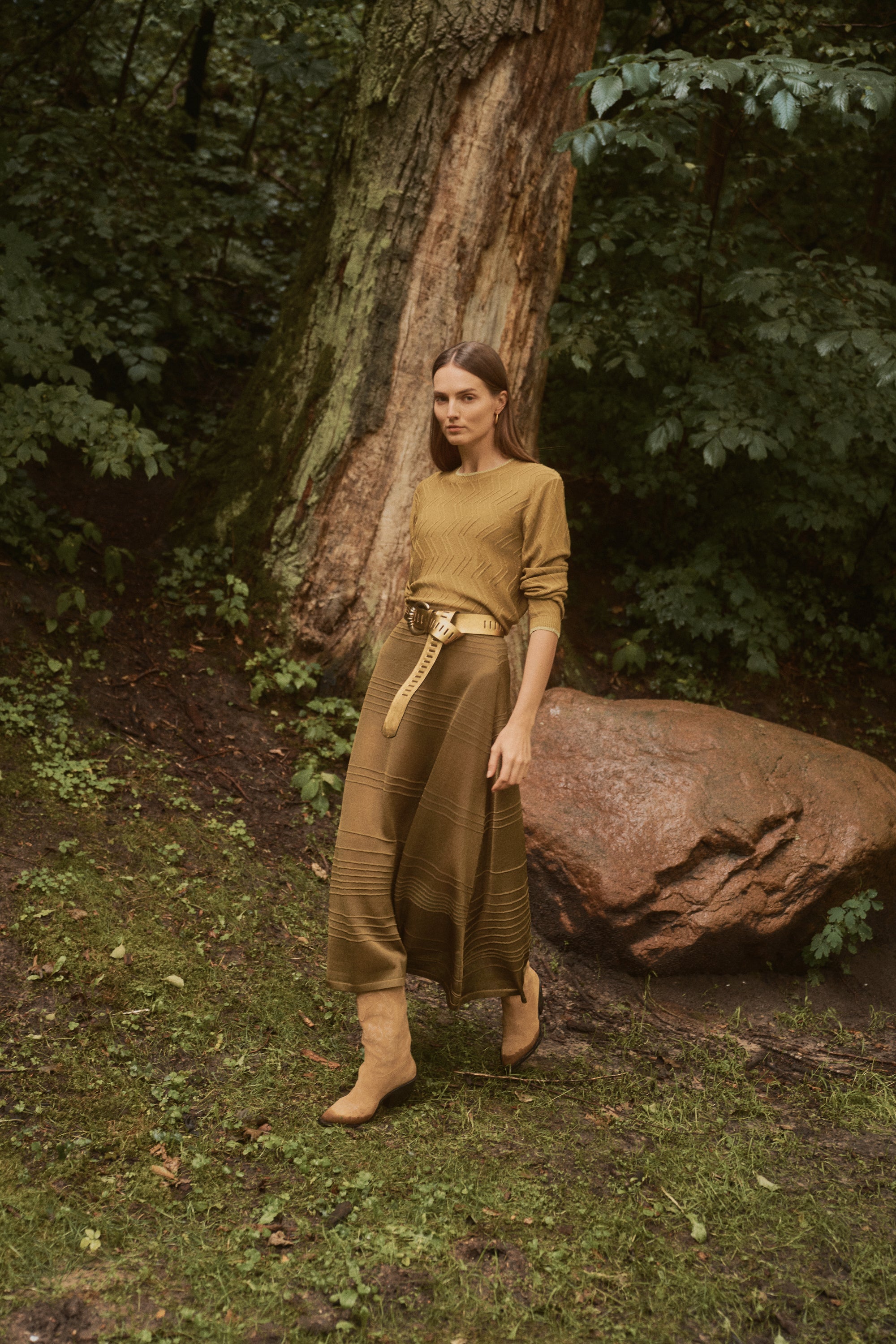 Falda midi confeccionada en punto semitransparente color verde oliva , con rayas asimétricas en relieve. Si no te gustan las transparencias el forro en tono nude evita que el tejido se adhiera al cuerpo y asegura una caída impecable que se adapta bien a distintas siluetas, suavizando el contraste de transparencias con un acabado refinado.