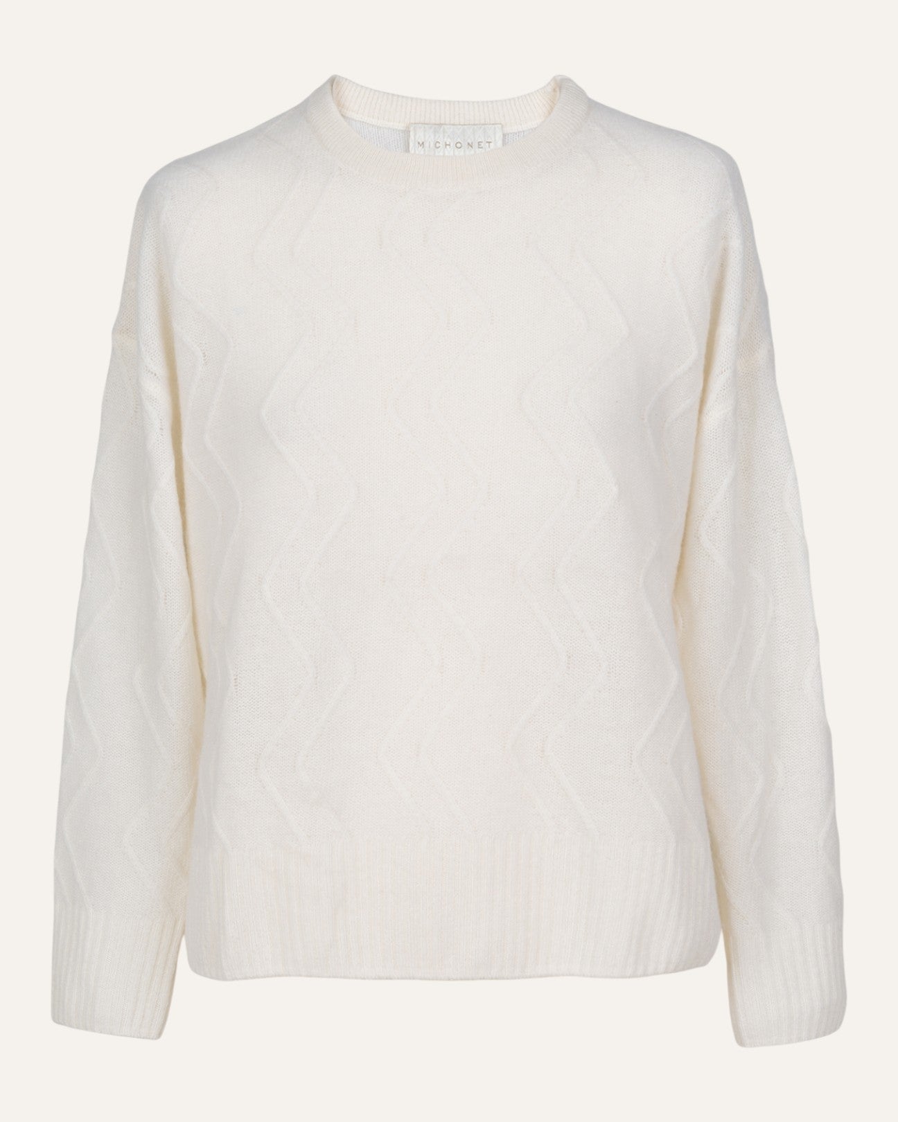 Uno de nuestros imprescindibles este invierno es nuestro jersey 100% cashmere en color blanco roto con nuestro icónico relieve en zigzag al tono.