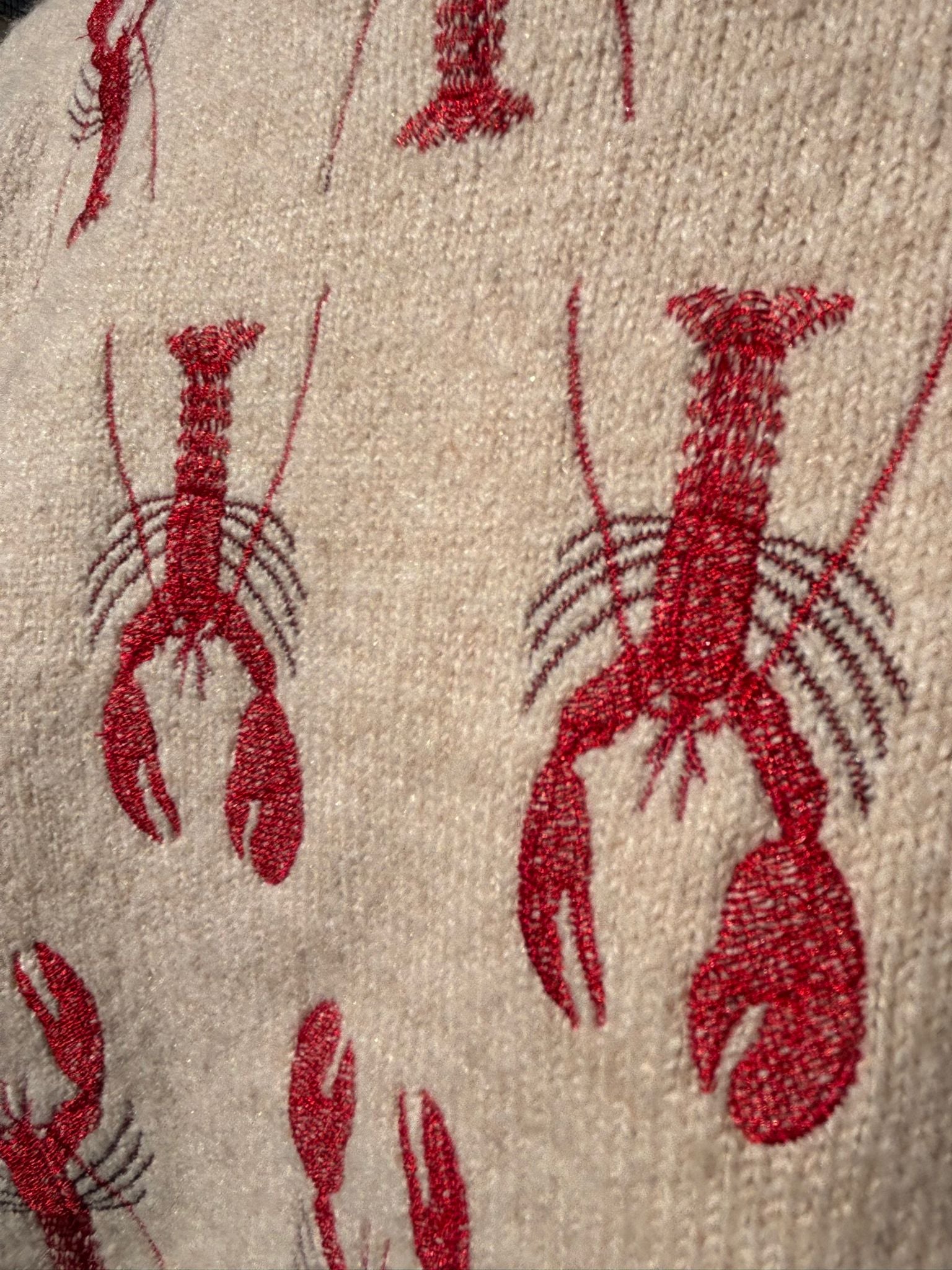 Jersey de punto en color arena con bordados de langostas en rojo.