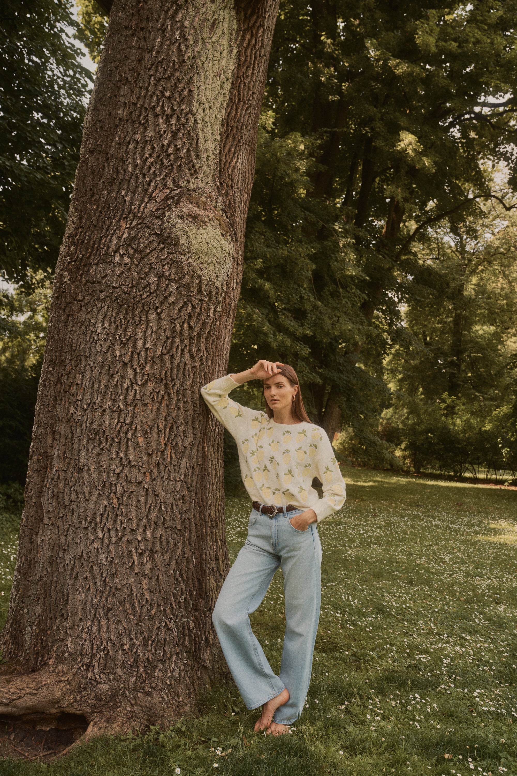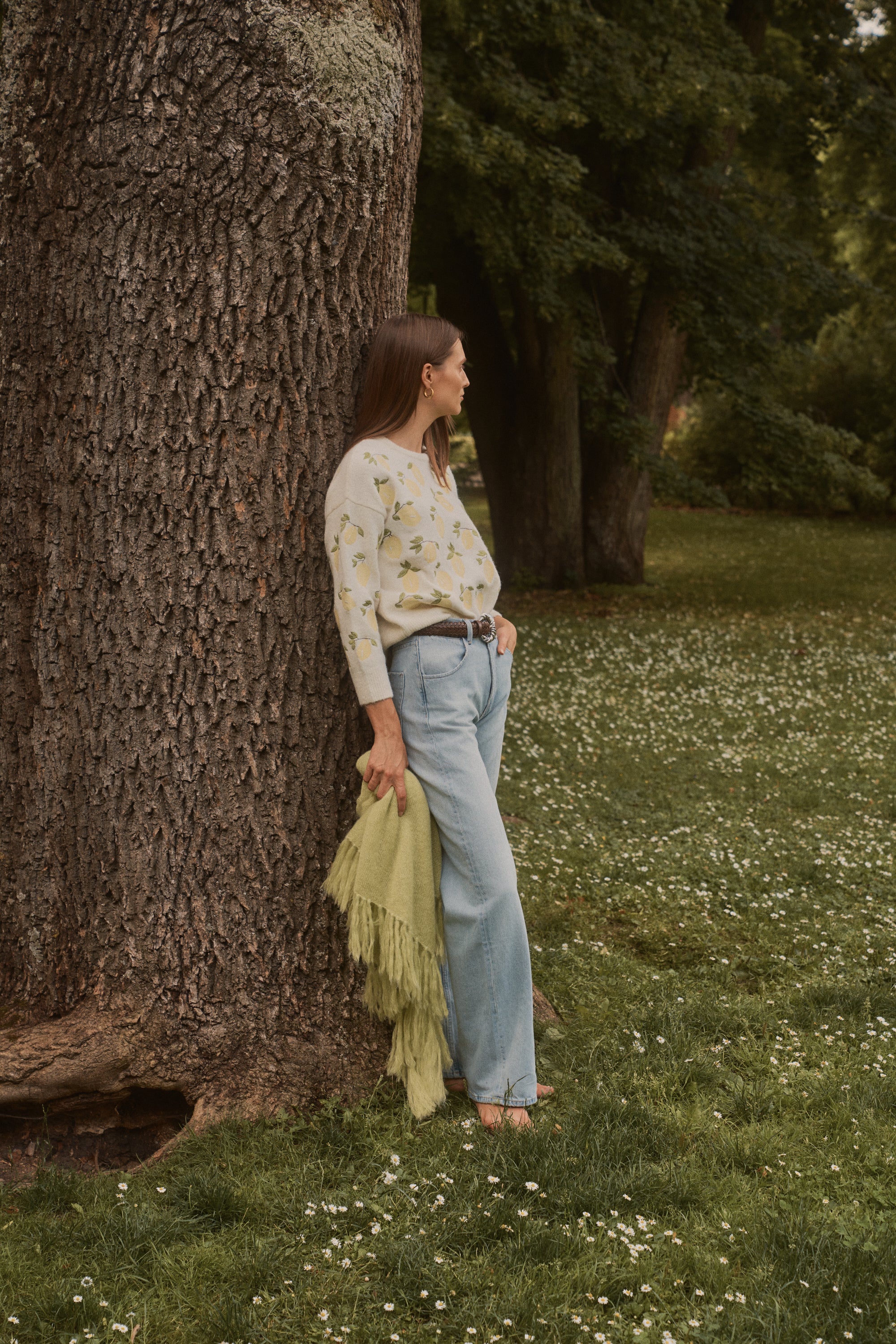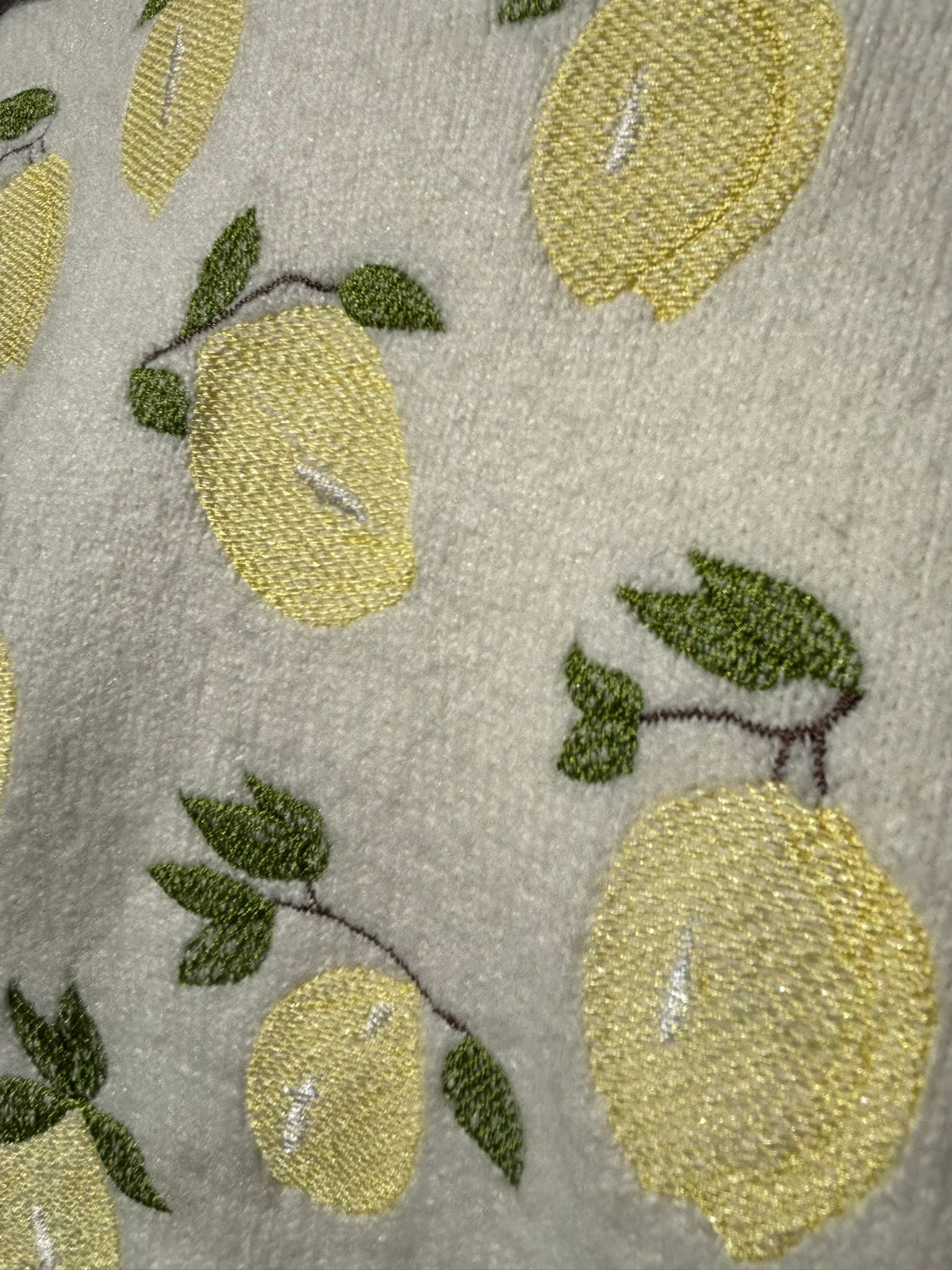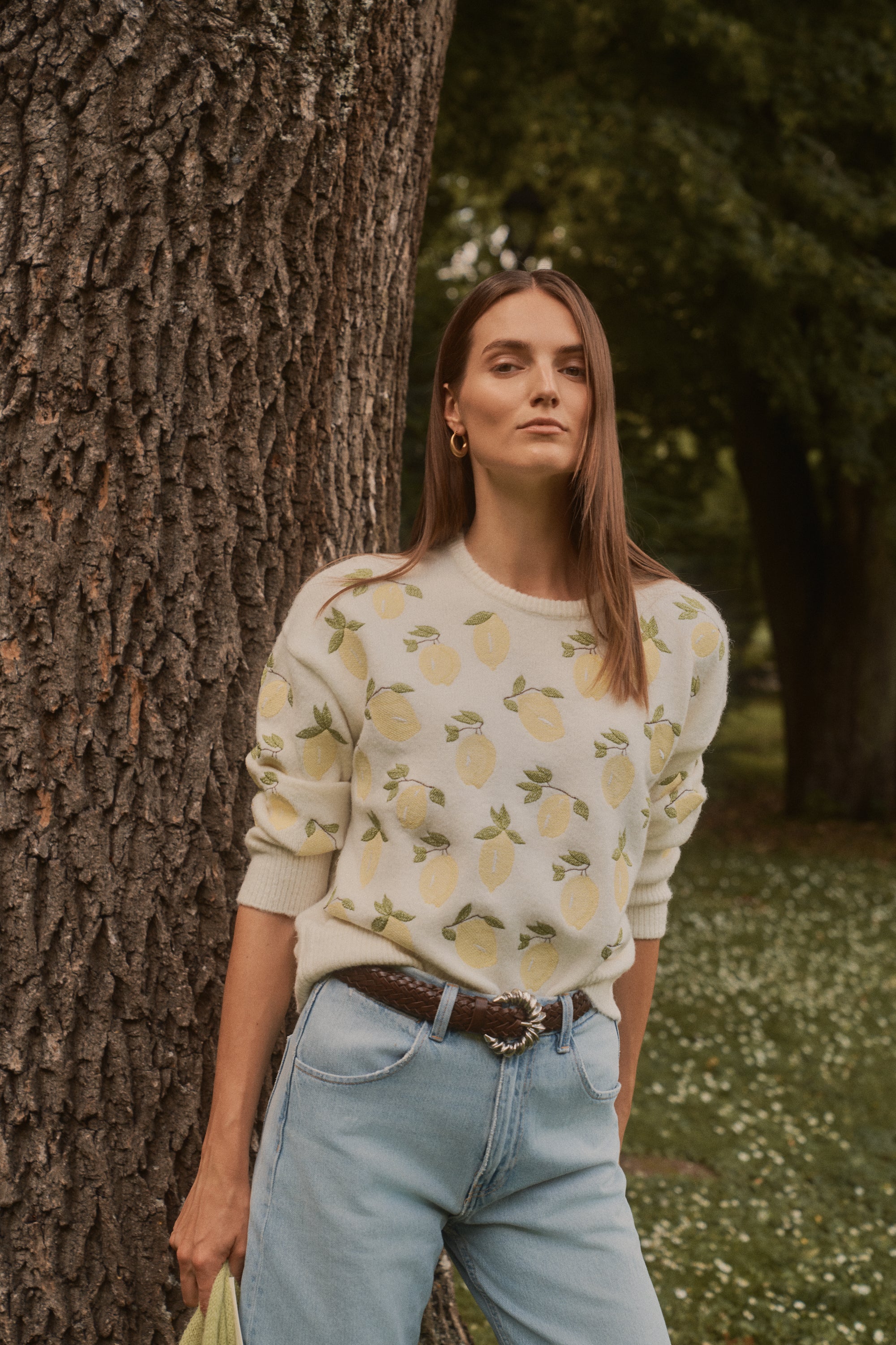 El contraste fresco de los limones bordados añade un aire luminoso y optimista, perfecto para dar personalidad a un look casual.
