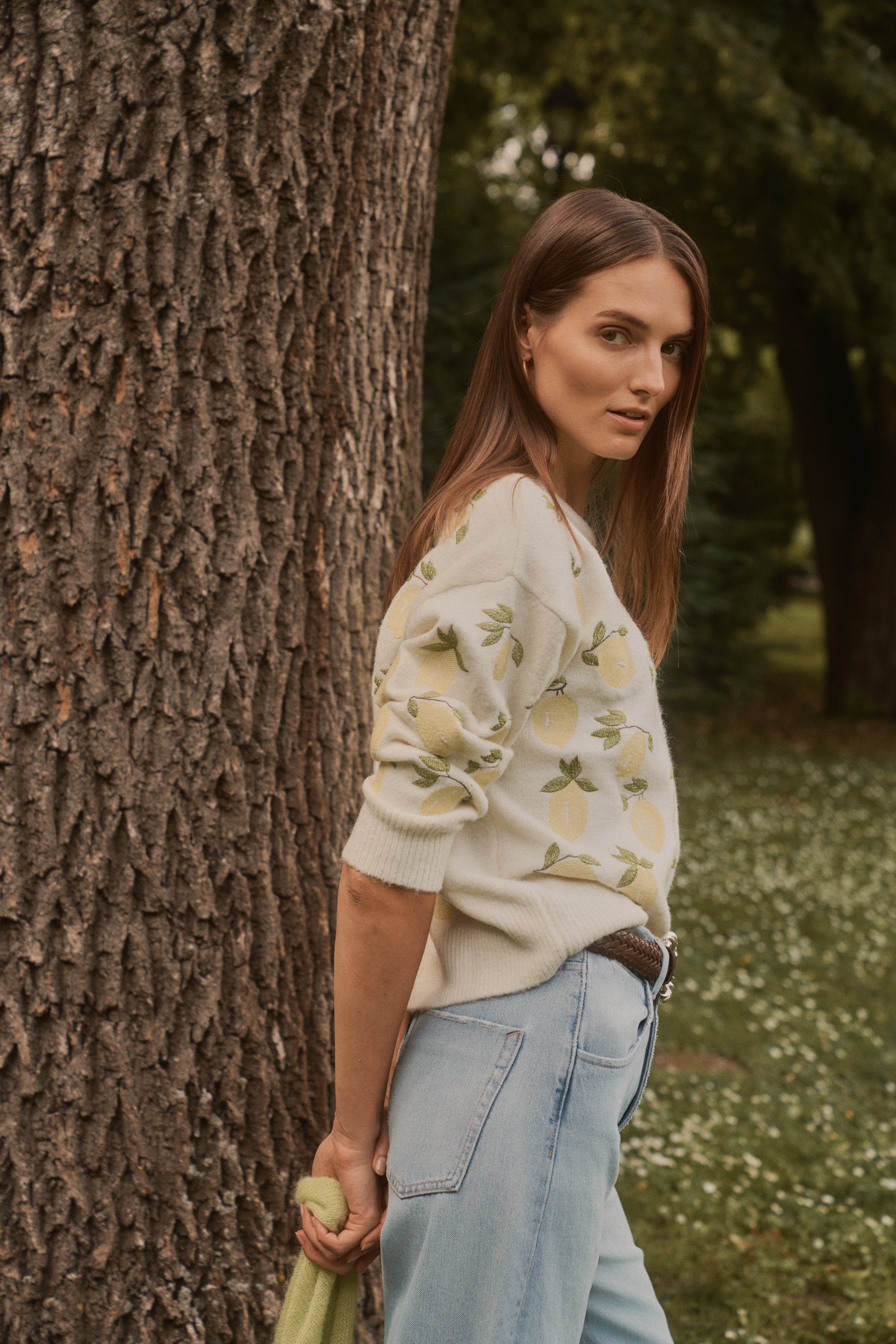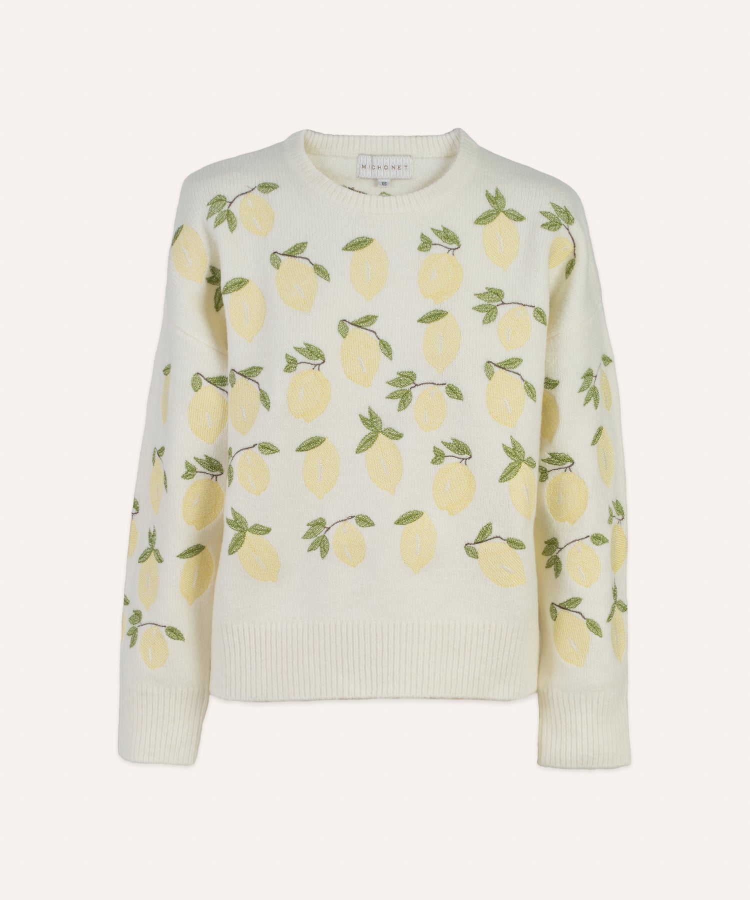 El toque de frescura mediterránea viene con nuestro jersey de punto en tono crudo con bordados de limones en amarillo y verde.