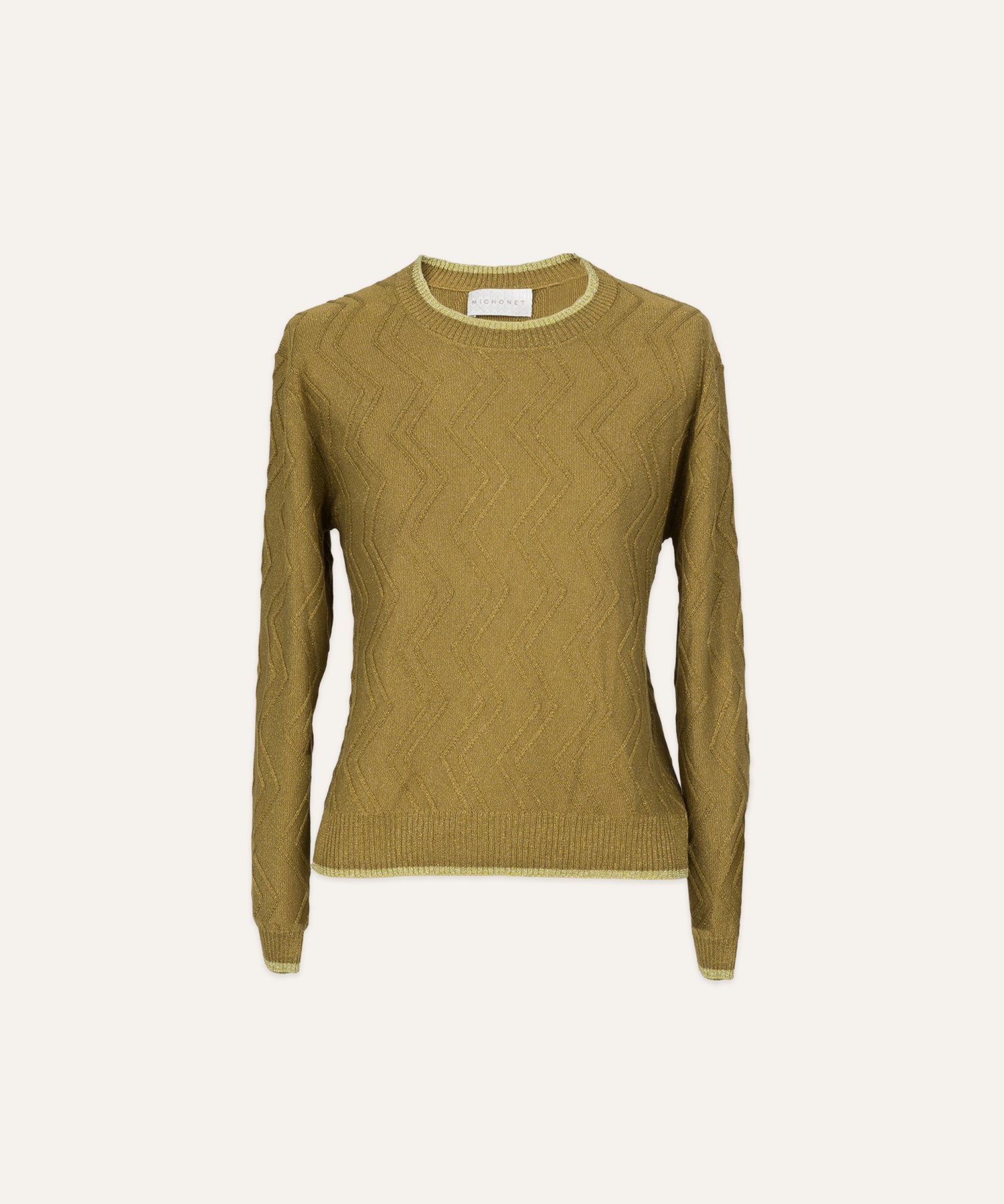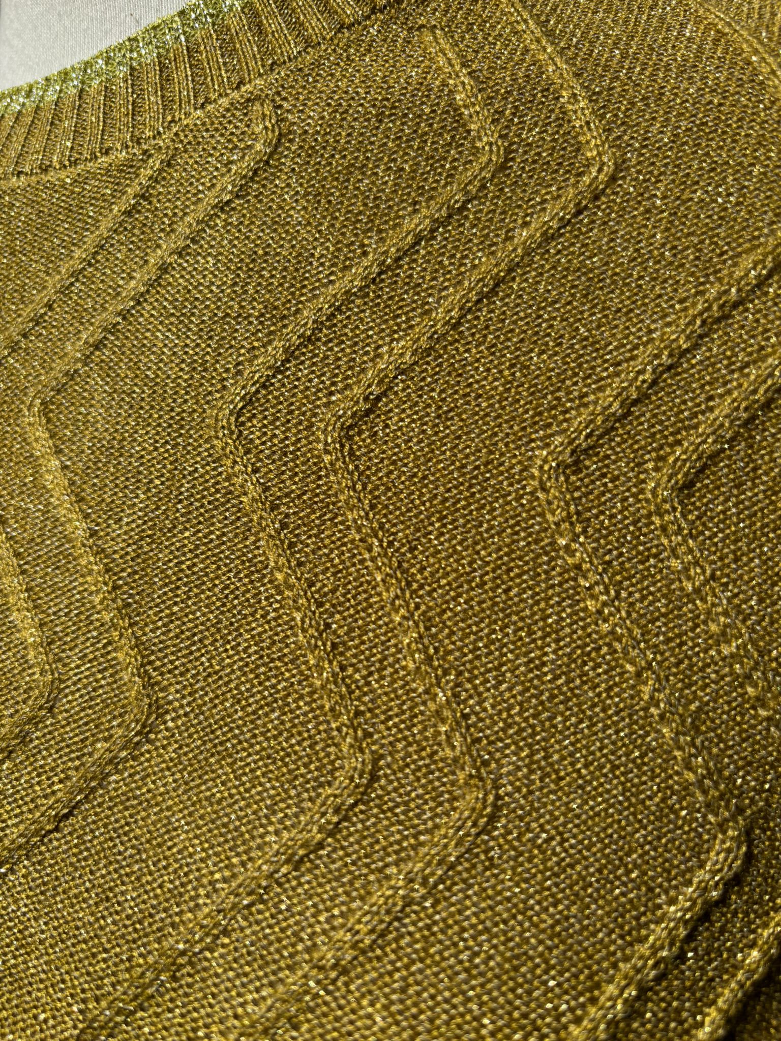 El tejido tiene un ligero destello de lurex al tono. Acabado en cuello, mangas y bajo con un ribete en lurex a contraste.