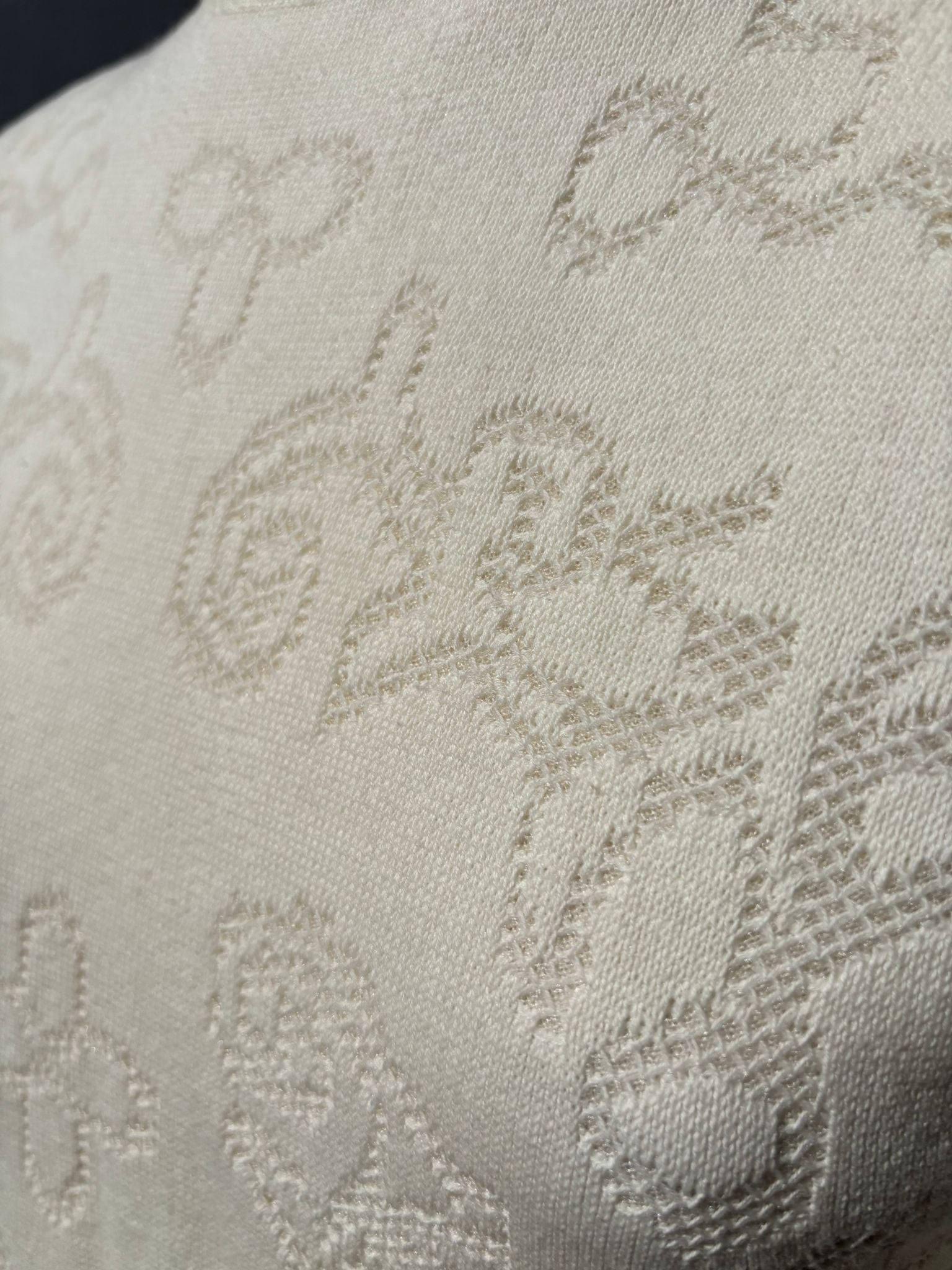 Su diseño ornamental en jacquard, con motivos geométricos y florales semitransparentes, aporta textura y profundidad.