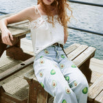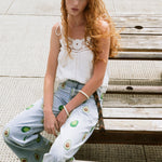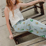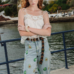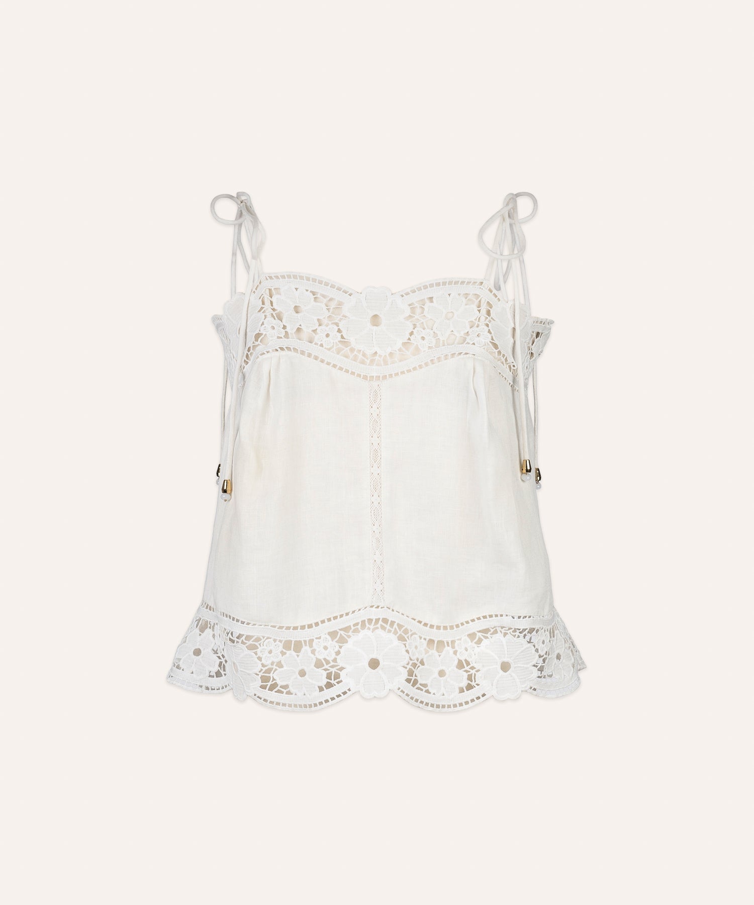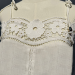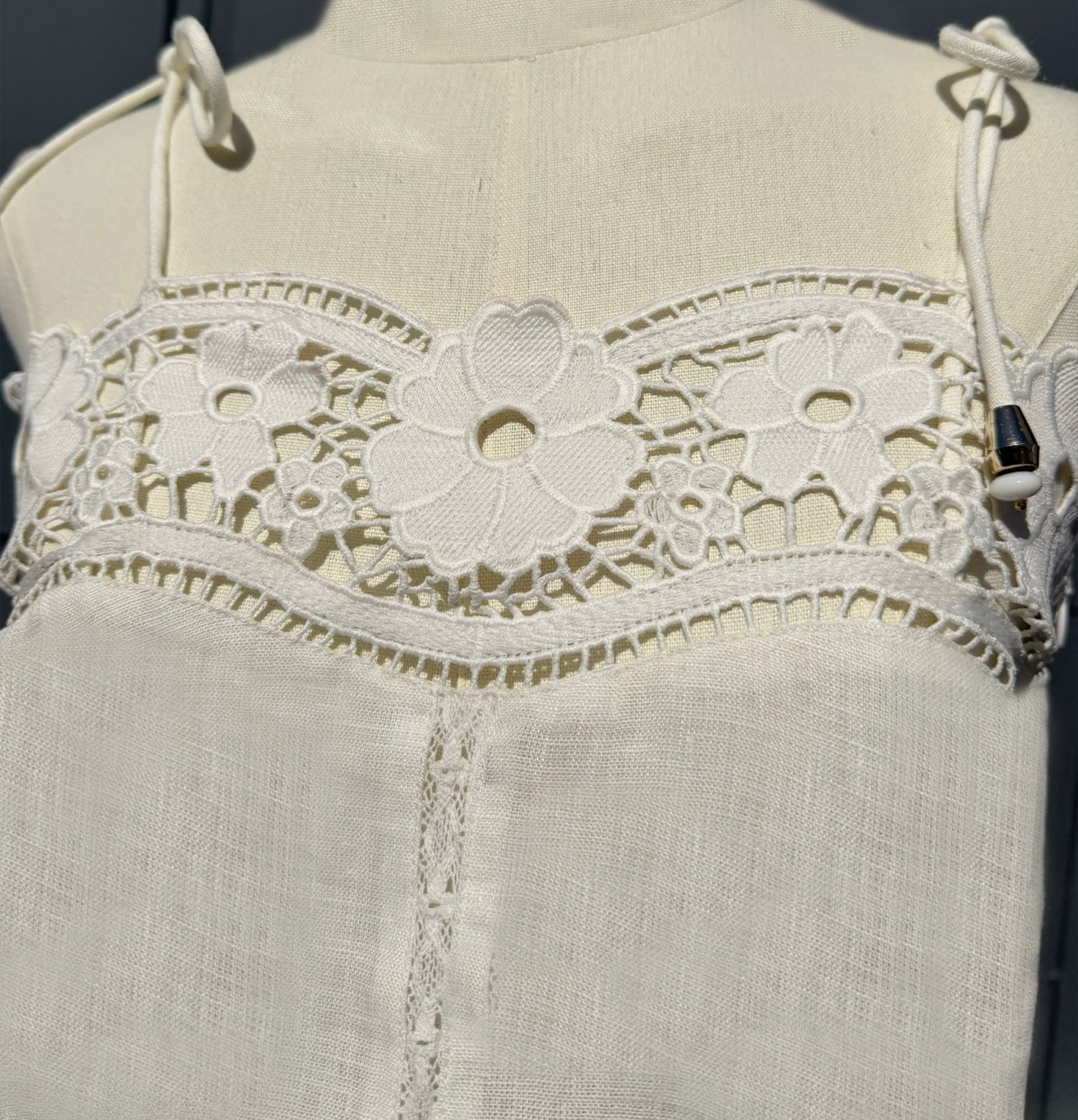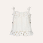 Top de lino en color blanco roto con tirantes ajustables, confeccionado en tejido ligero y natural. El escote y el bajo están trabajados con festón calado y bordado floral con vainicas, creando un delicado juego de transparencias y relieve.