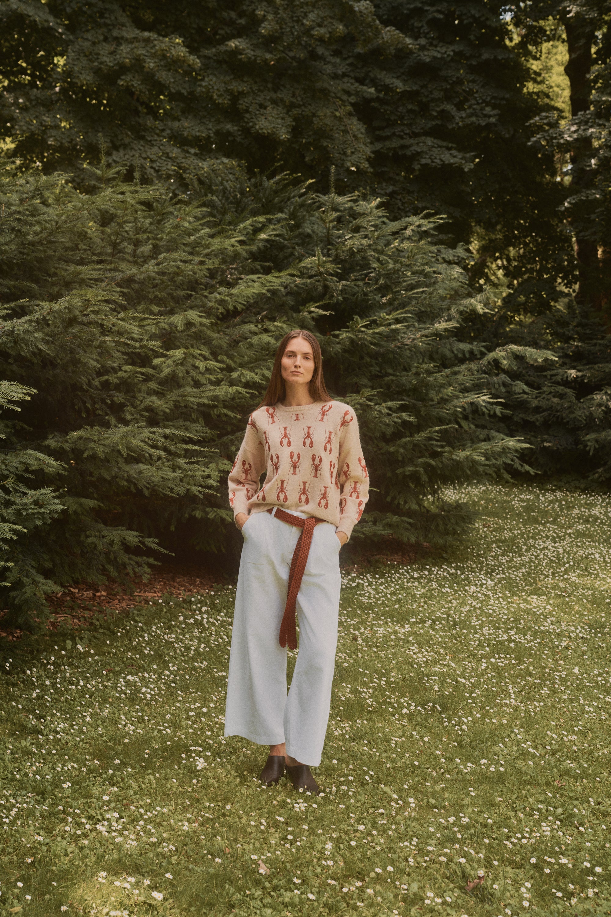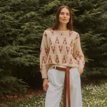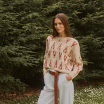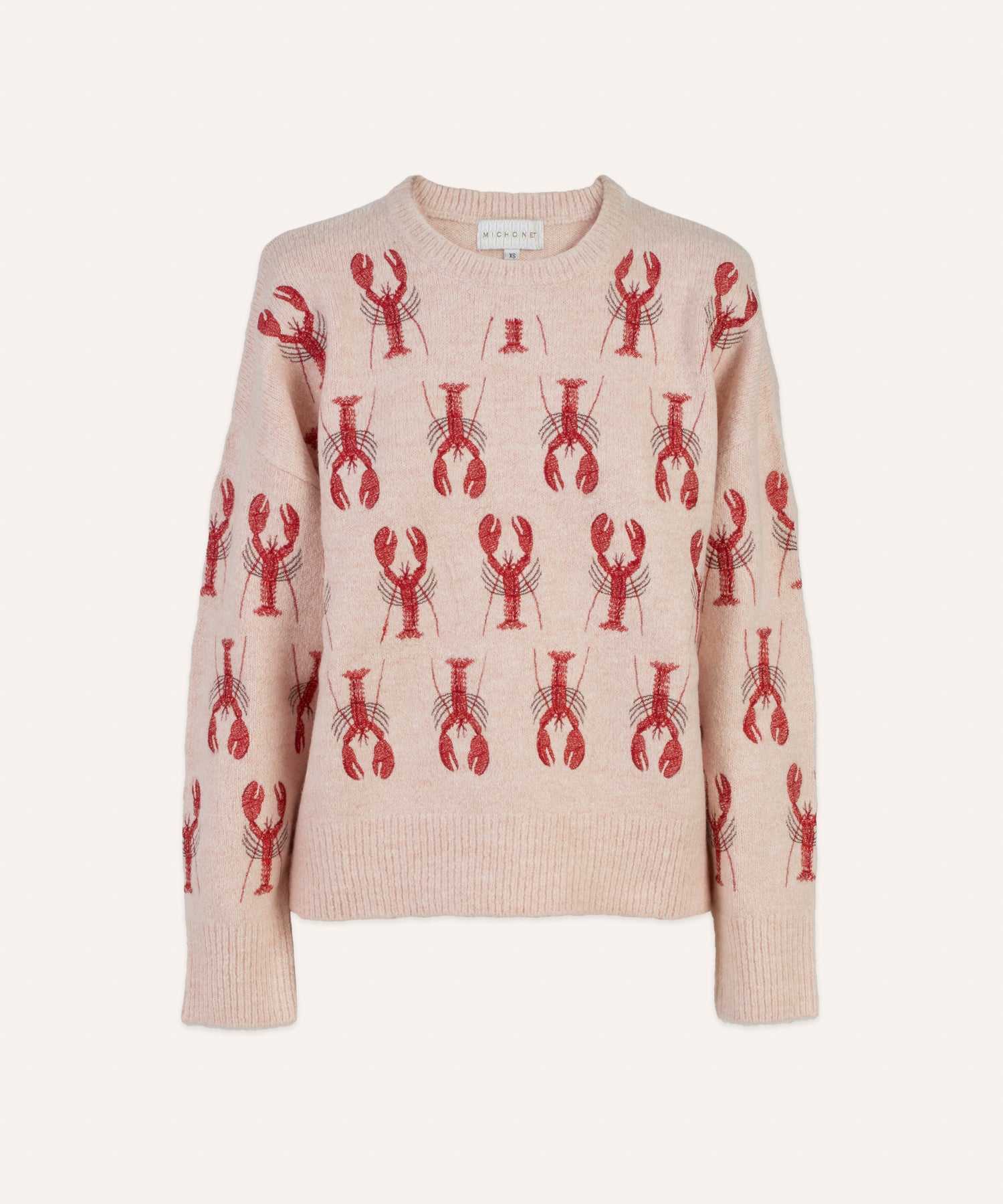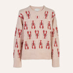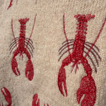 Jersey de punto en color arena con bordados de langostas en rojo.