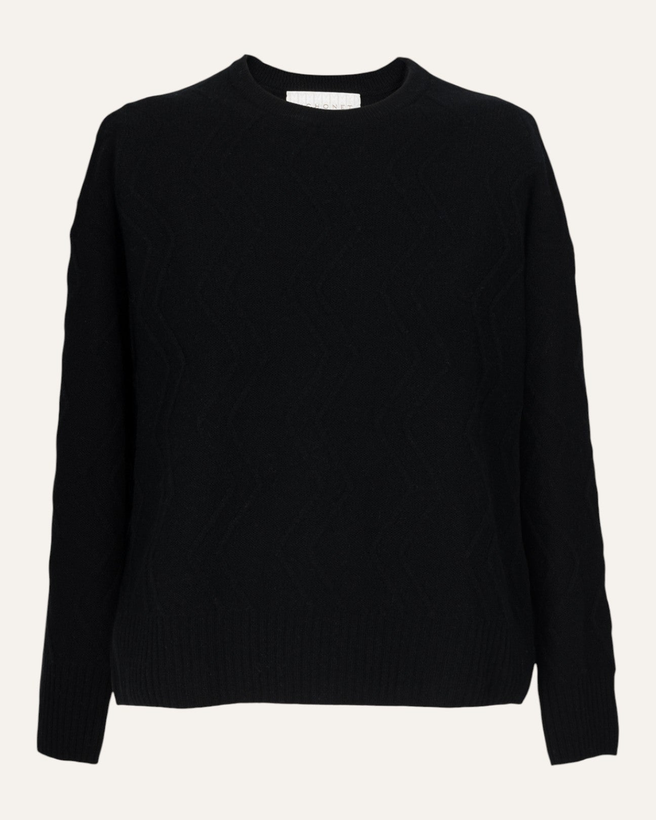 Uno de nuestros imprescindibles este invierno es nuestro jersey 100% cashmere en color negro con nuestro icónico relieve en zigzag al tono.