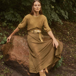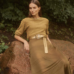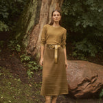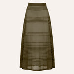 Falda midi confeccionada en punto semitransparente color verde oliva , con rayas asimétricas en relieve. Si no te gustan las transparencias el forro en tono nude evita que el tejido se adhiera al cuerpo y asegura una caída impecable que se adapta bien a distintas siluetas, suavizando el contraste de transparencias con un acabado refinado.