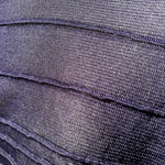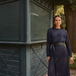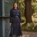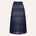 Falda midi confeccionada en punto semitransparente color violeta intenso, con rayas asimétricas. Si no eres tan arriesgada el forro en tono nude evita que el tejido se adhiera al cuerpo y asegura una caída impecable que se adapta bien a distintas siluetas, suavizando el contraste de transparencias con un acabado refinado.