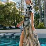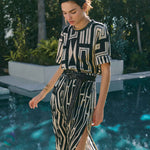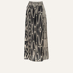 Falda larga de seda con diferentes estampados tribal y abertura lateral.