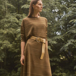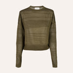 Top de manga larga confeccionado en punto semitransparente color verde oliva, con delicadas rayas asimétricas en relieve .