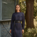 De corte recto y cuello redondo, se adapta con suavidad al cuerpo, manteniendo un aire elegante y sofisticado.
