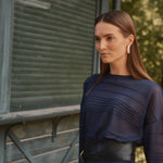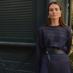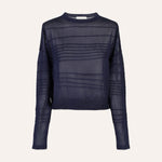 Top de manga larga confeccionado en punto semitransparente color violeta intenso, con delicadas rayas asimétricas en relieve.