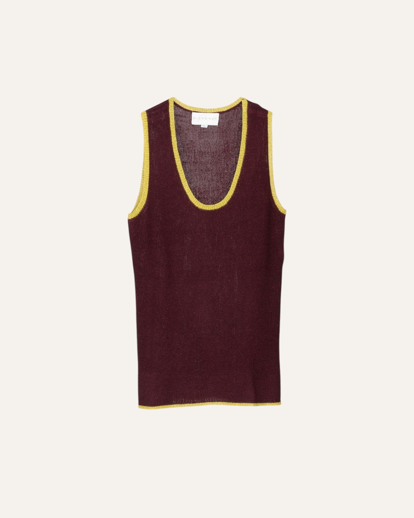 Top de tirantes en punto en color burdeos. El brillo del lurex al tono del tejido eleva esta prenda a un básico imprescindible.