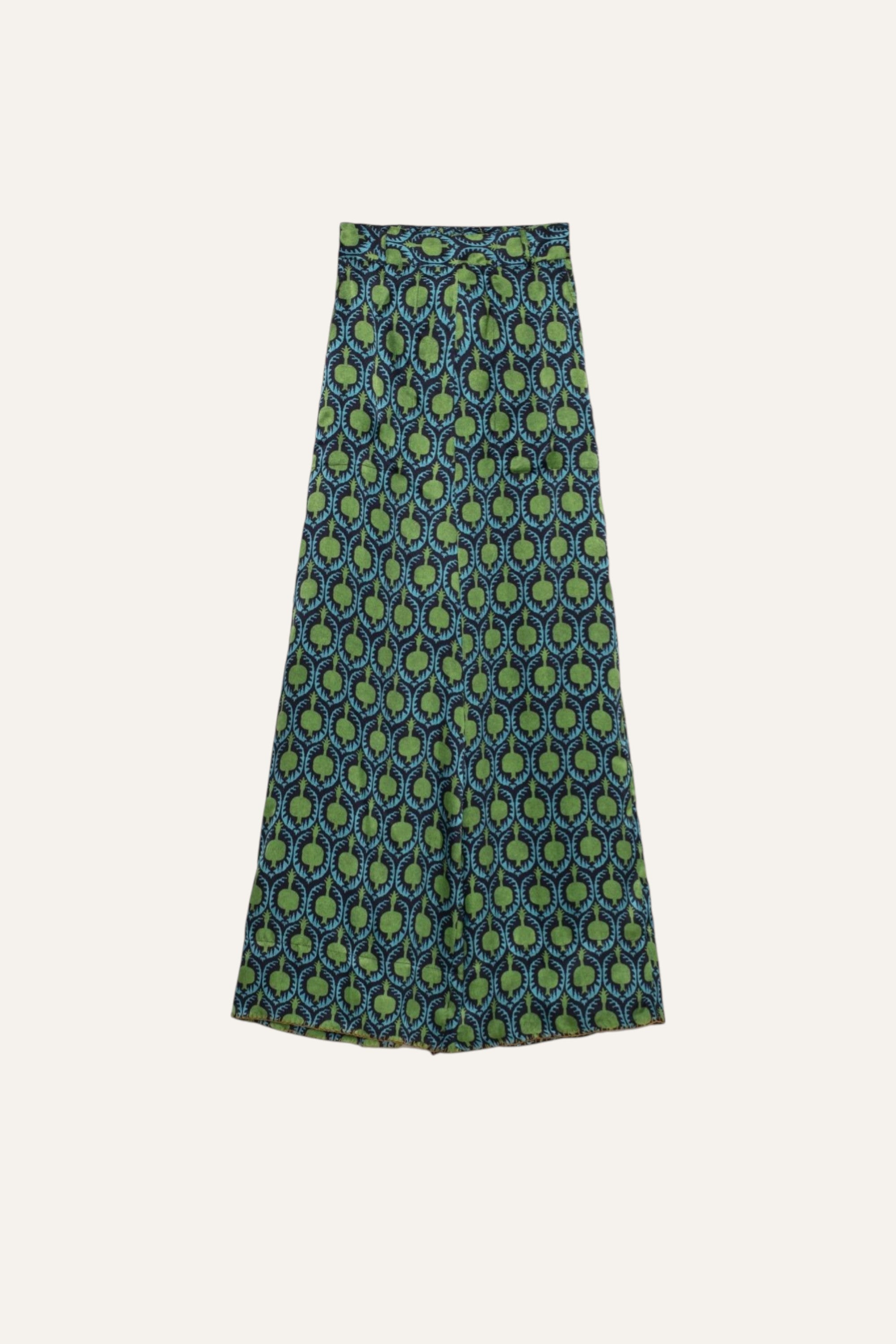 High and wide leg trousers, made of silk fabric printed with blue and green ikat motifs on a black background. Elastic pursed waist on the back. You can combine it with your companion jacket.