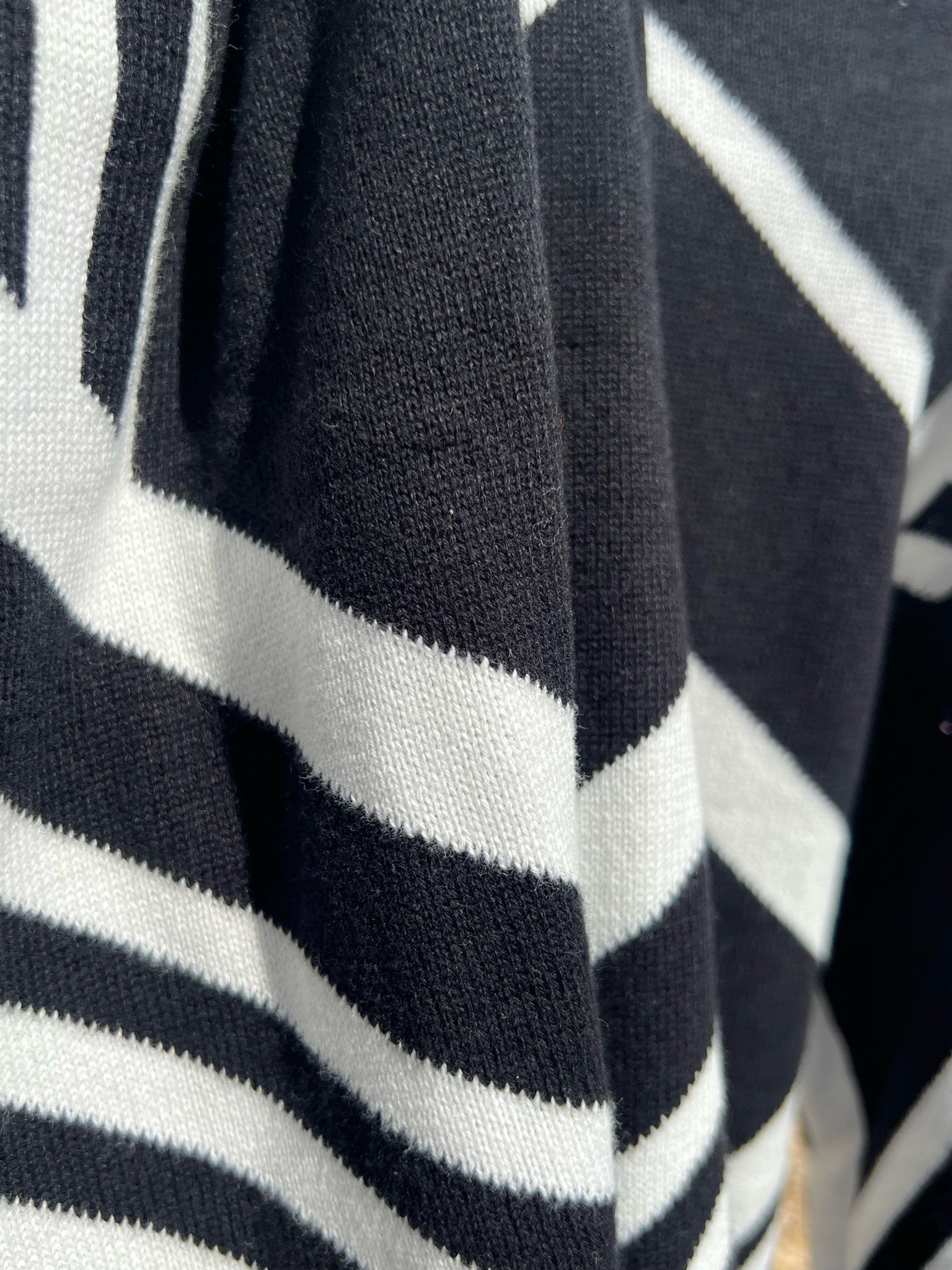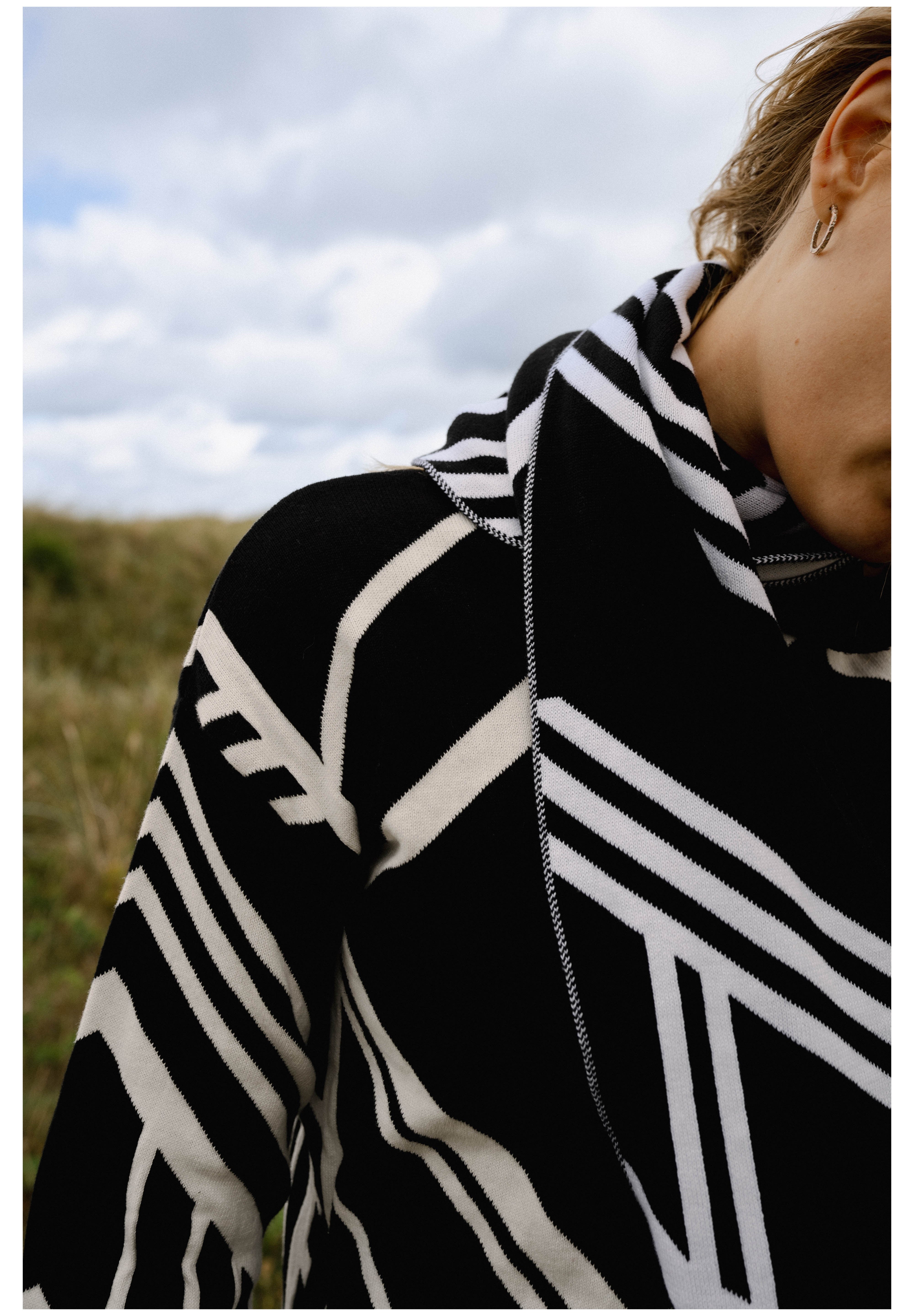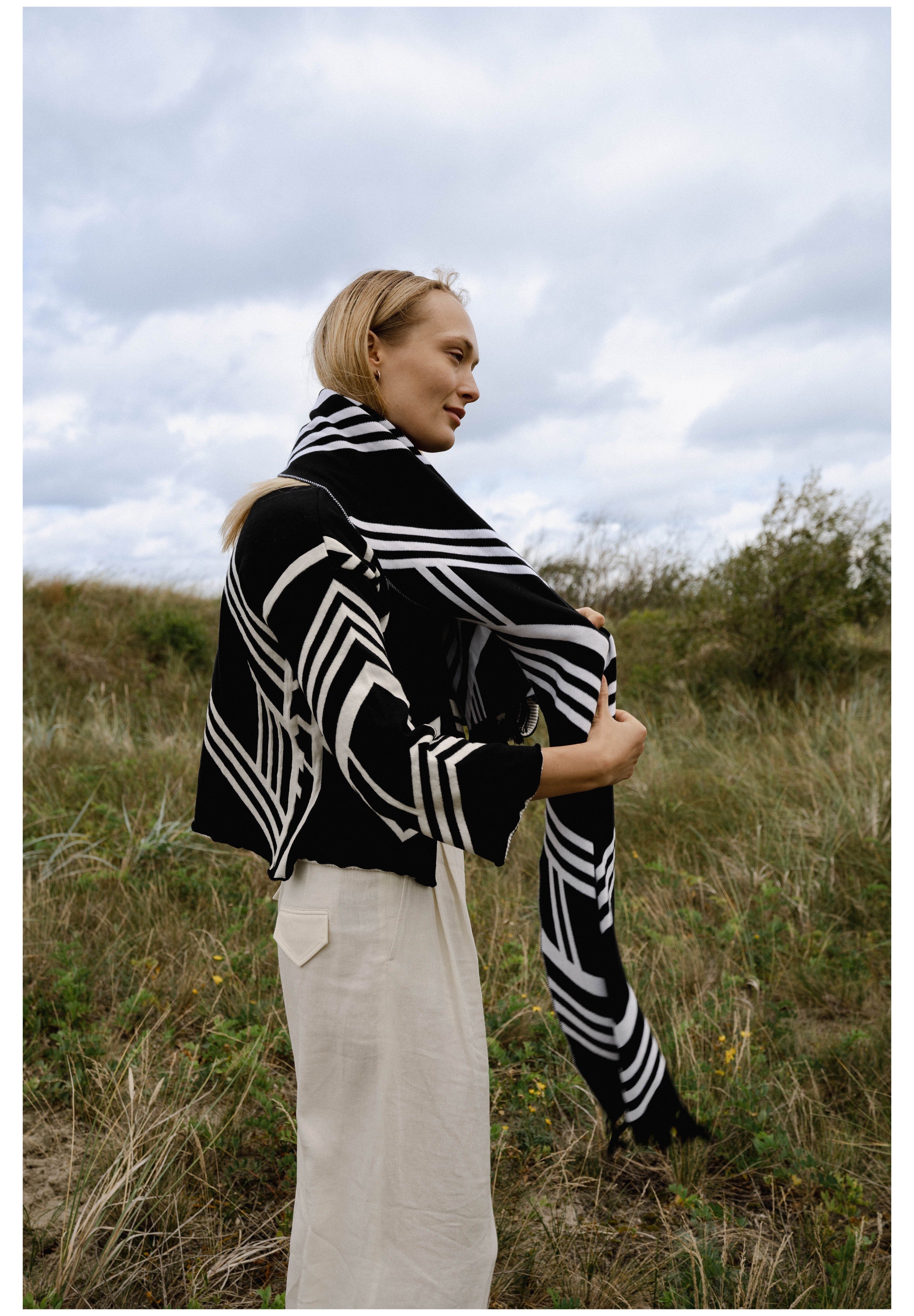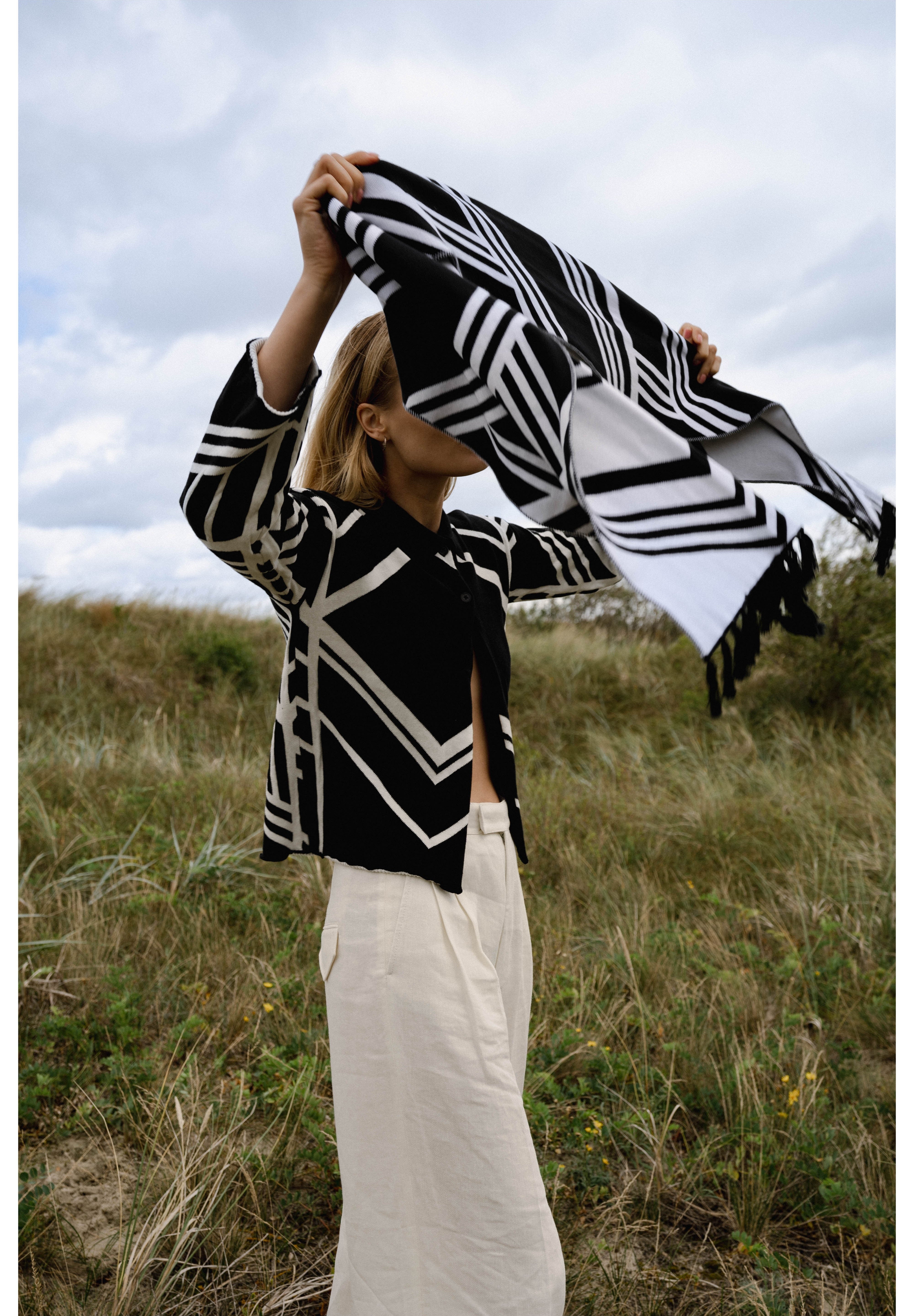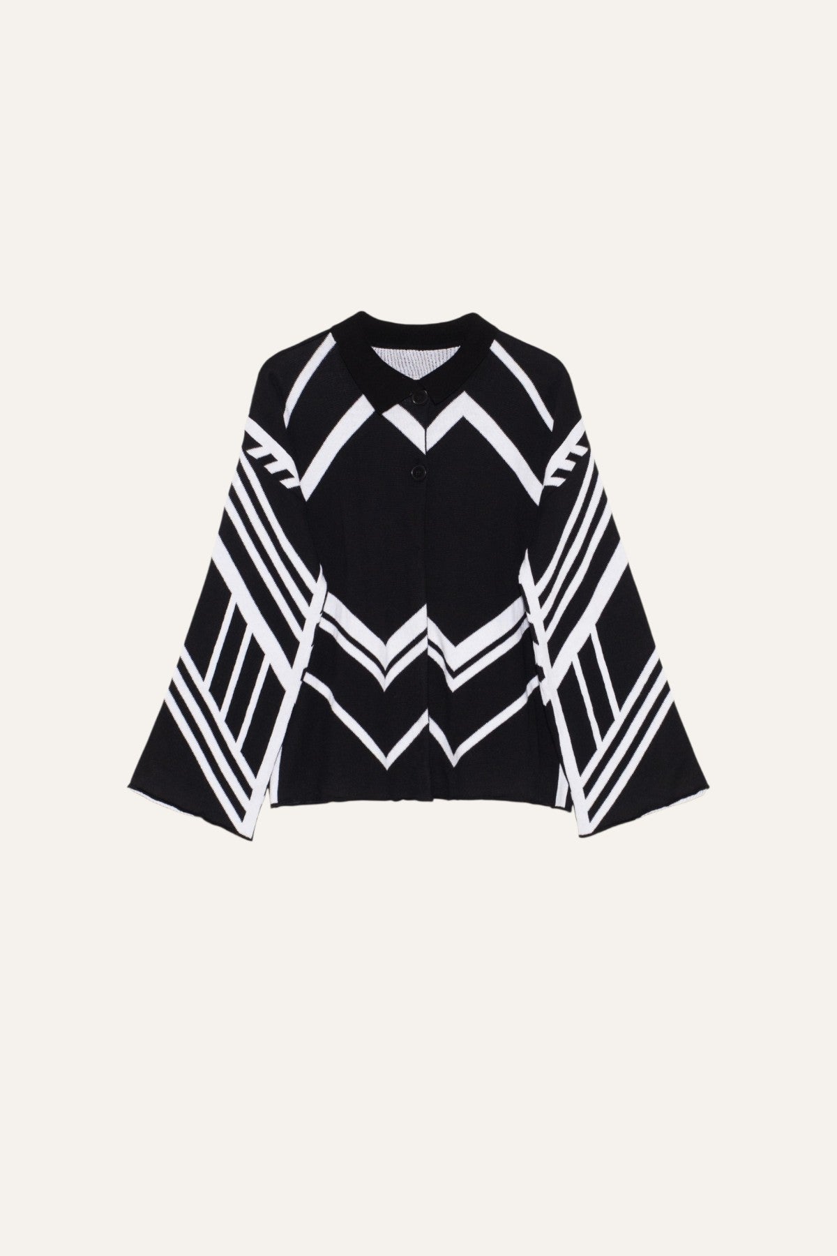 Buttoned knit jacket with black and white geometric patterns. Jacquard fabric in double cotton. It is a timeless and elegant garment for any time of the year. It has a straight cut and slightly flared sleeves.