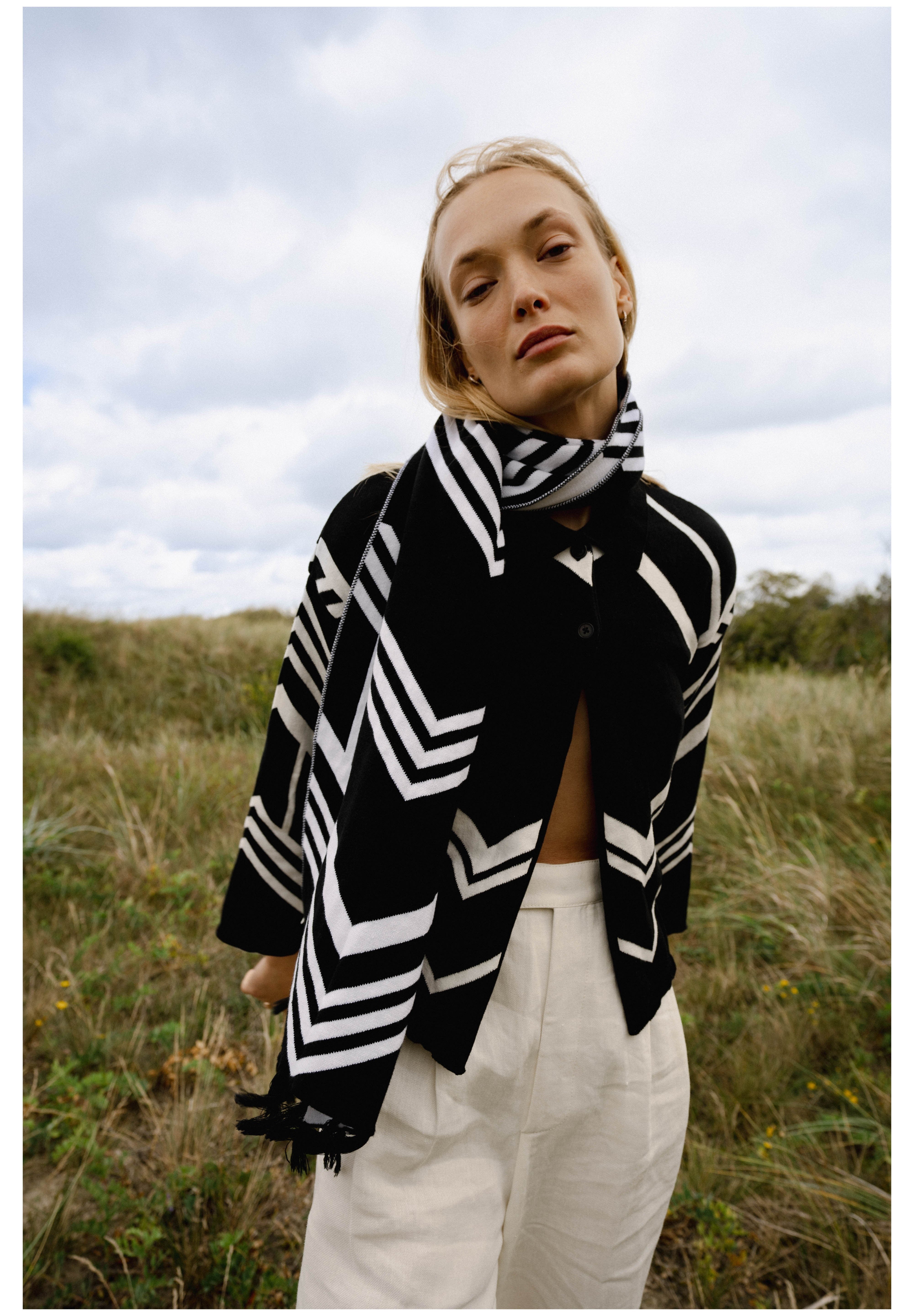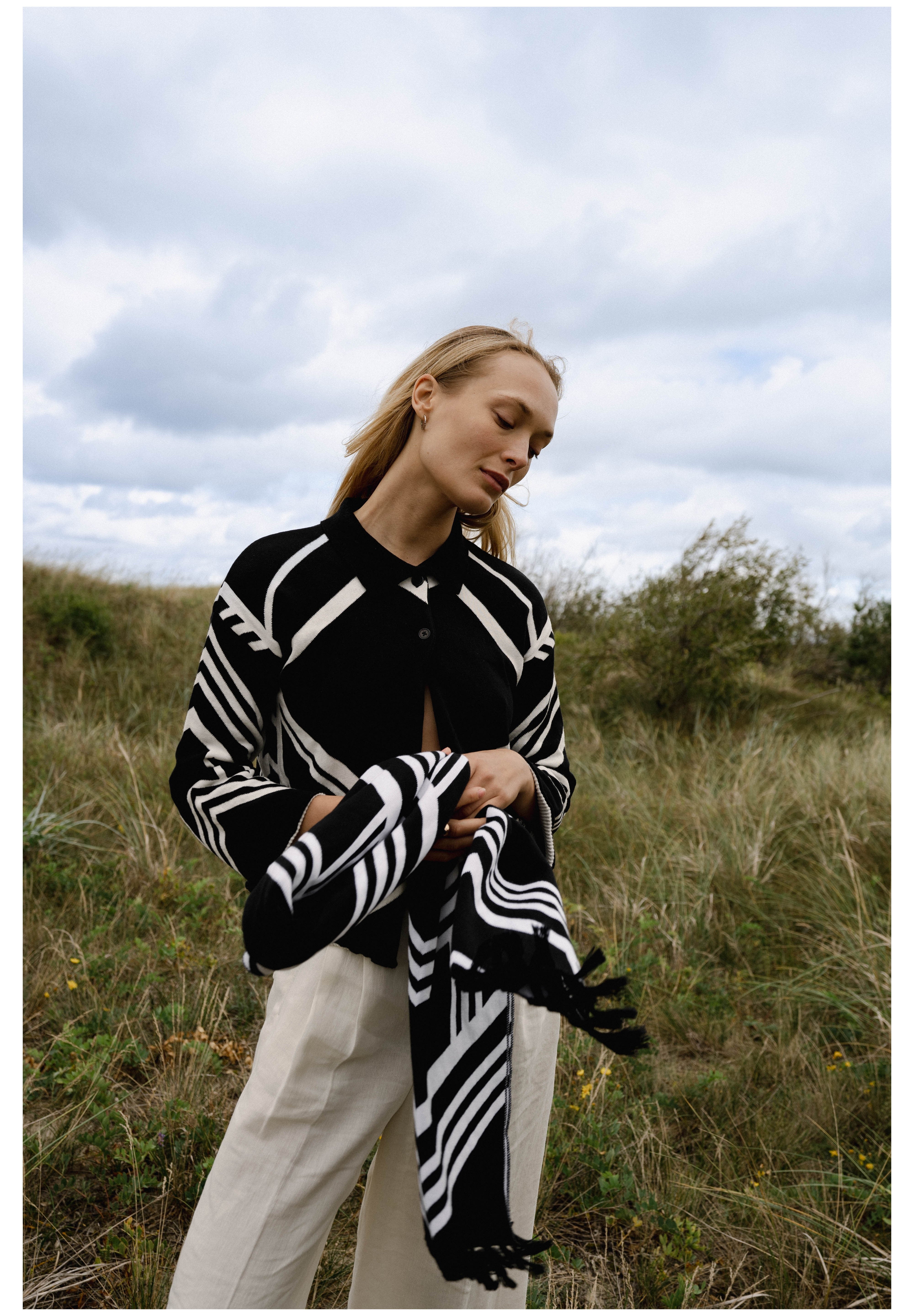 Removable combined scarf with an invisible button on the back, finished with black fringes.
