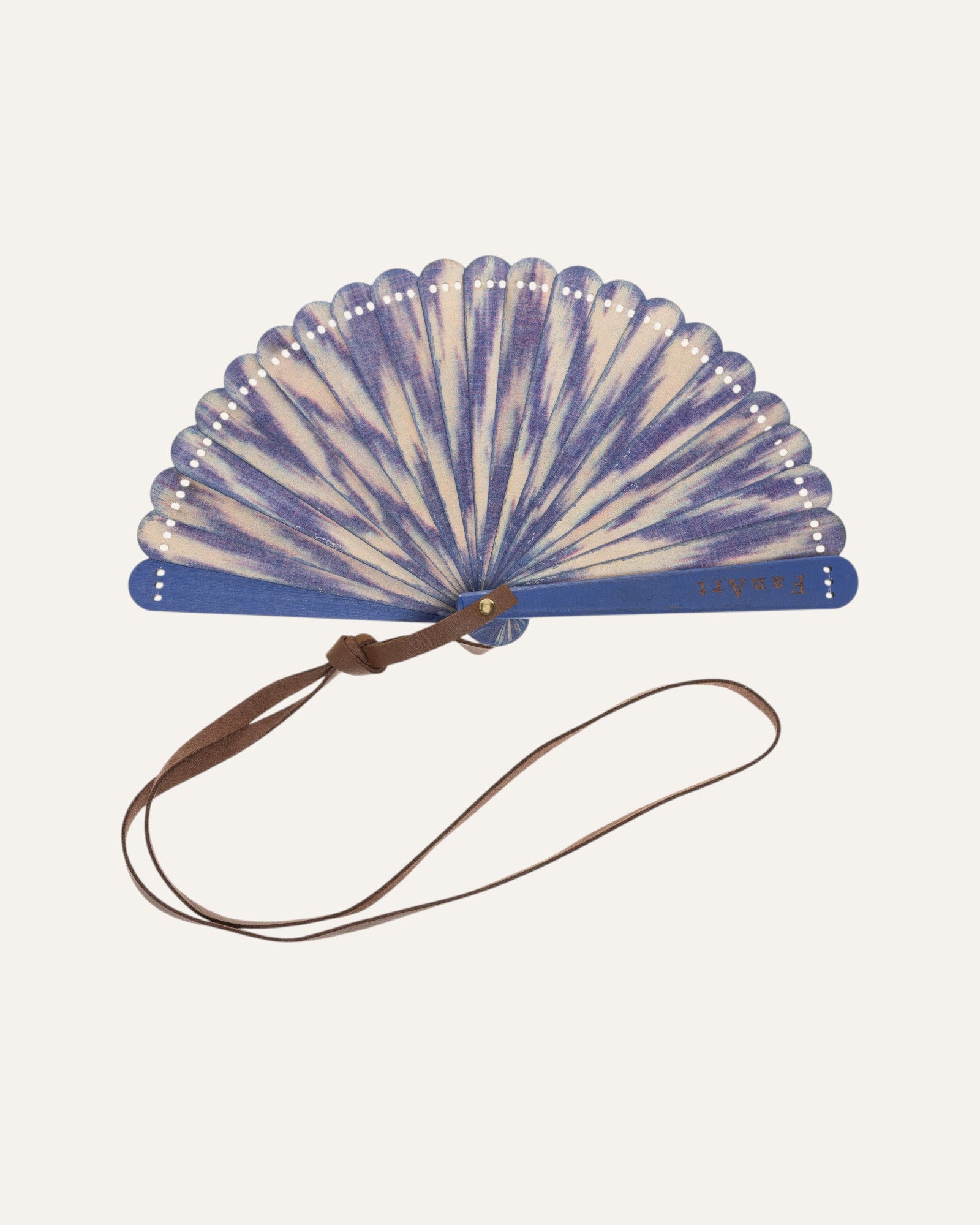 15 cm wooden printed fan with 40 cm leather cord.