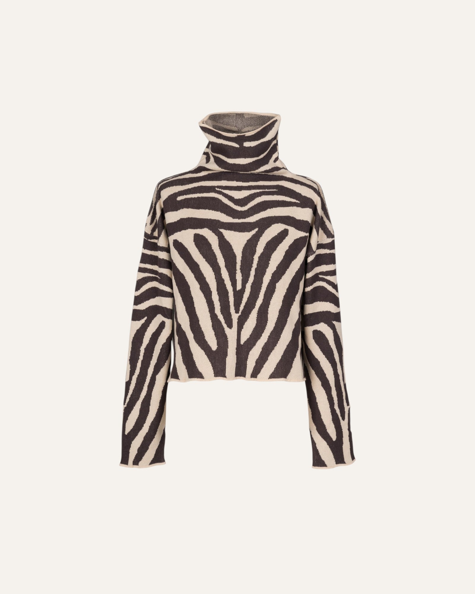 Cotton sweater with zebra pattern in brown tones on beige background.