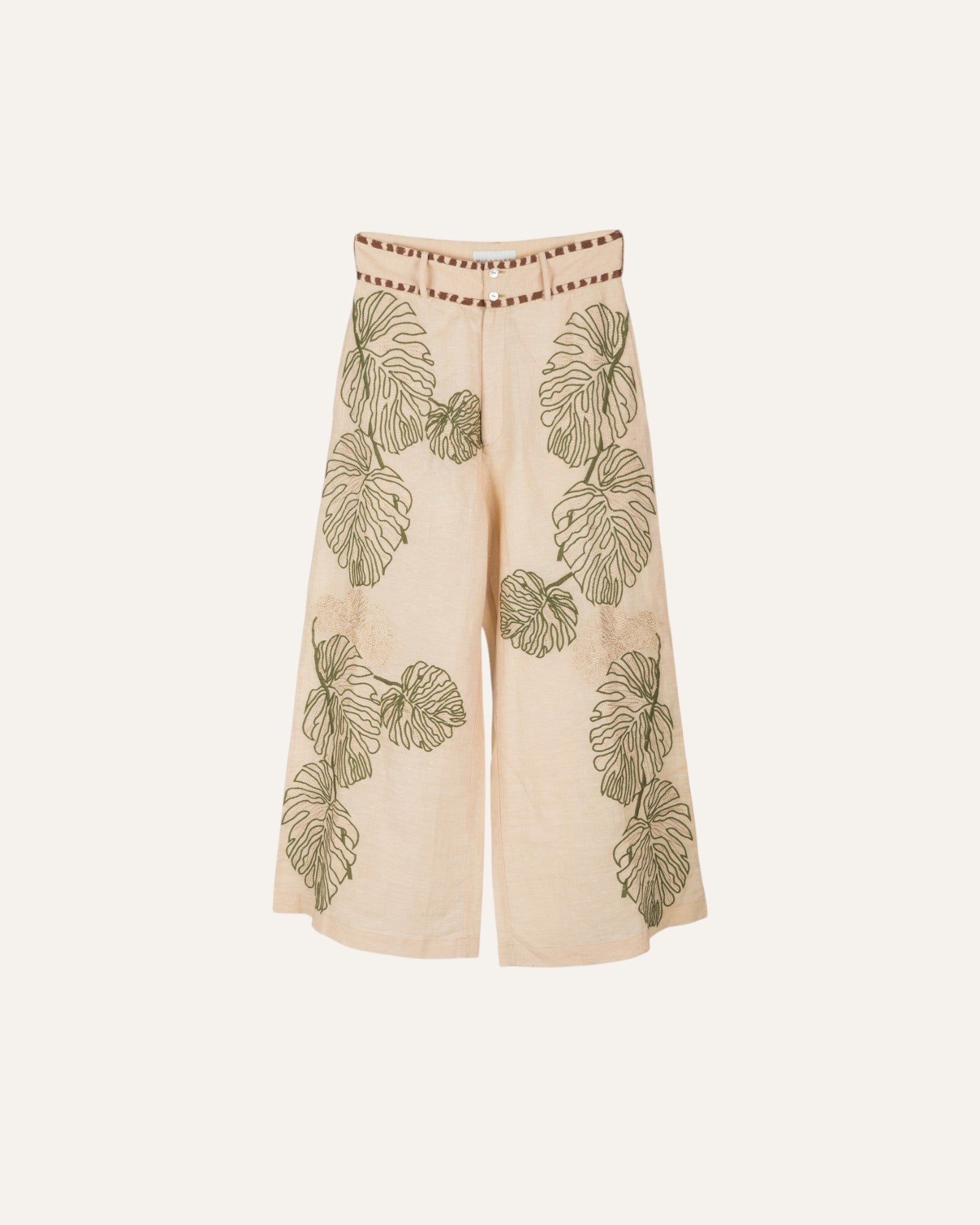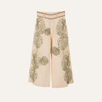 Sand colored linen pants completely EMBROIDERED with green and gold leaves which makes it have a very elegant natural movement.