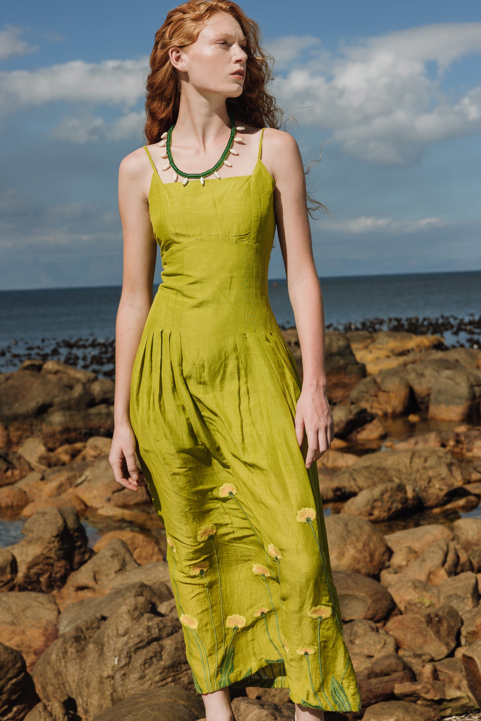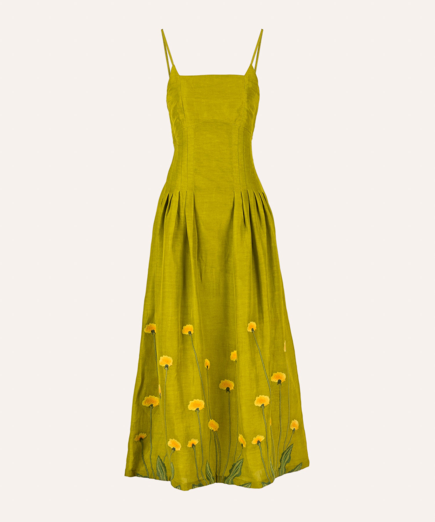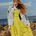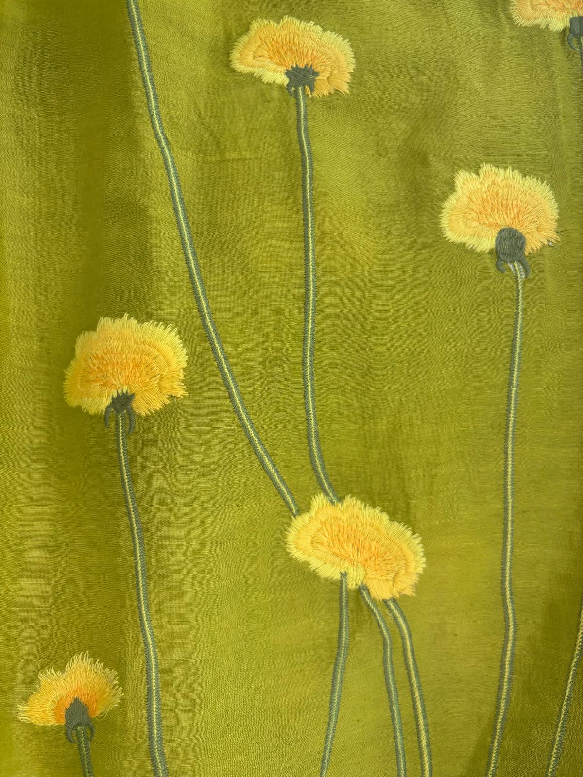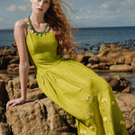 Citronella-colored midi dress embroidered with yellow and green flowers, inspired by large prairie flowers that run across the skirt. The fabric has been designed from scratch with a special blend of linen, viscose, and other selected fibers, giving it a rich texture, natural drape, and a character that is difficult to reproduce.