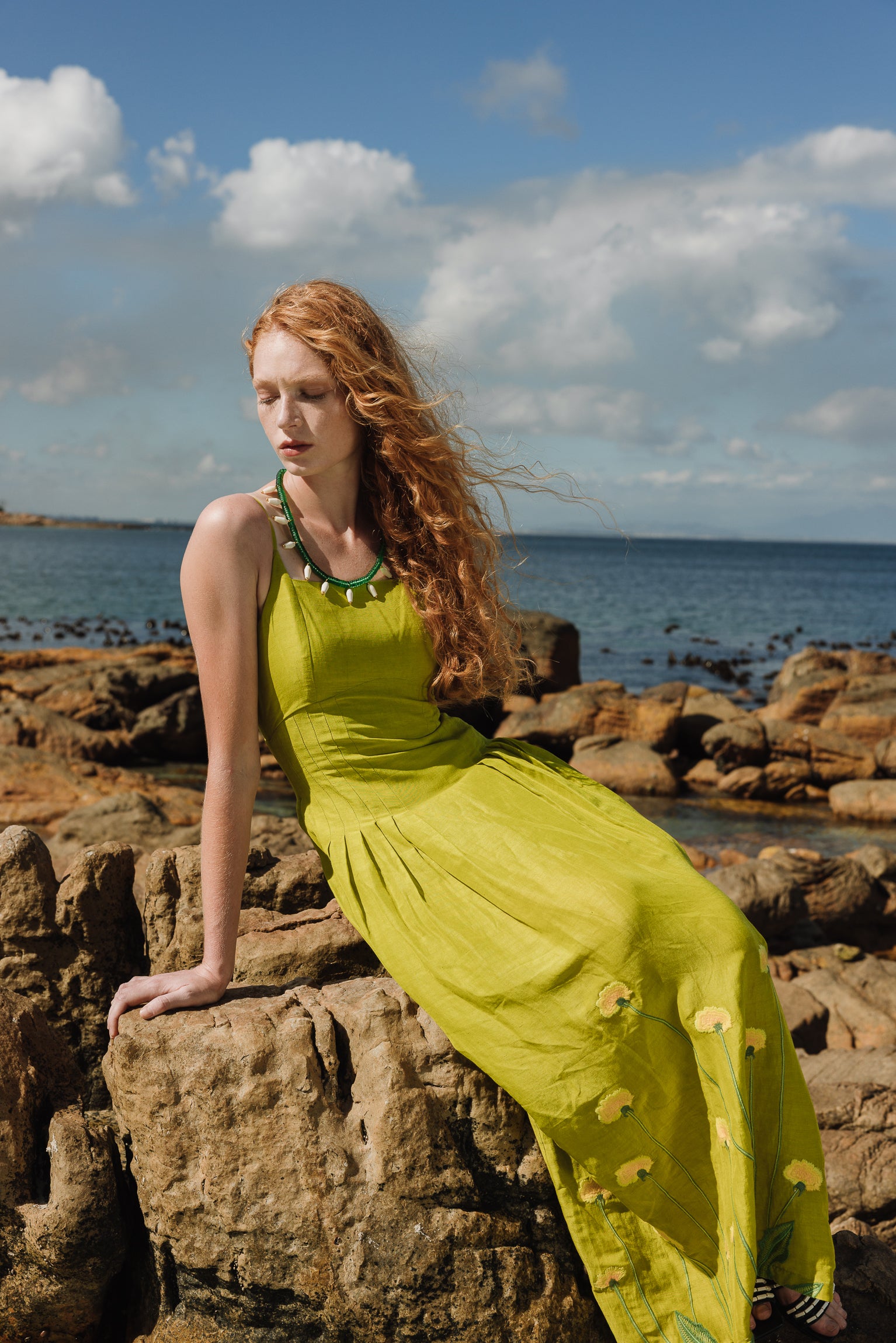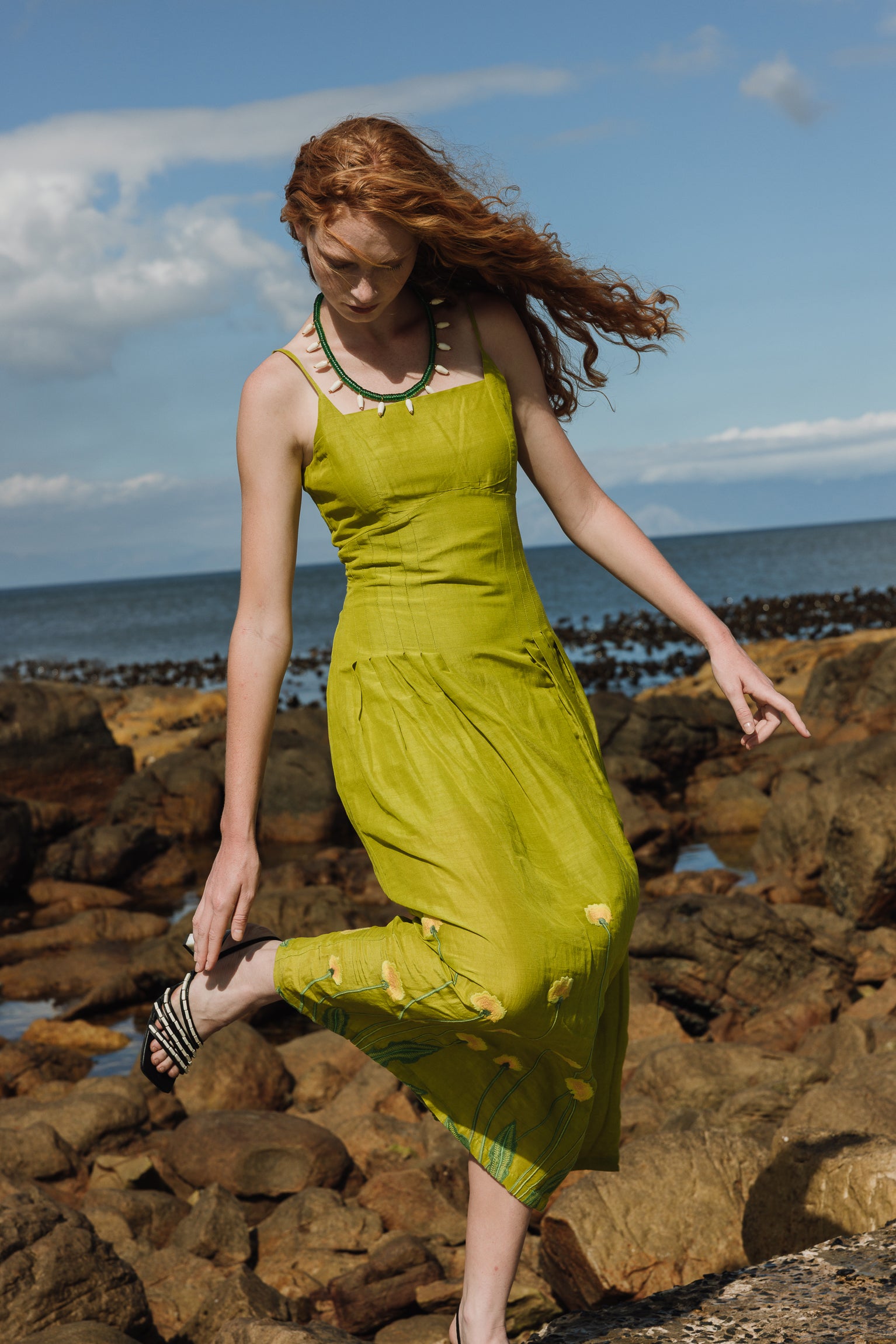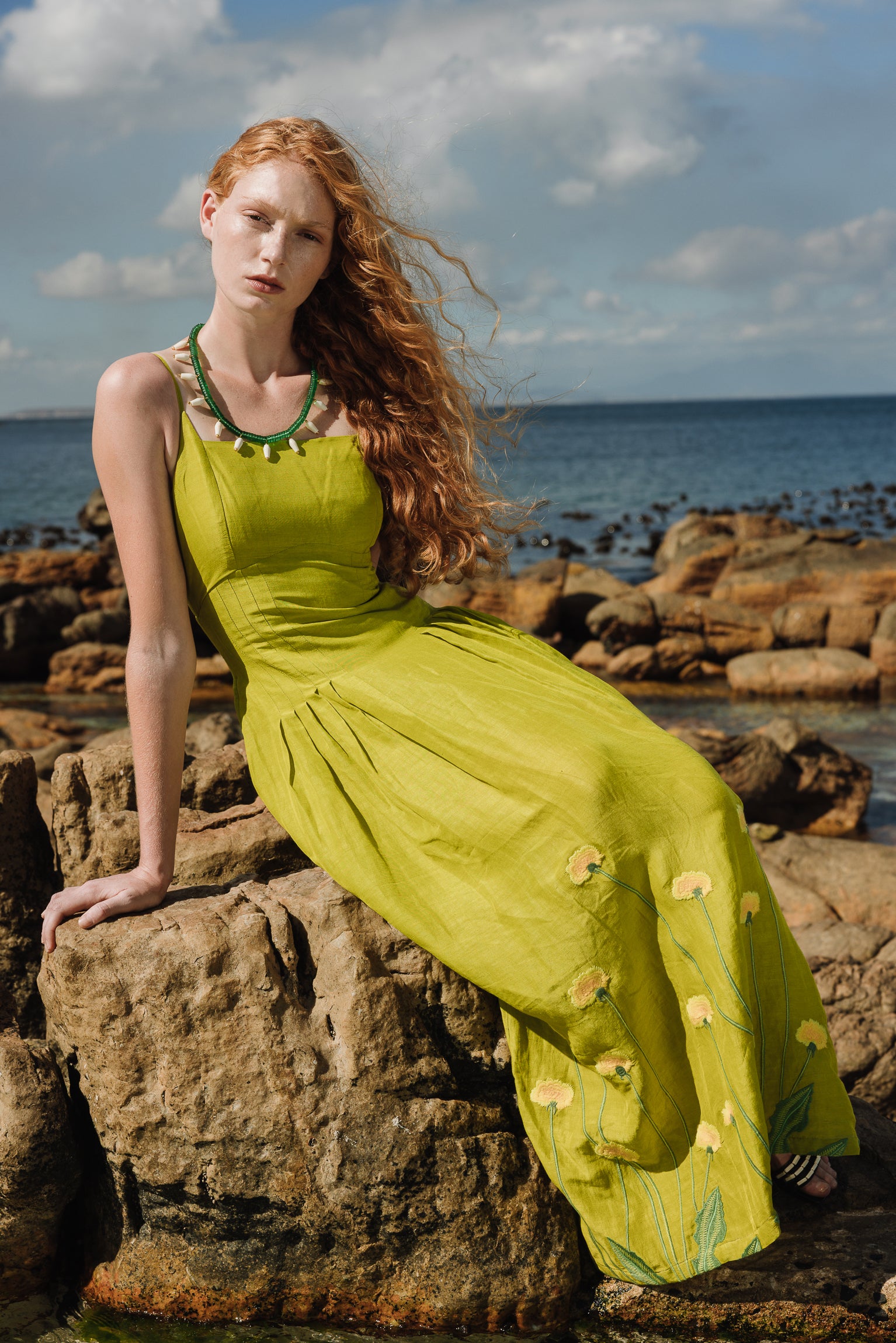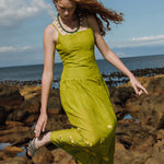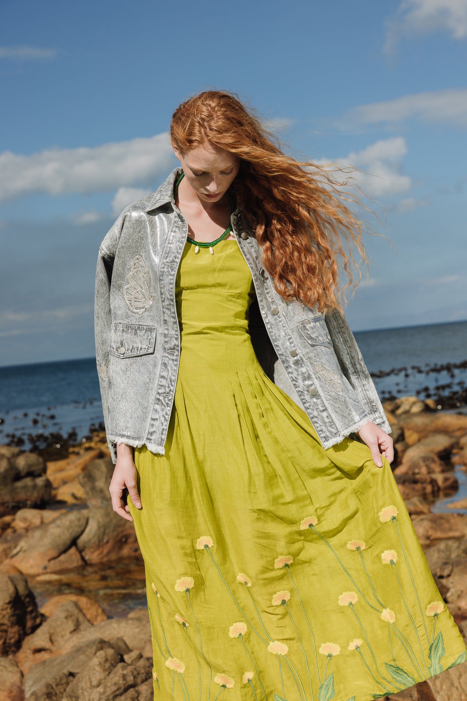 Citronella-colored midi dress embroidered with yellow and green flowers, inspired by large prairie flowers that run across the skirt. The fabric has been designed from scratch with a special blend of linen, viscose, and other selected fibers, giving it a rich texture, natural drape, and a character that is difficult to reproduce.
