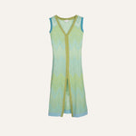 Ruched knit dress in turquoise and aqua green tones with silver sparkles.
