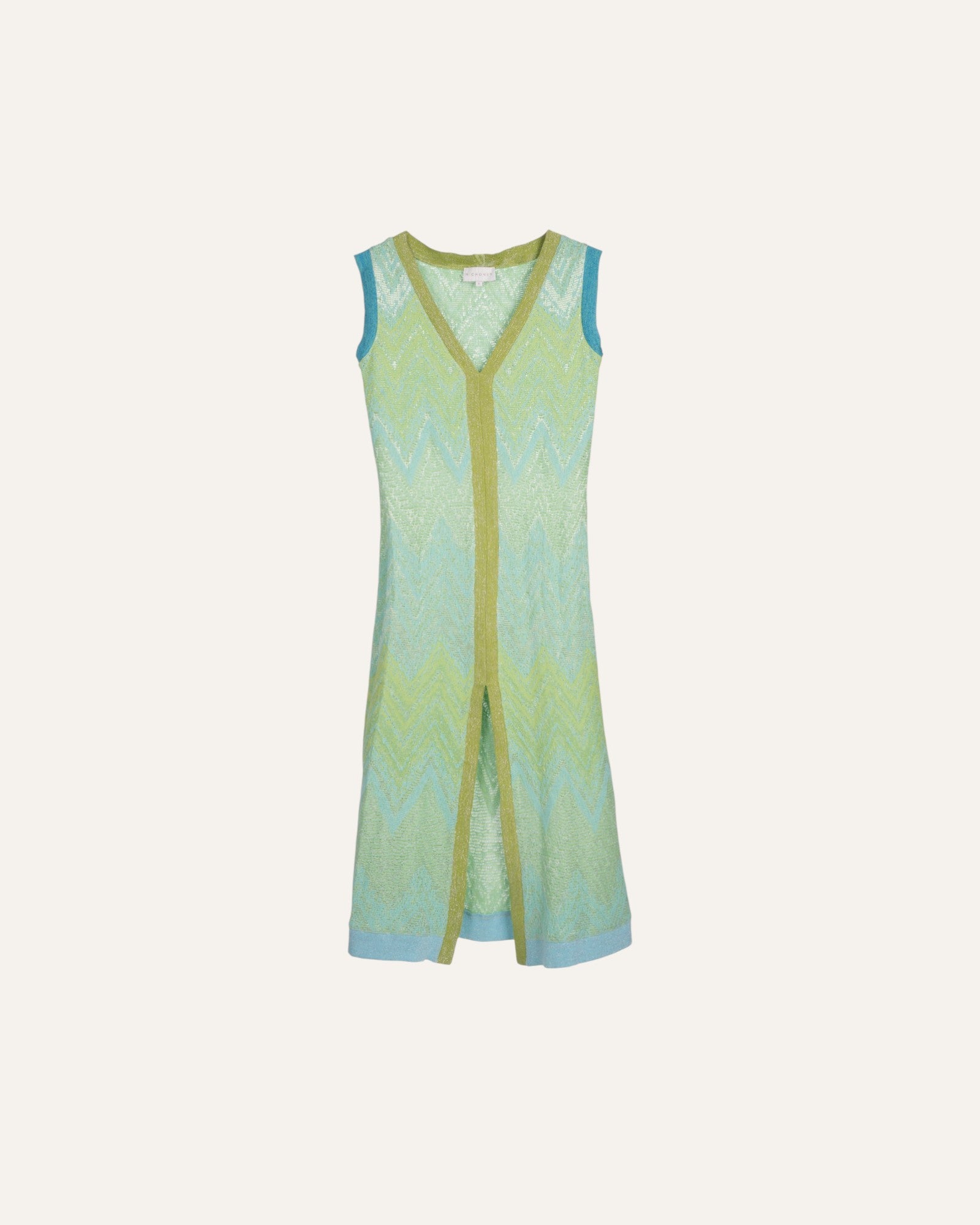 Straight cut, sleeveless, V-neckline and front opening with ribbed finish in contrasting colors.