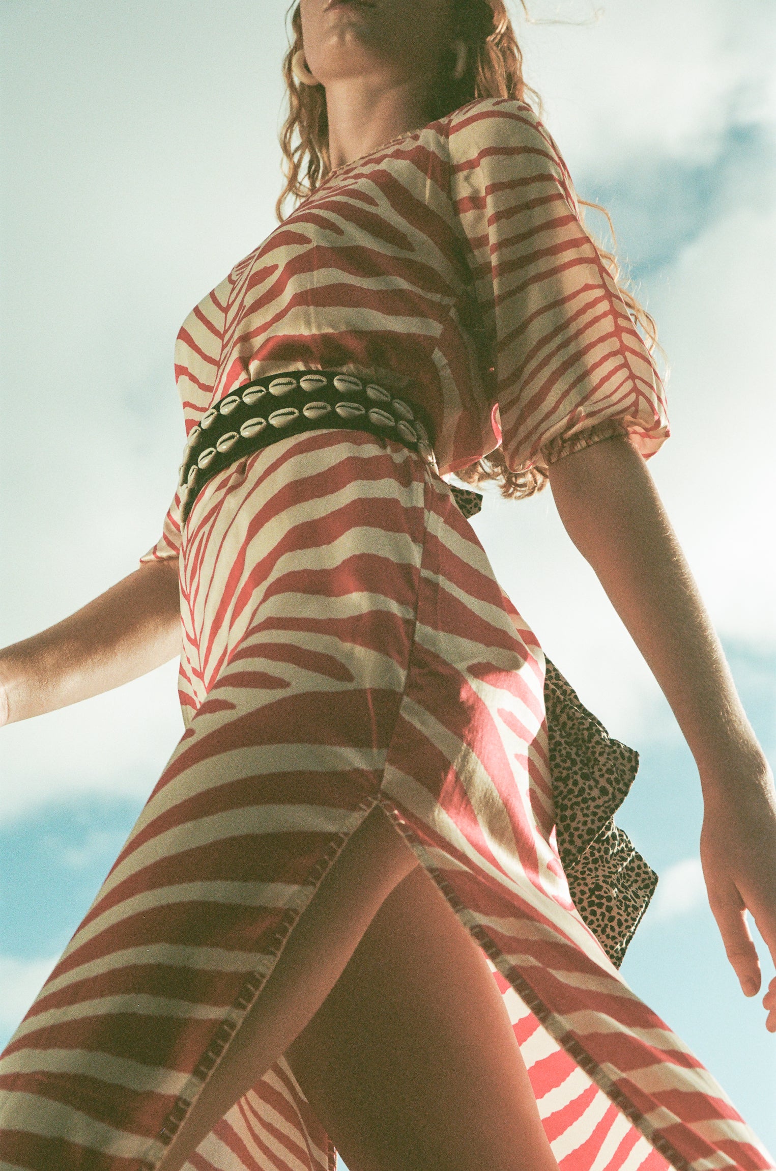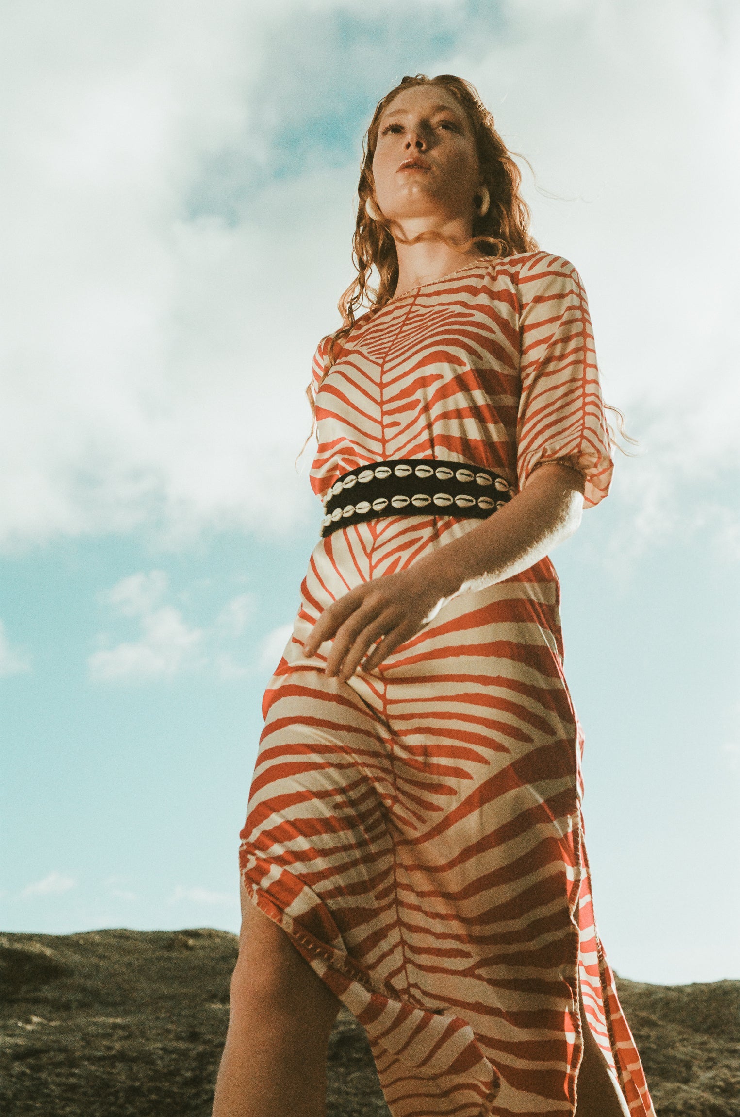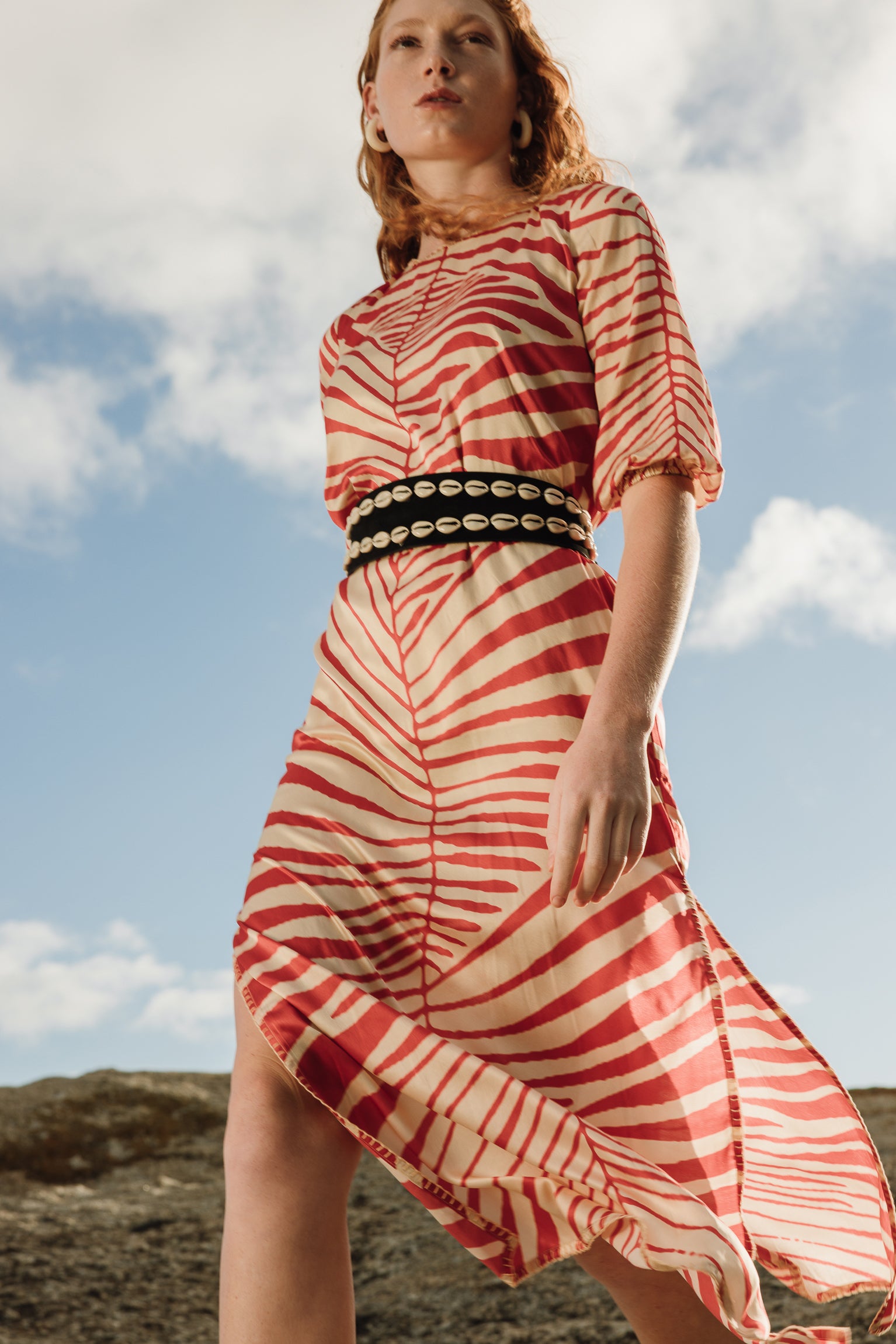 Silk dress with leaf print in coral/beige tones.