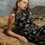 Black knit midi dress made from 100% cotton. It features a straight cut, sleeveless silhouette, and a scoop neckline with contrasting embroidery. Its off-white geometric embroidery, inspired by organic shapes with a geometric structure, evokes a tropical nightscape, making it a wardrobe staple.