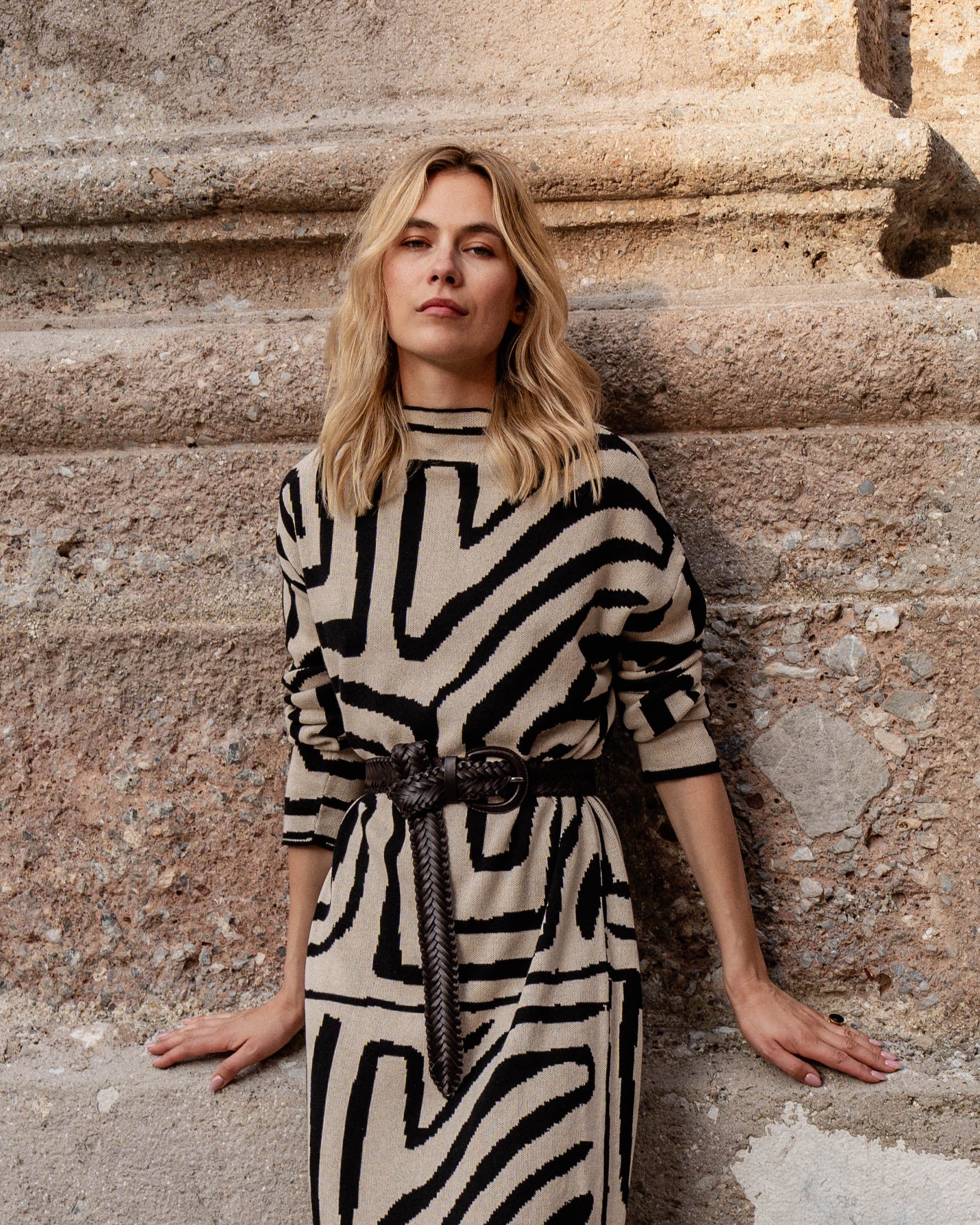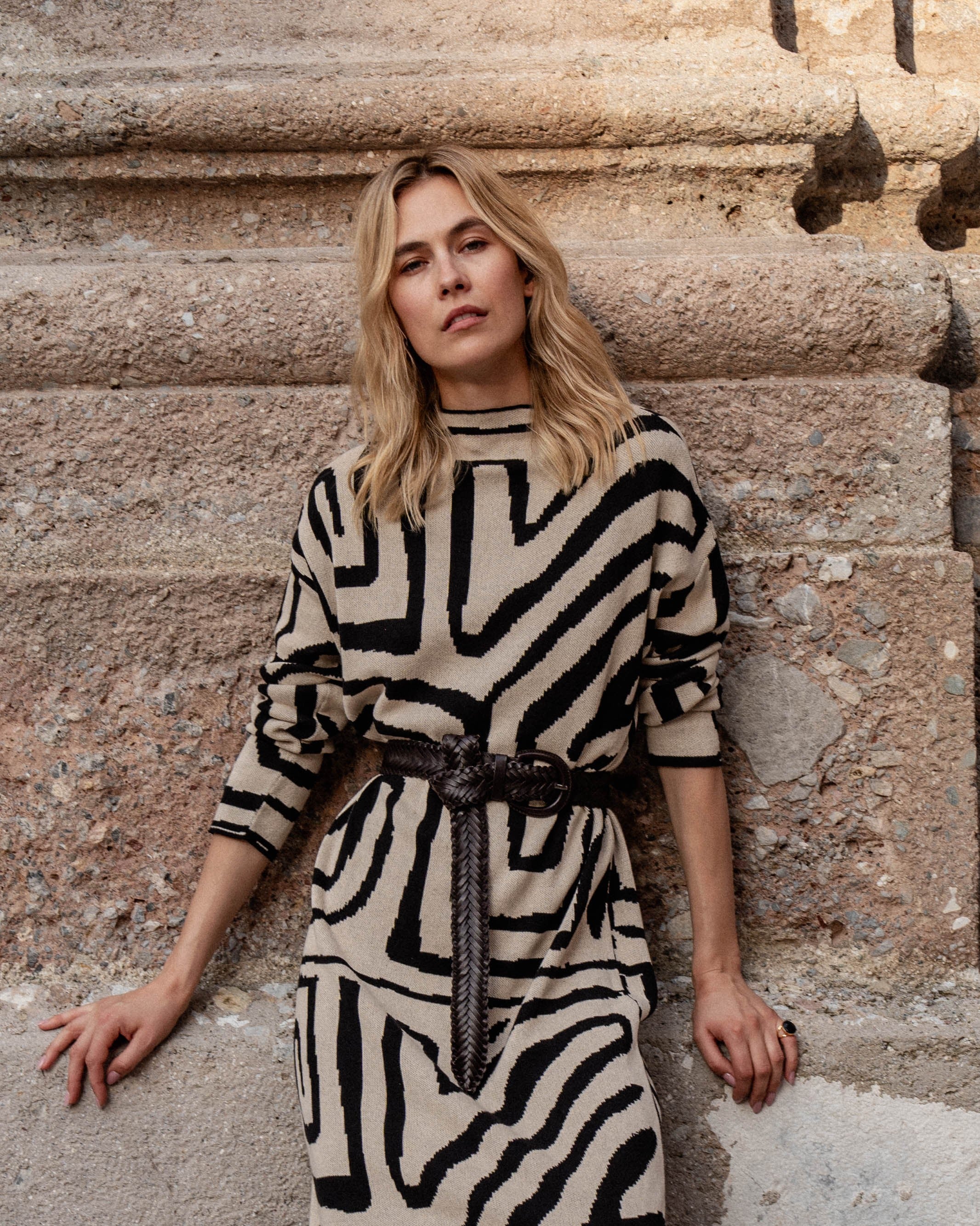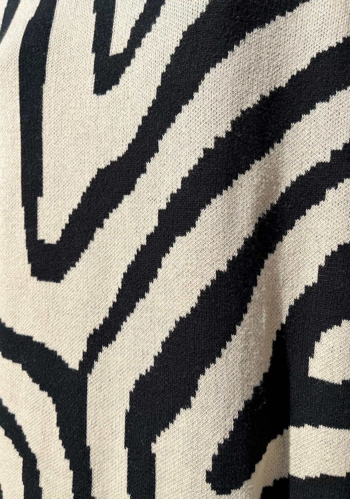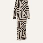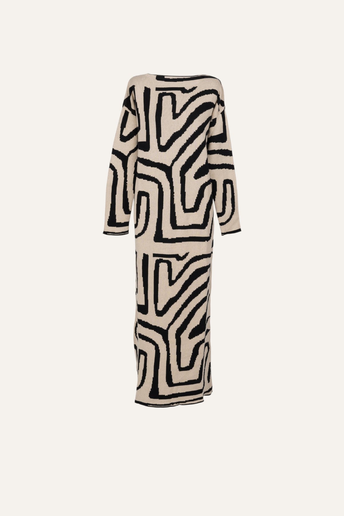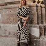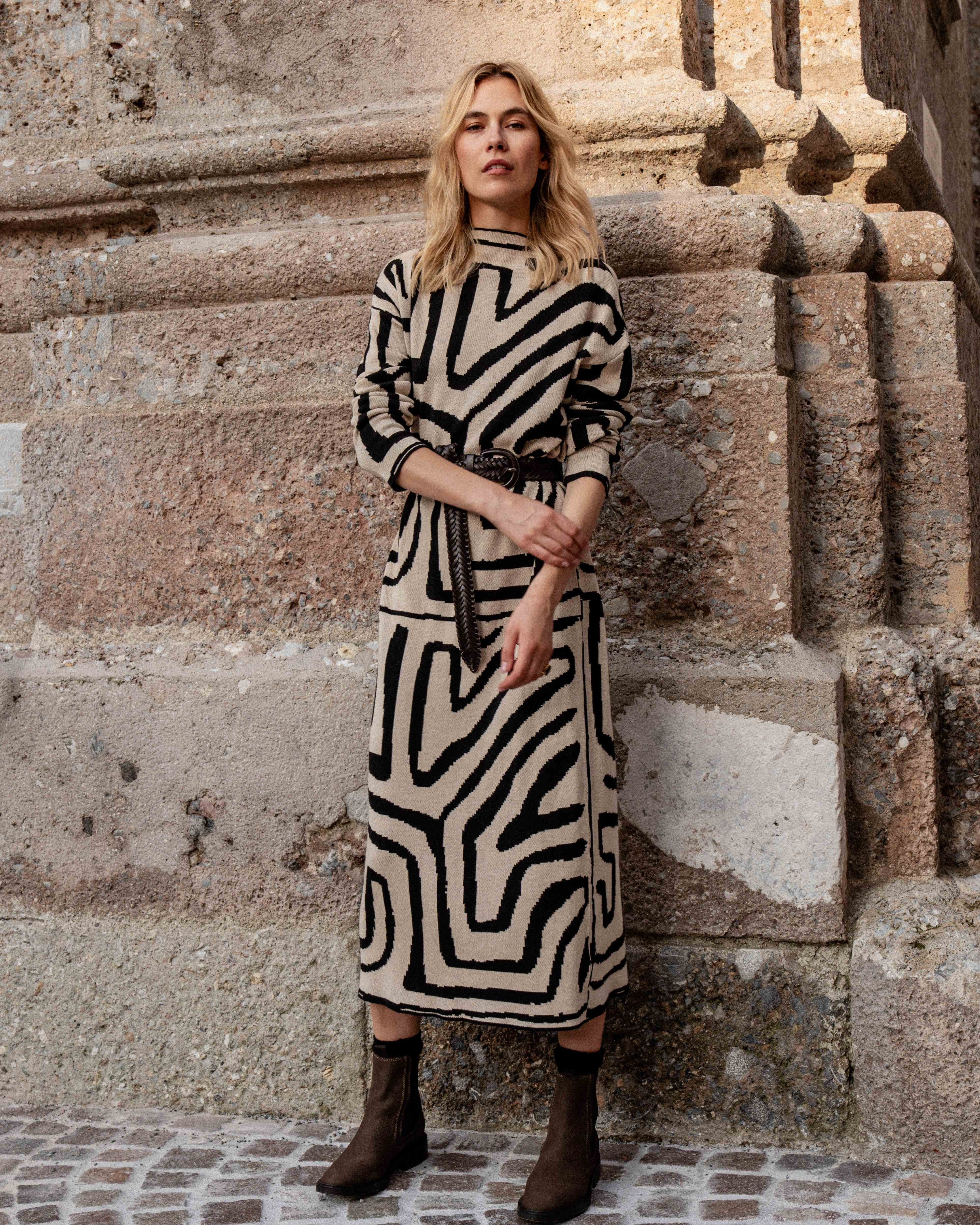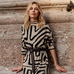 This knit dress with ethnic motif in beige and black tones is always a winning combination.