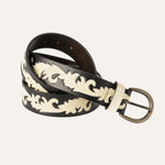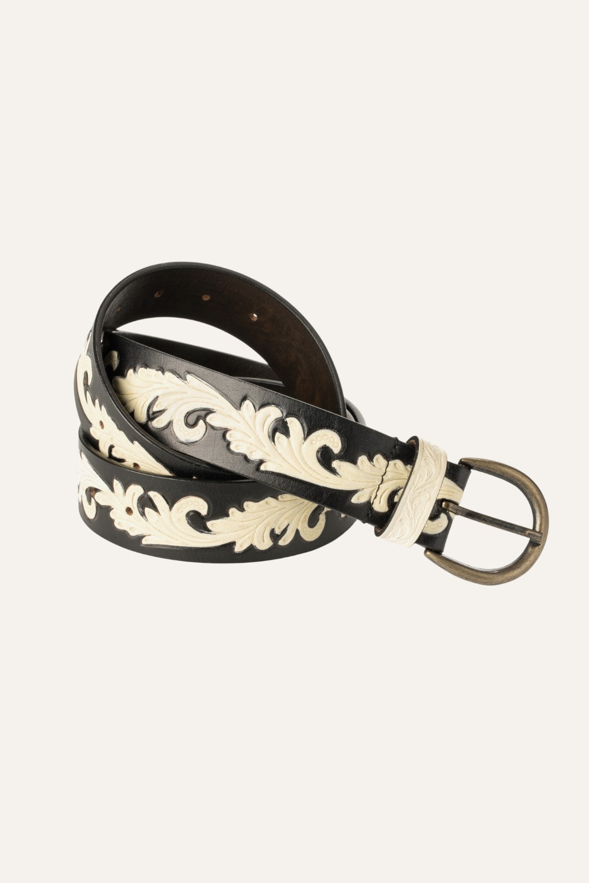 Cinturón Acanto blanco, con un diseño elegante en negro, es una pieza versátil que aporta un toque de sofisticación a cualquier conjunto.