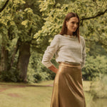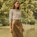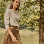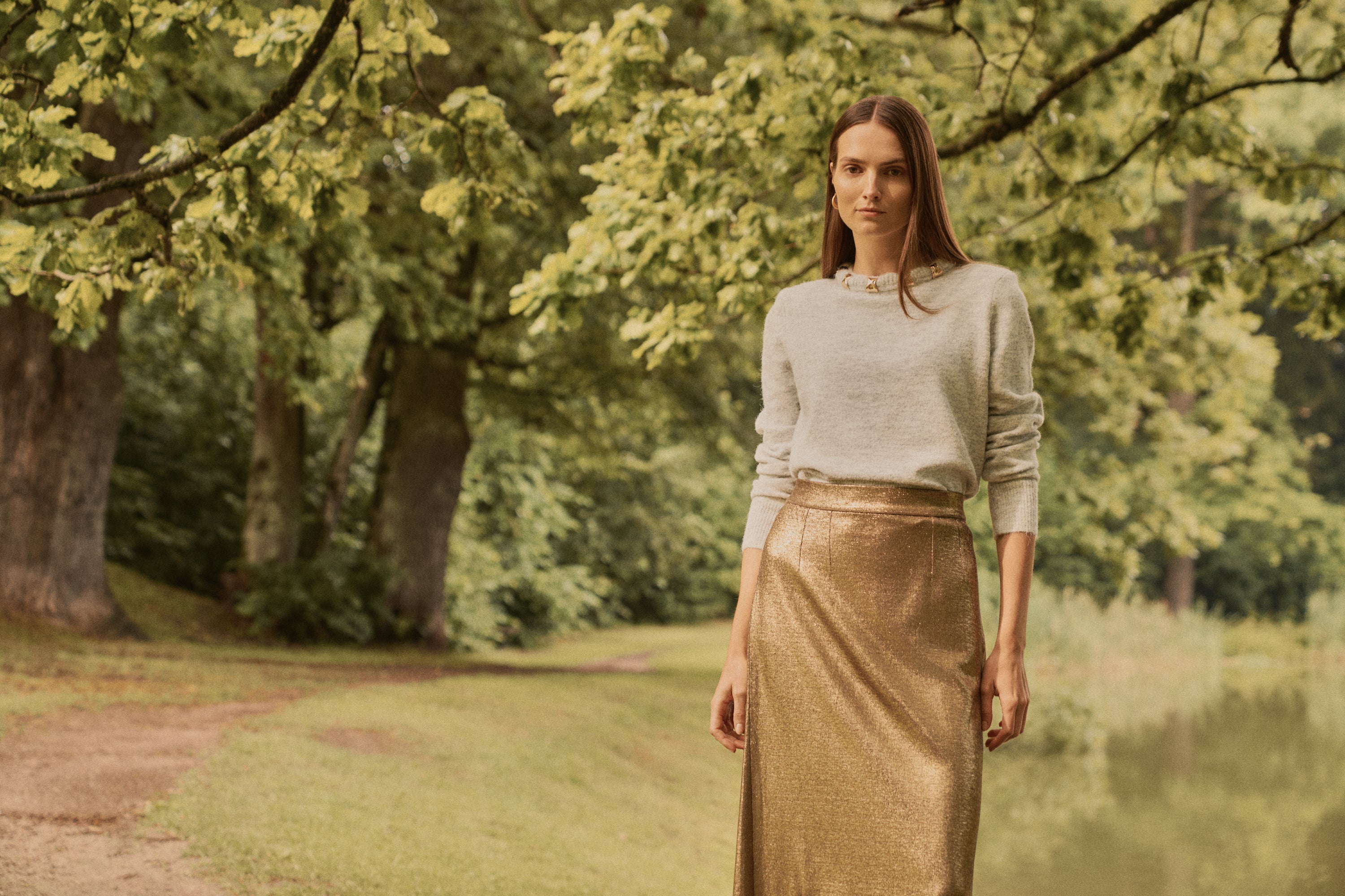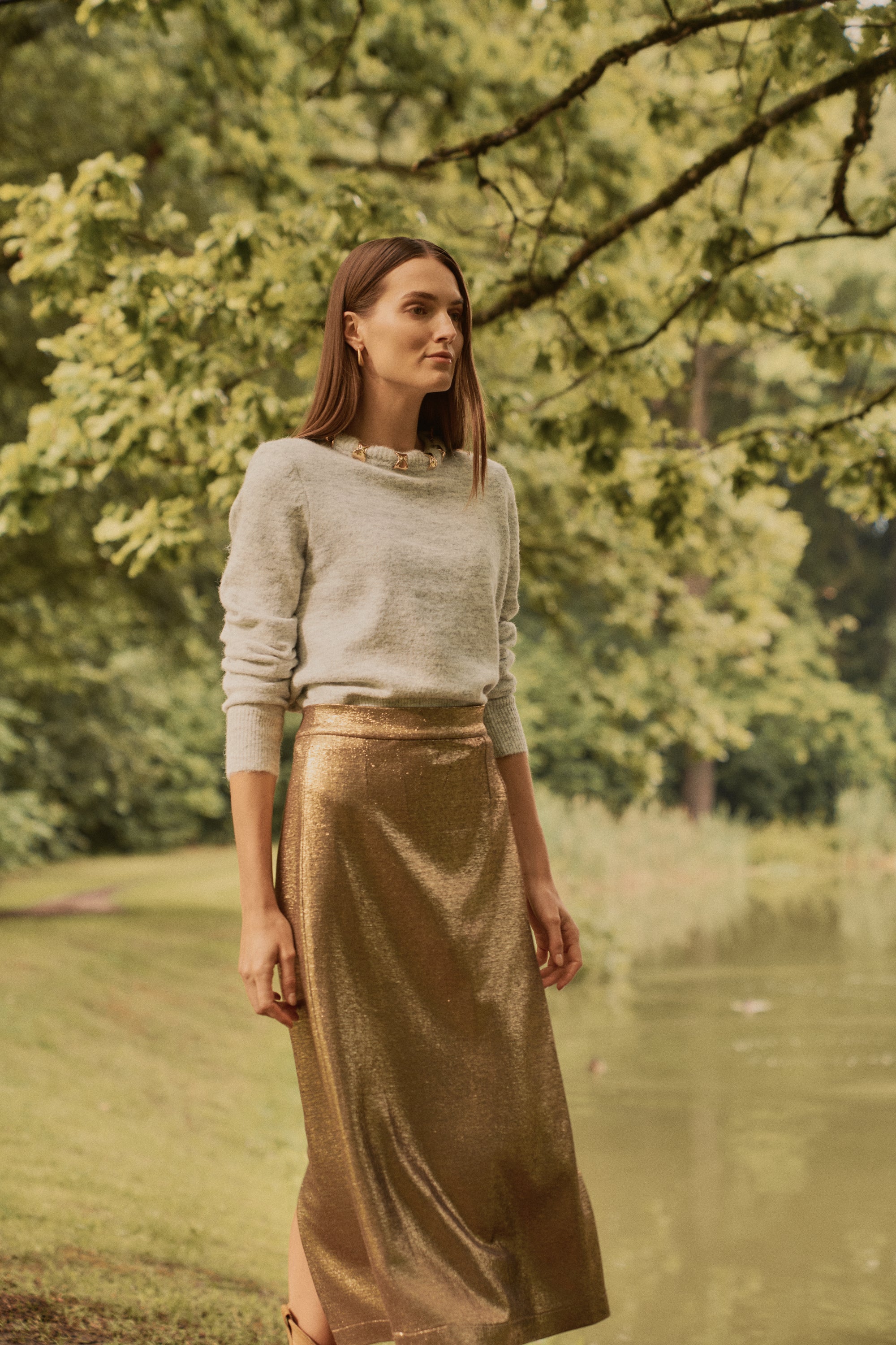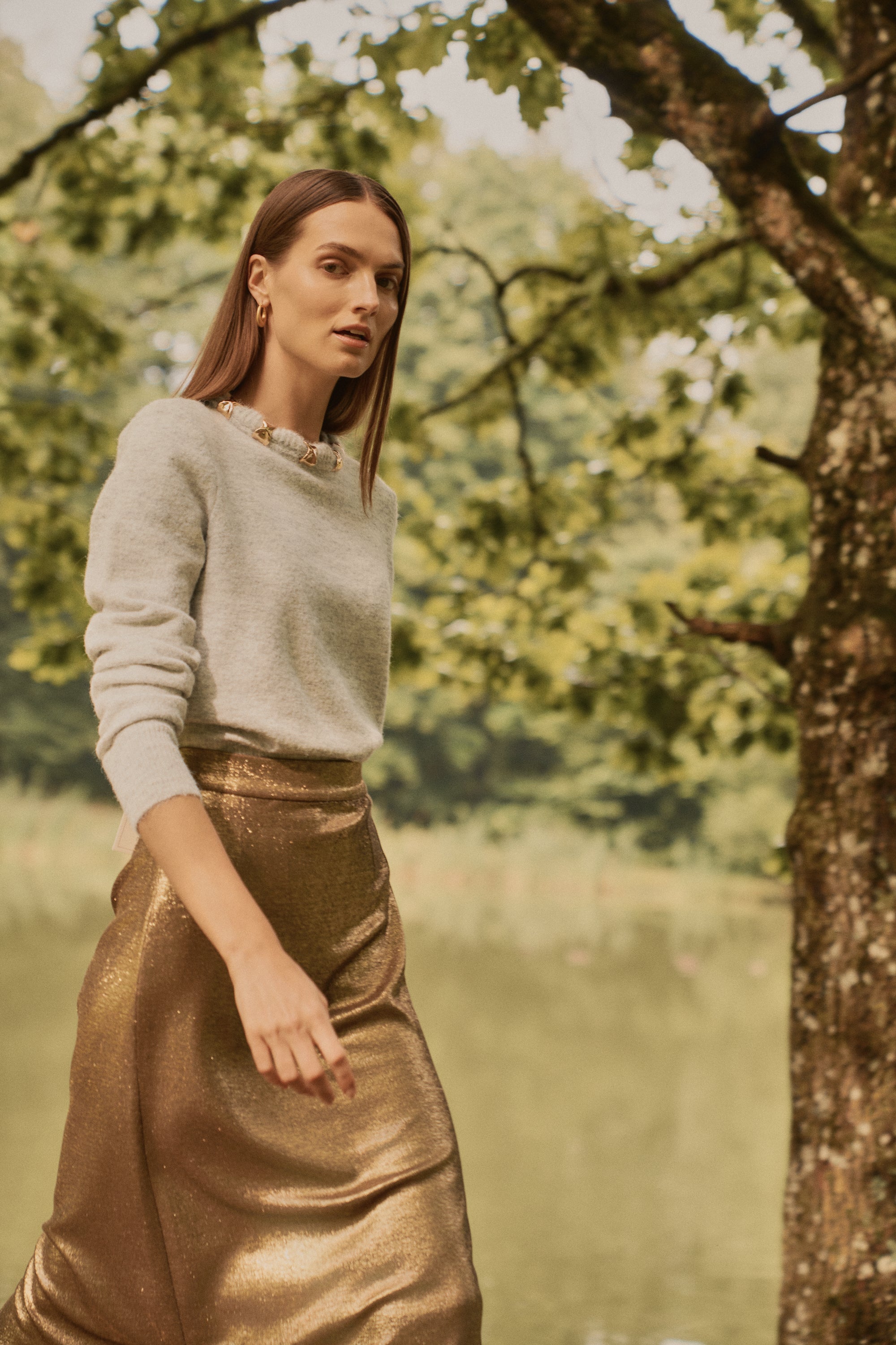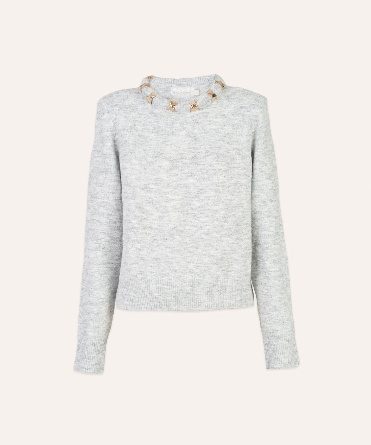 Una prenda con carácter y feminidad. Este jersey de punto en tono rosa intenso destaca por su cuello joya, un detalle artesanal que combina aplicaciones metálicas doradas sobre el cuello, convirtiendo una silueta clásica en una pieza especial.