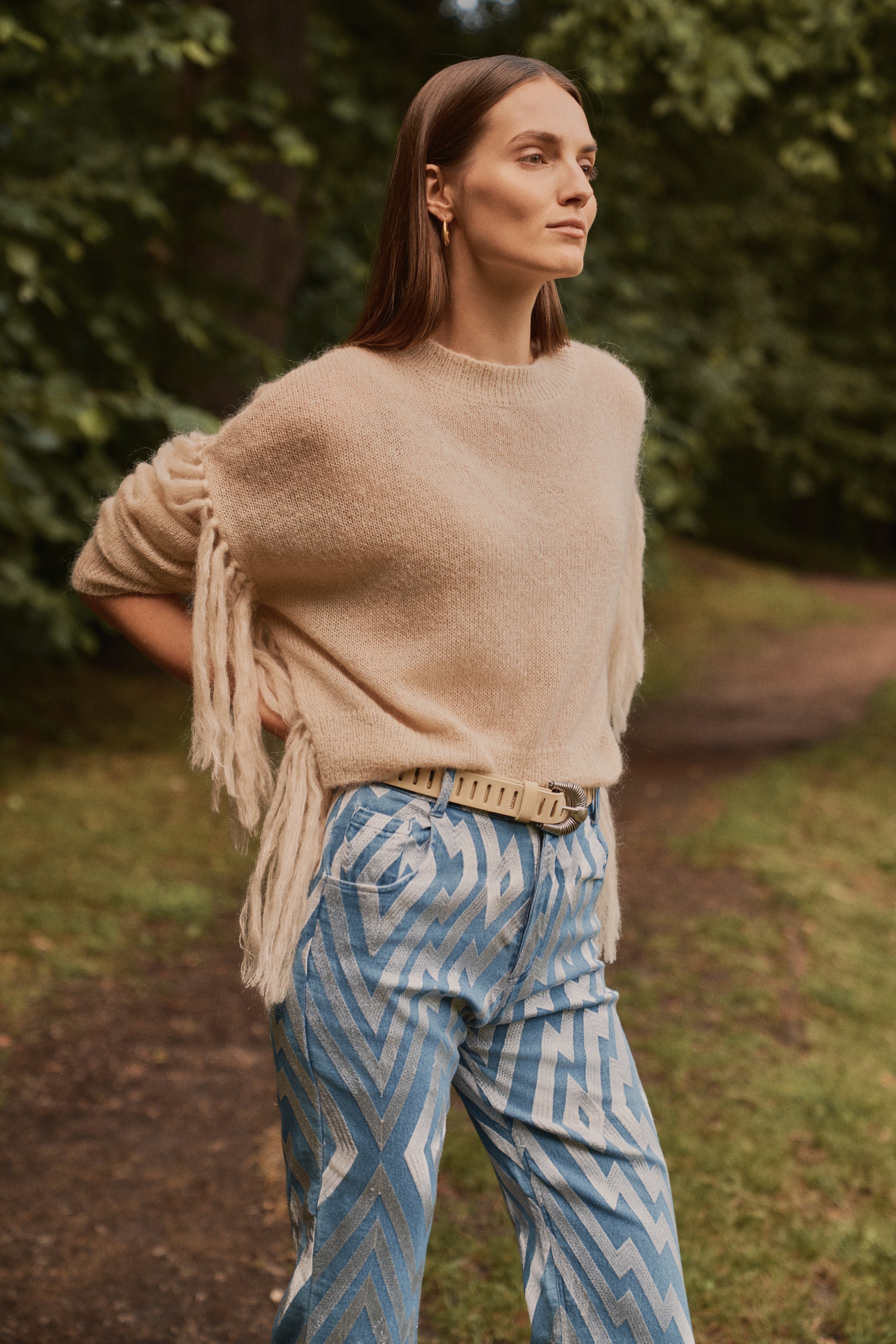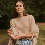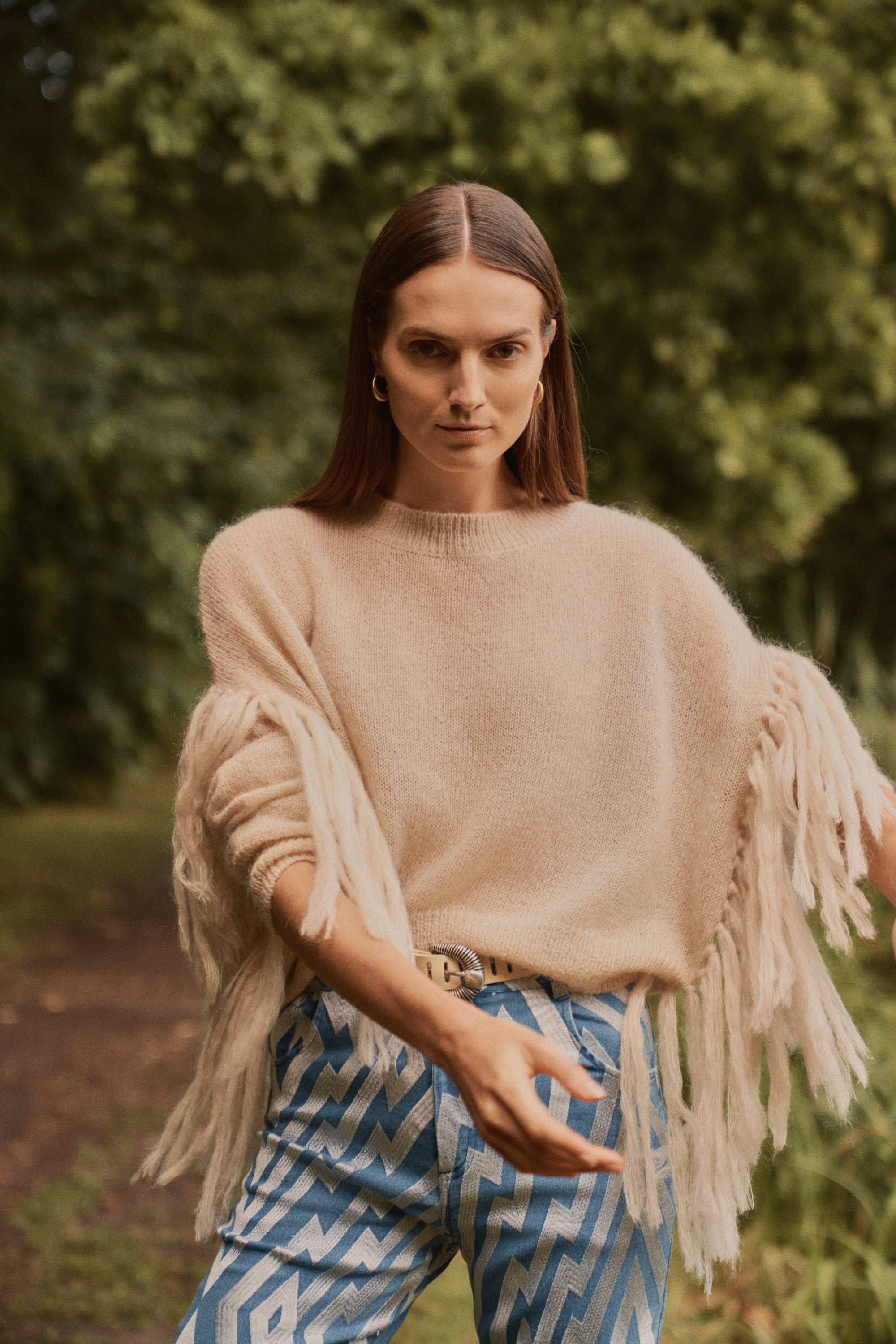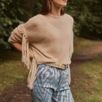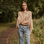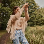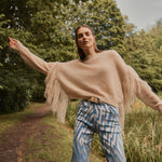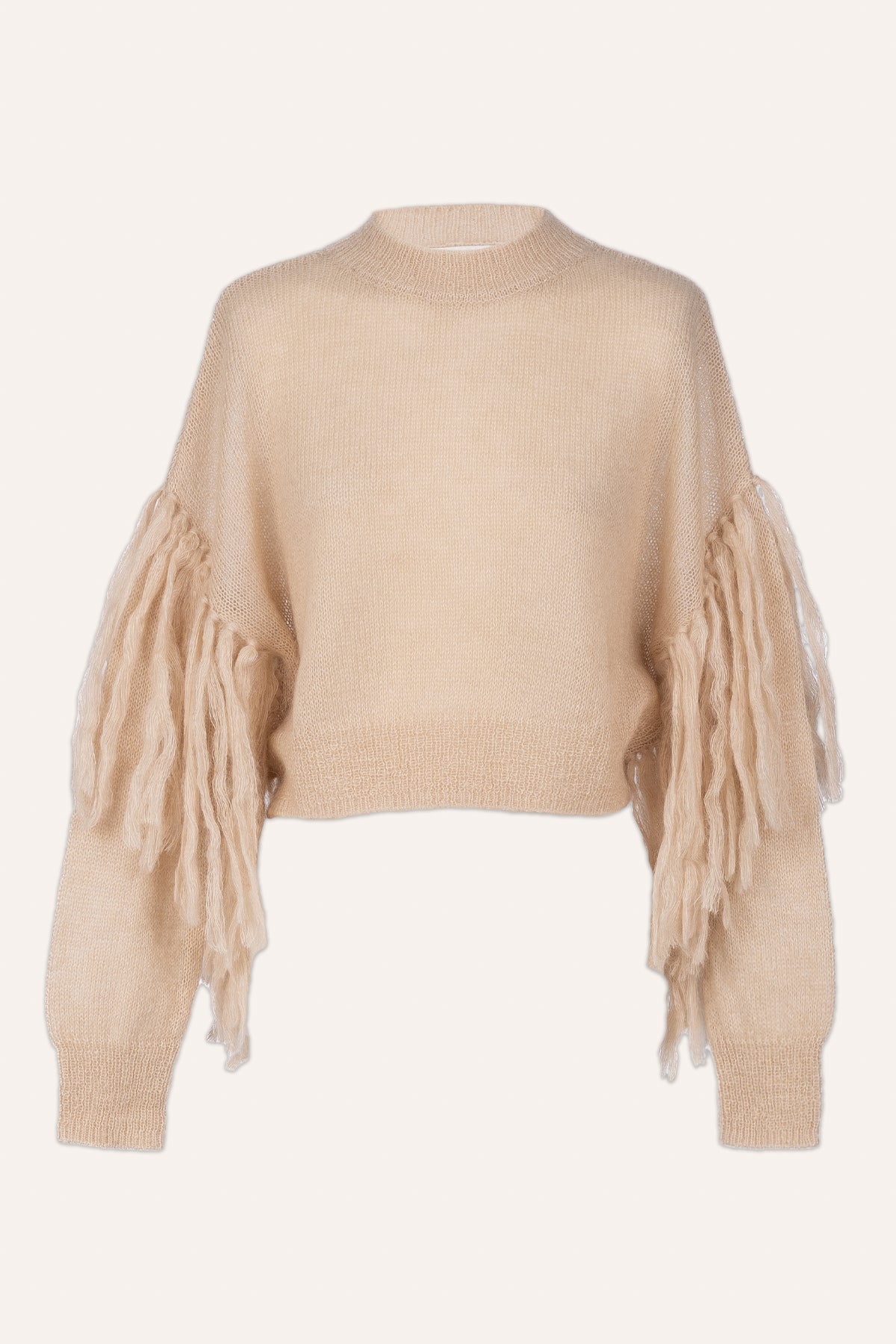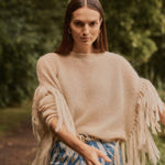 Jersey de mohair semitransparente con flecos en las mangas, el equilibrio perfecto entre la calidez y la ligereza en una prenda de estilo boho relajado.