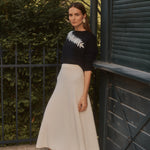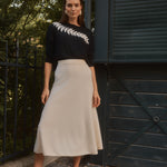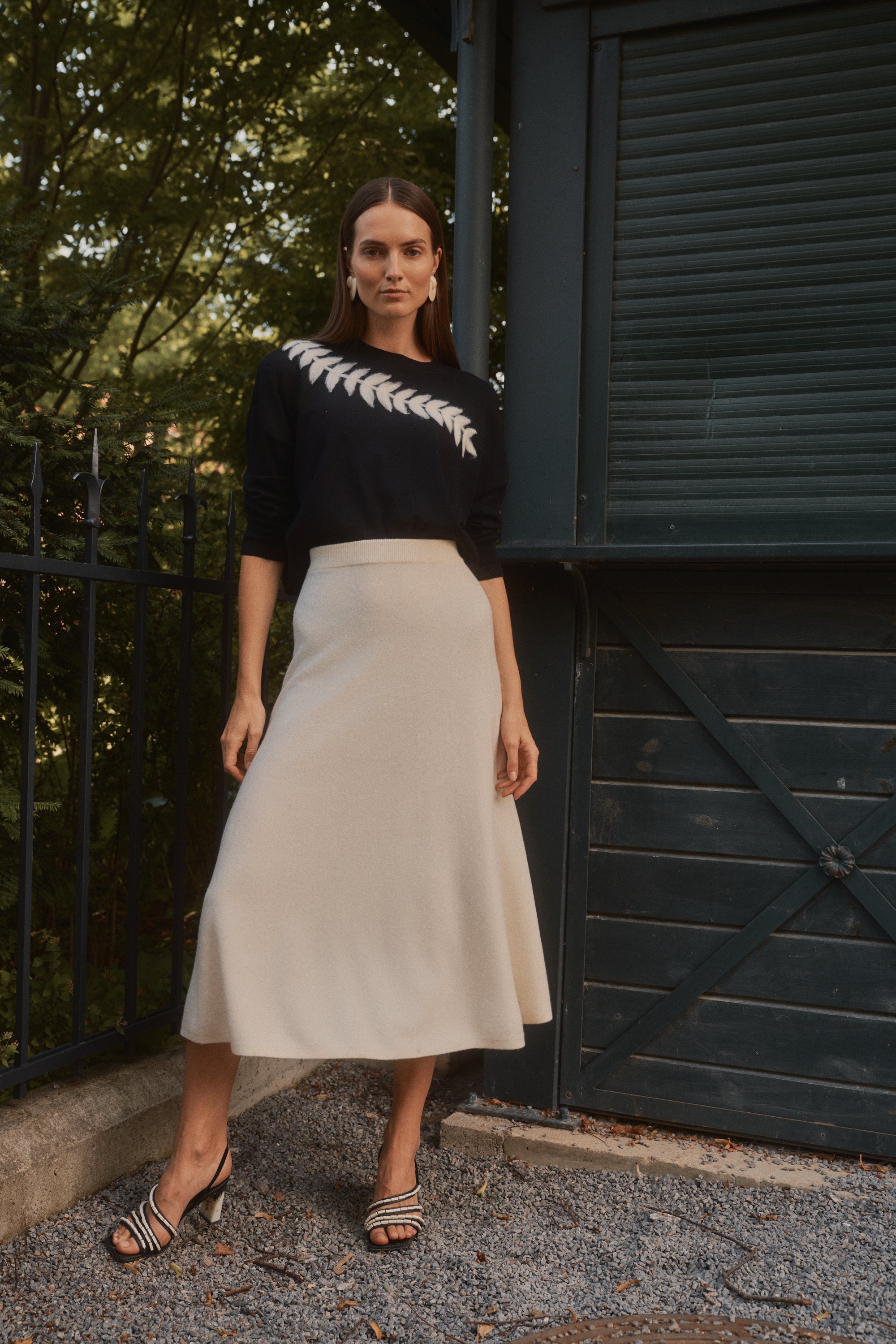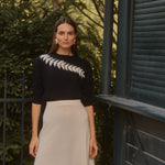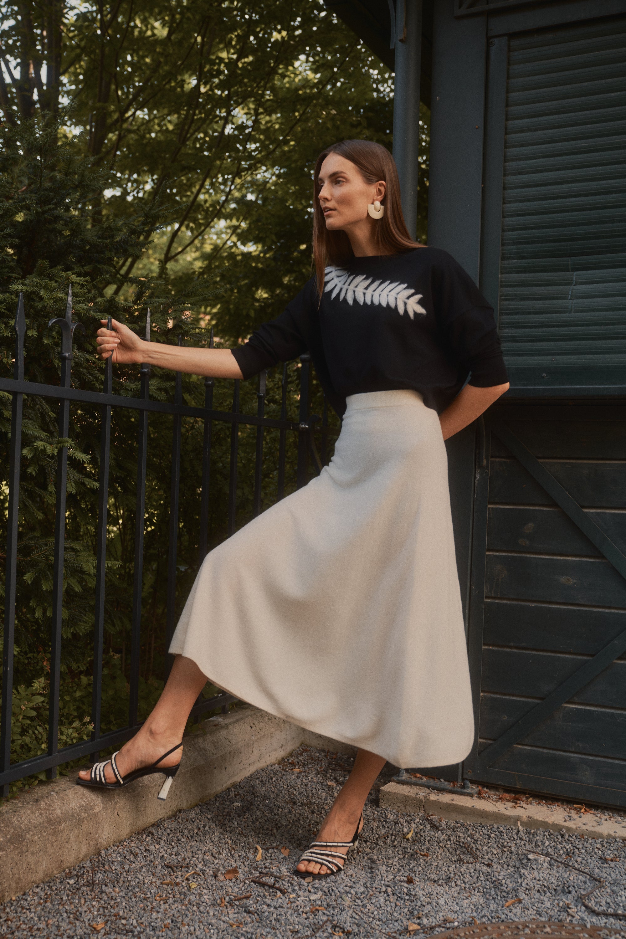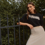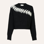 Este jersey negro de punto se distingue por su diseño artístico de hoja blanca tejida en diagonal, que aporta movimiento y carácter a una silueta clásica.