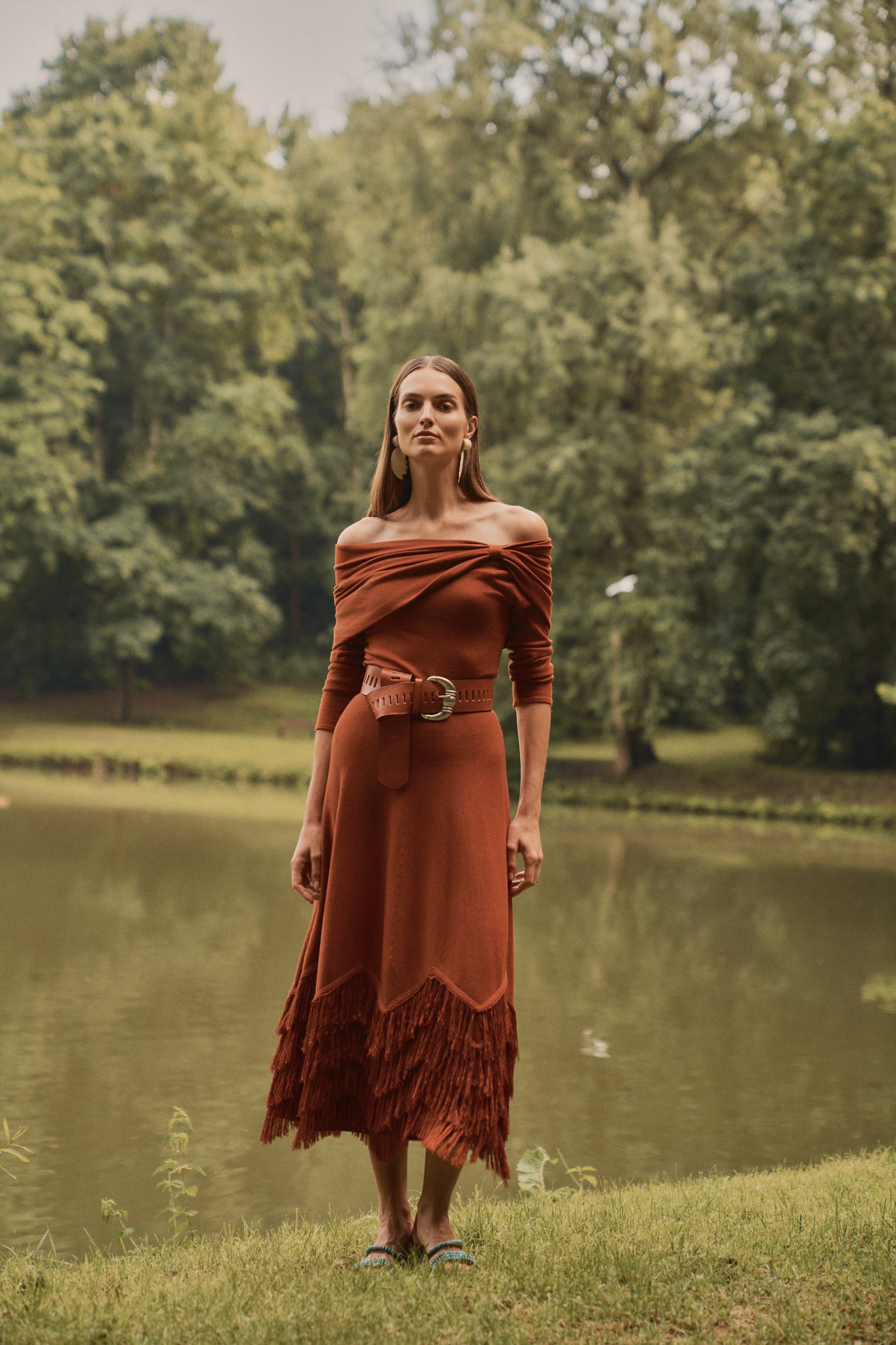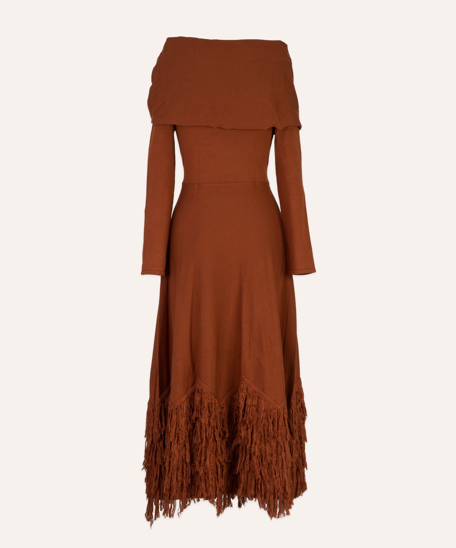 La falda evasé termina en varias cenefas de flecos dispuestos en zigzag, hechos a mano, que aportan textura y dinamismo al diseño.