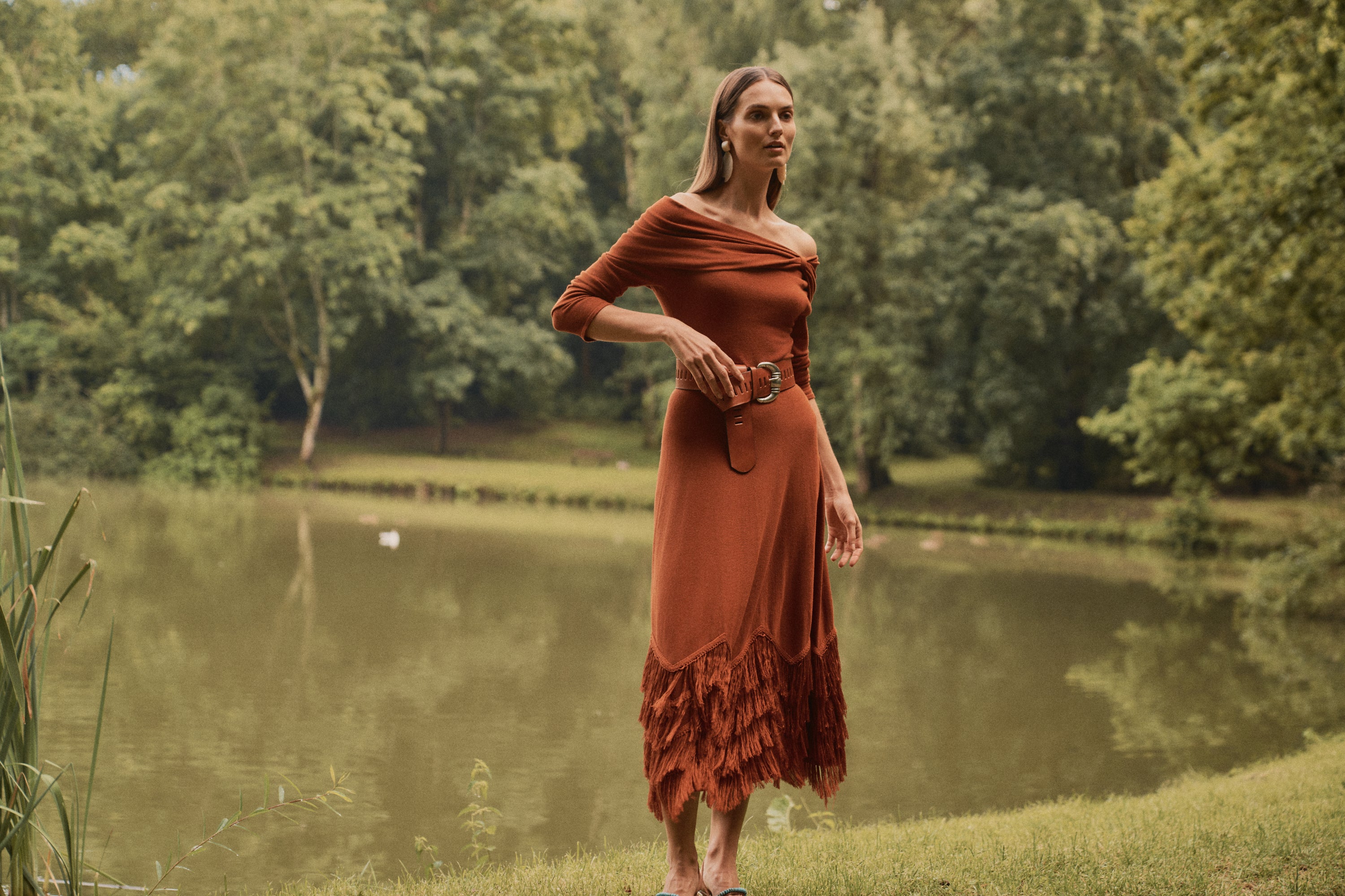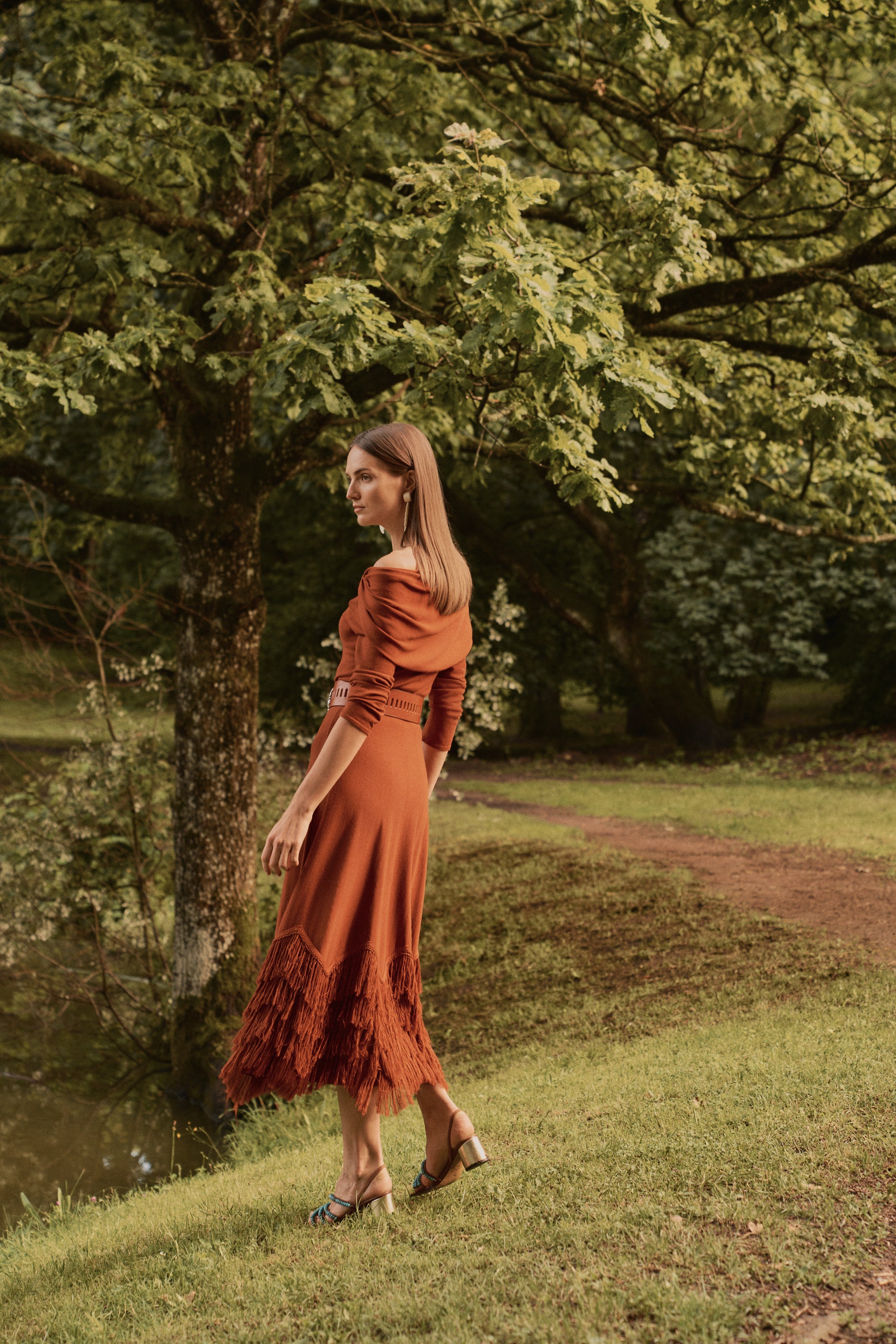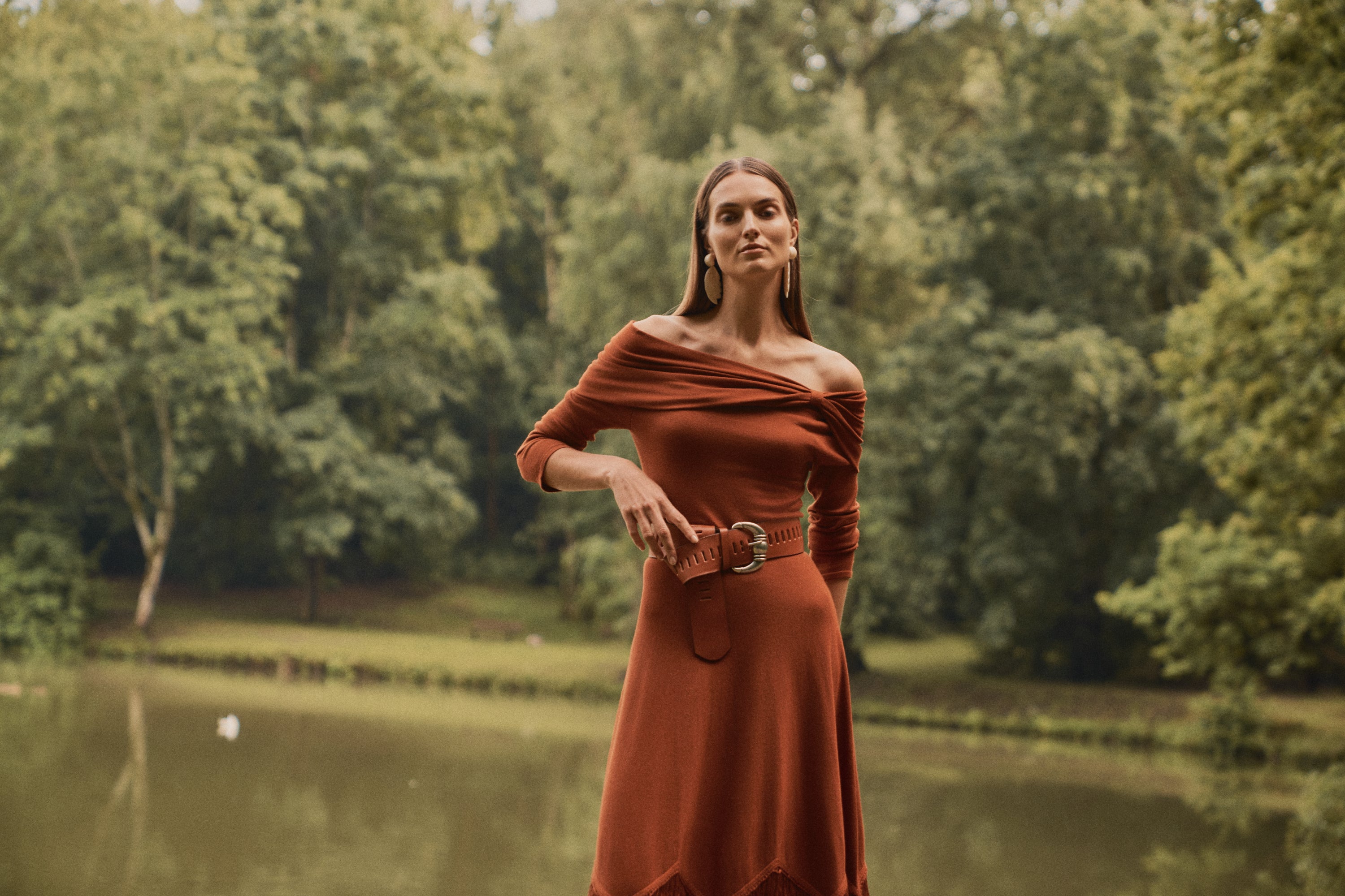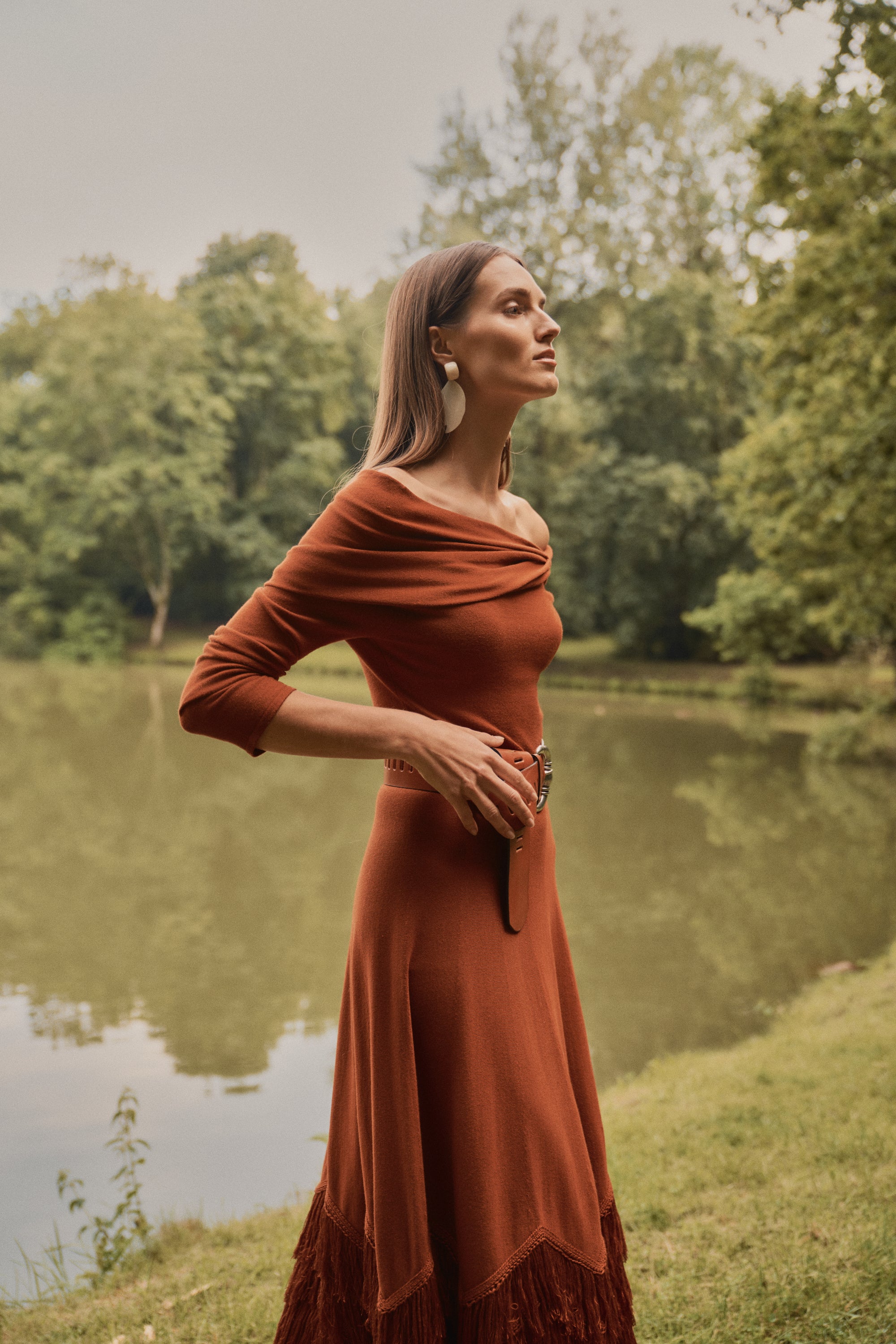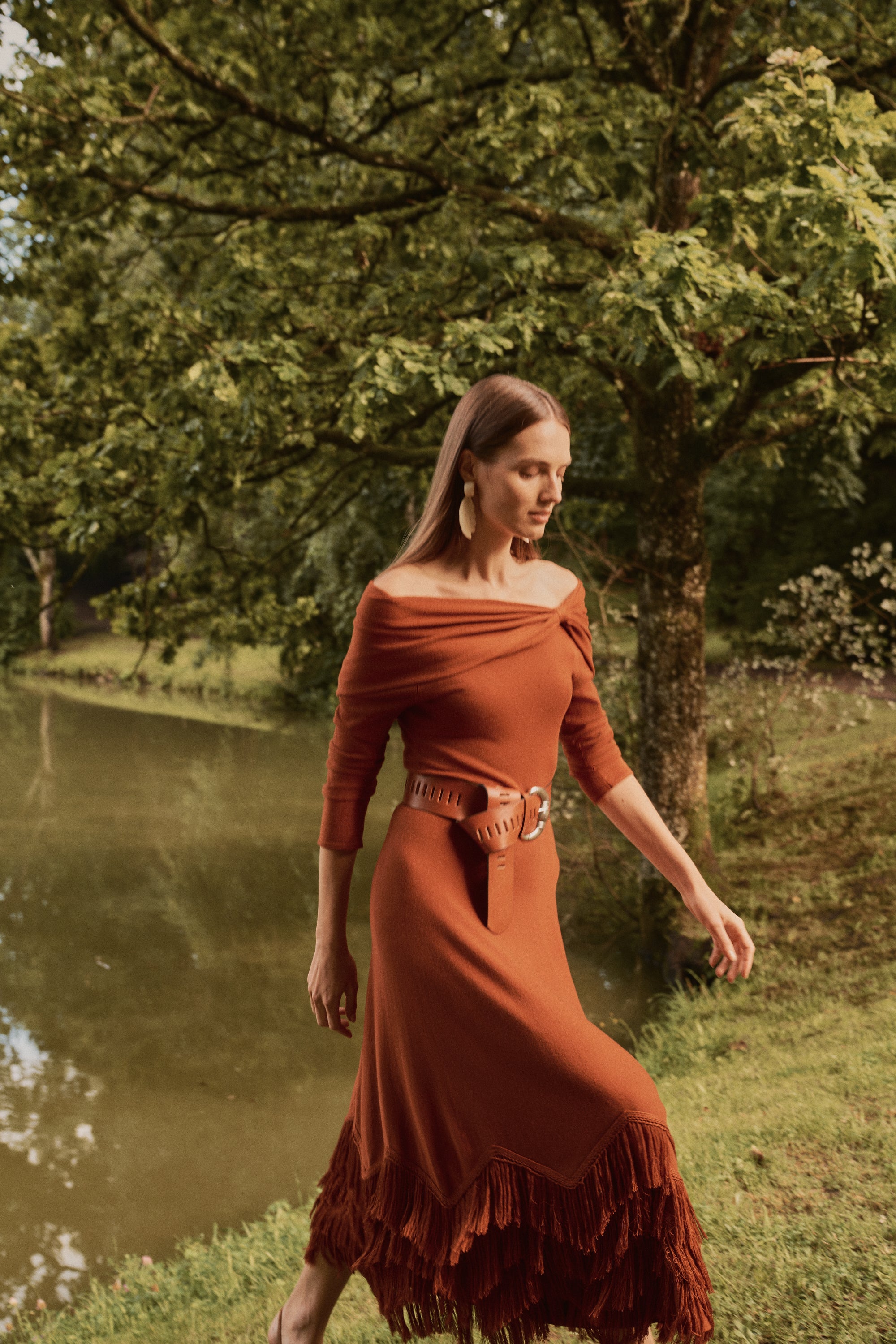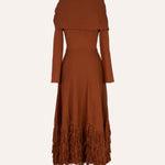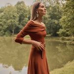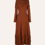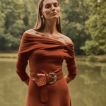 Vestido midi confeccionado en punto de viscosa en tono calabaza, con una espectacular caída y movimiento.