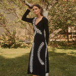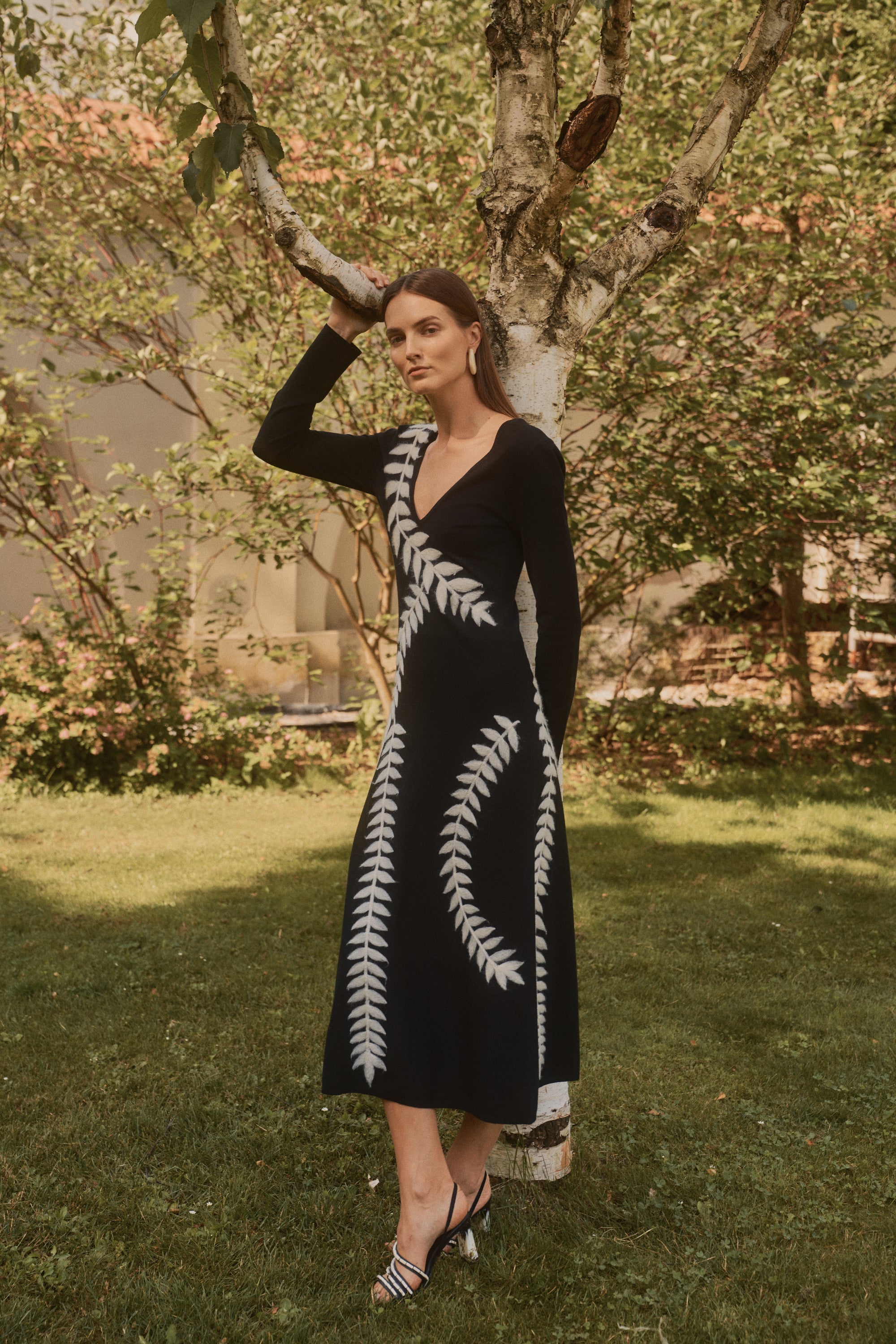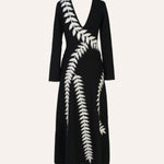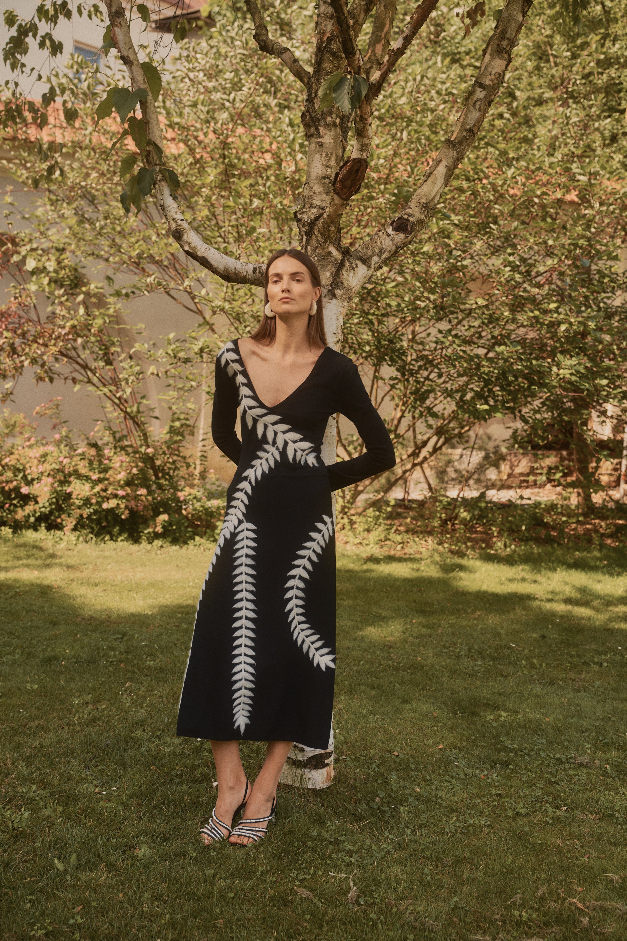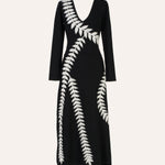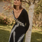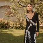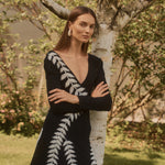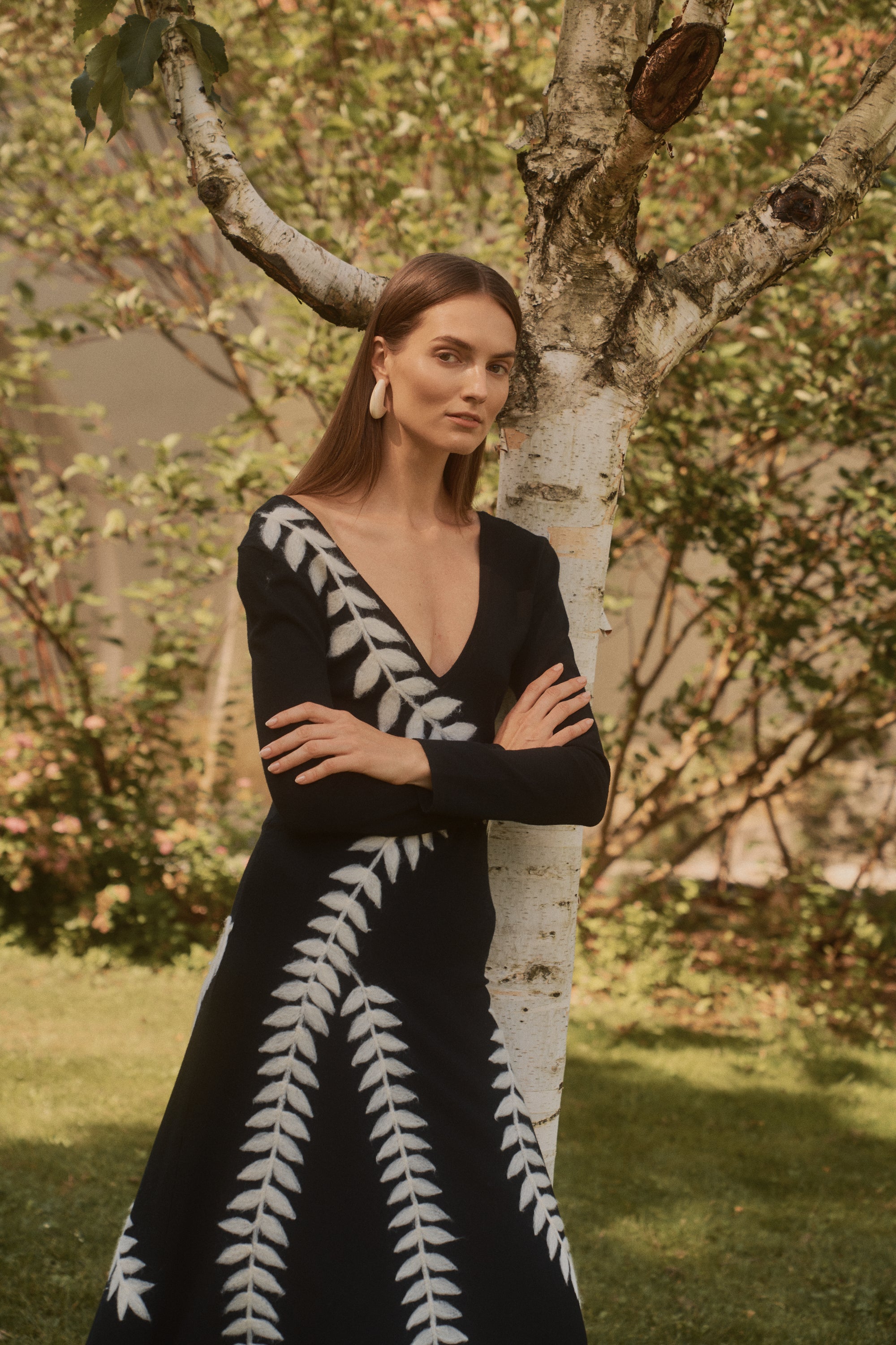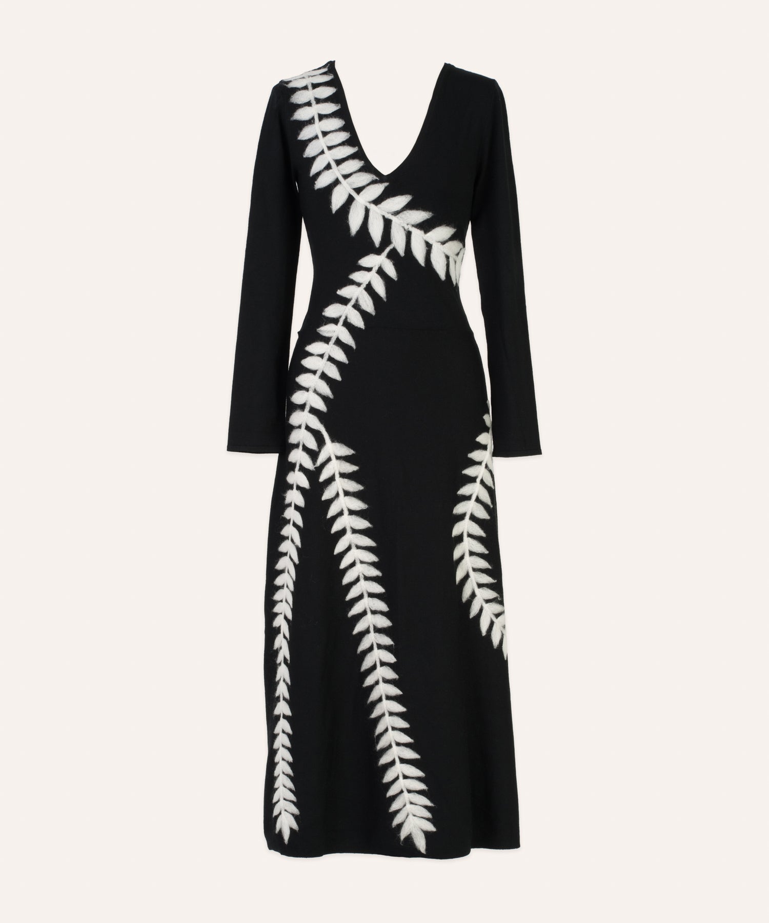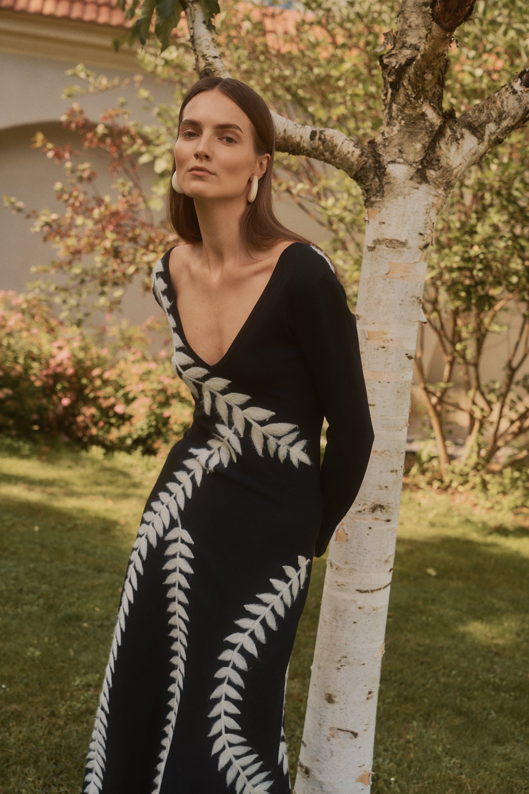 Este vestido de punto en tono negro profundo se convierte en un lienzo perfecto para el bordado hecho a mano de hojas blancas que se entrelazan a lo largo de la silueta, evocando la naturaleza con sutileza y fuerza.