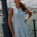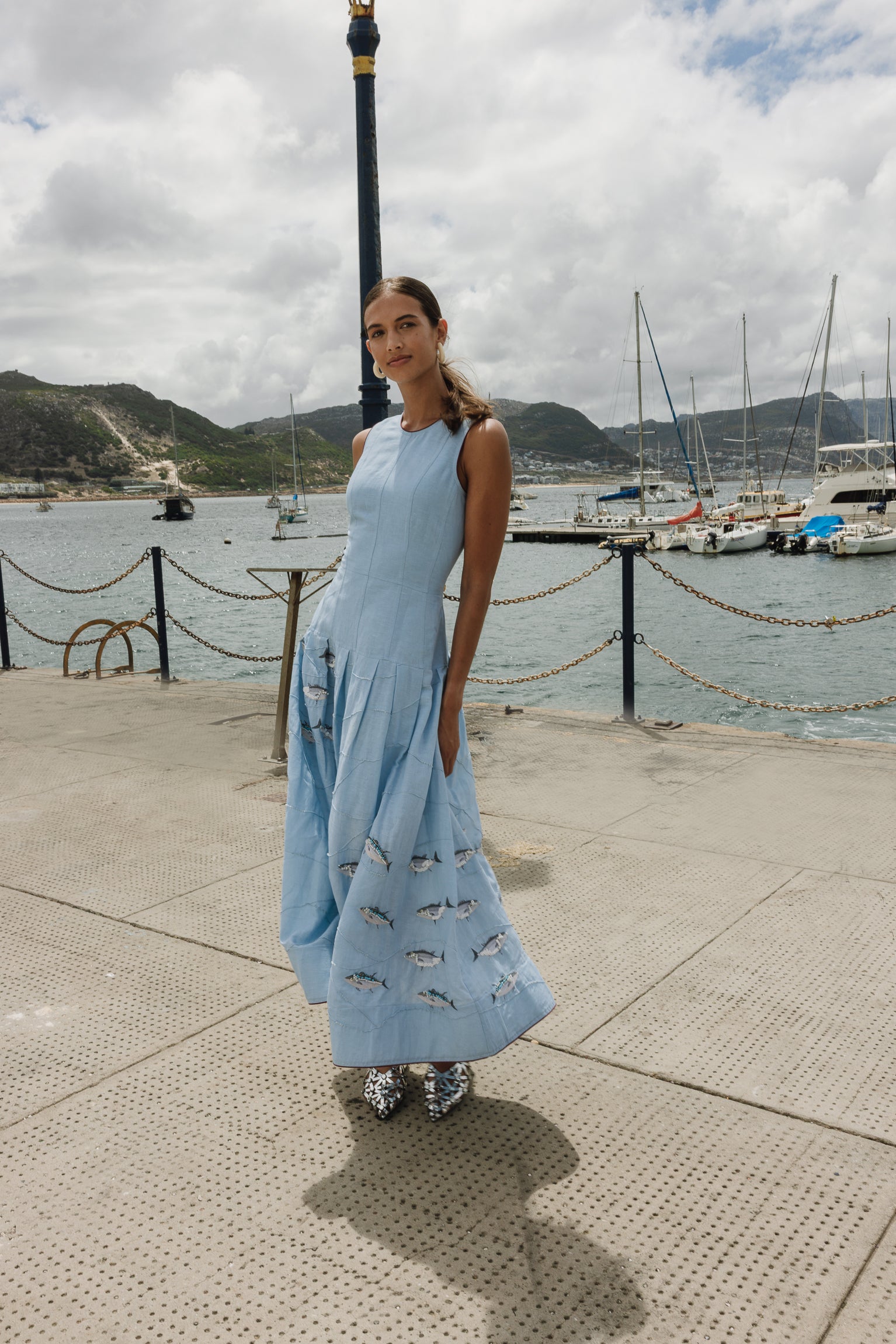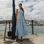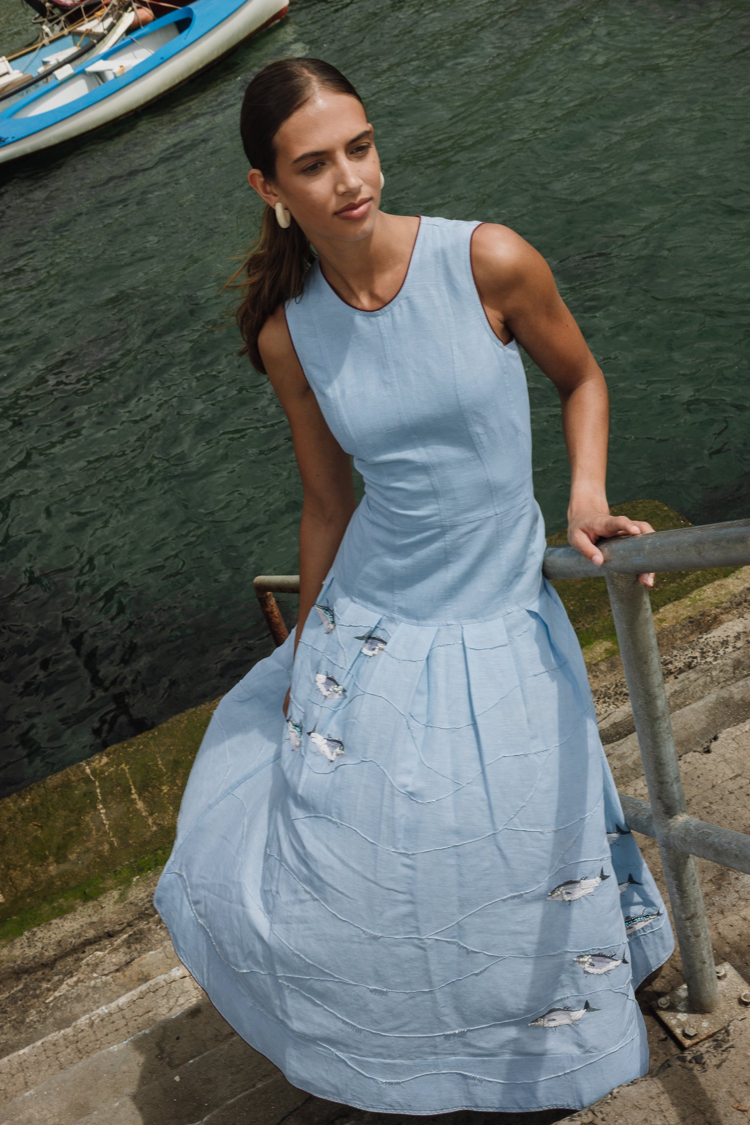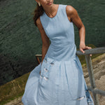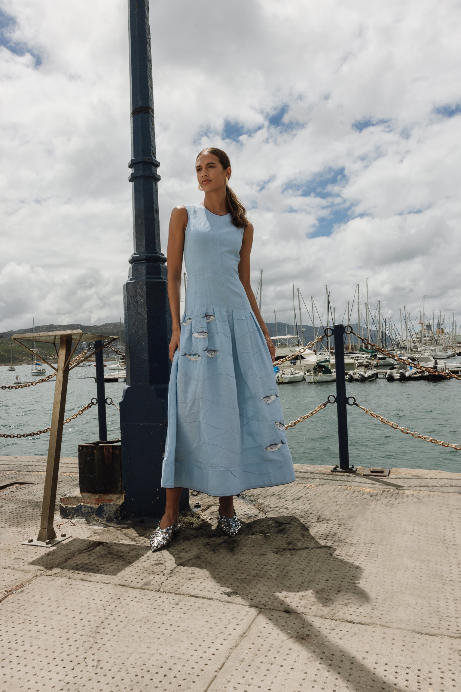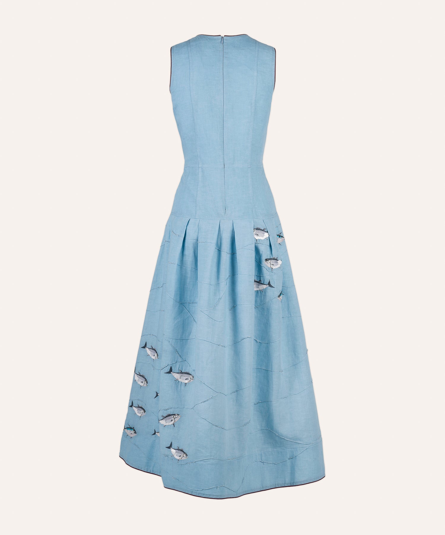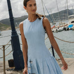Vestido de lino en color azul celeste con un diseño de paneles verticales que ciñen la silueta hasta la cadera, donde se abre en una falda fluida con pliegues que aportan movimiento sereno del lino.