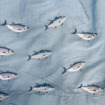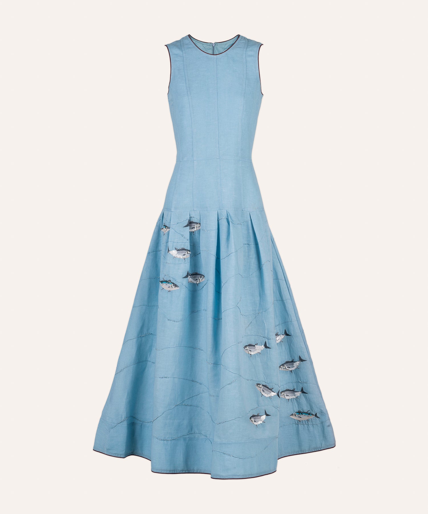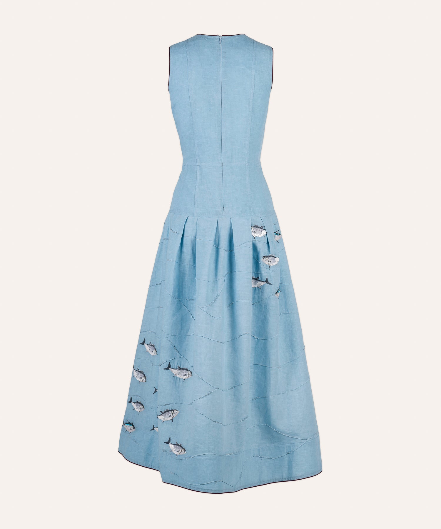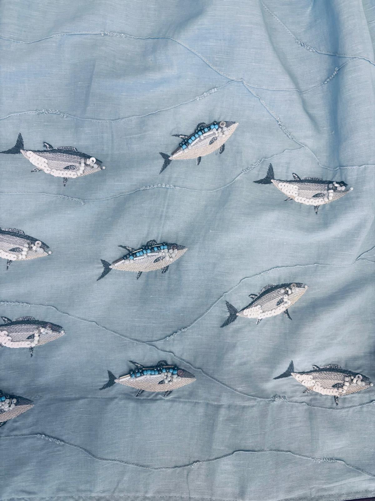 Un delicado trabajo artesanal de peces bordados a mano con pedrería y cristales transparentes que evocando el brillo del agua sobre las olas simuladas en el tejido.